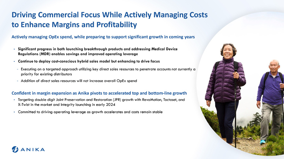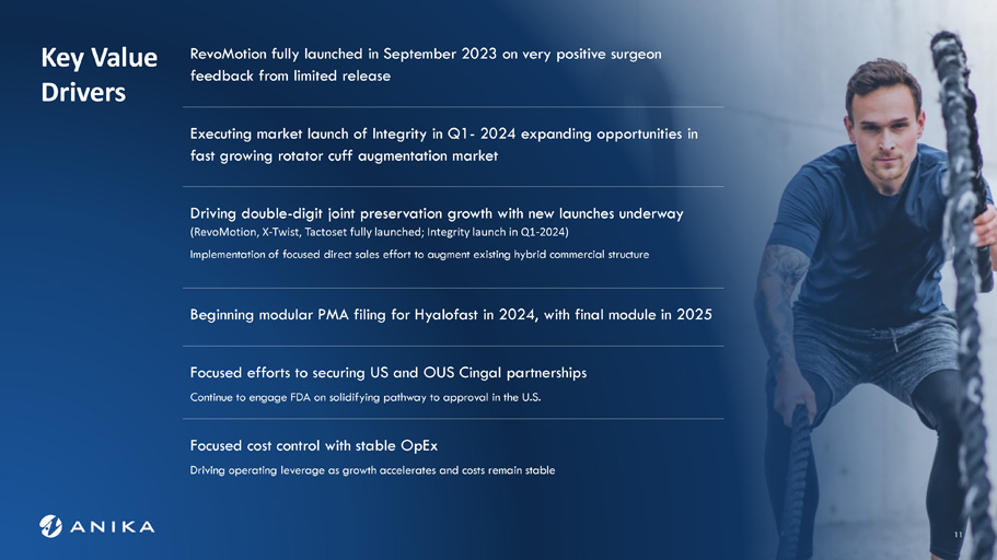 Driving Commercial Focus While Actively Managing Costs to Enhance Margins and Profitability Actively managing OpEx spend, while preparing to support significant growth in coming years • Significant progress in both launching breakthrough products and addressing Medical Device Regulations (MDR) enables savings and improved operating leverage • Continue to deploy cost - conscious hybrid sales model but enhancing to drive focus - Executing on a targeted approach utilizing key direct sales resources to penetrate accounts not currently a priority for existing distributors - Addition of direct sales resources will not increase overall OpEx spend Confident in margin expansion as Anika pivots to accelerated top and bottom - line growth • Targeting double digit Joint Preservation and Restoration (JPR) growth with RevoMotion, Tactoset, and X - Twist in the market and Integrity launching in early 2024 • Committed to driving operating leverage as growth accelerates and costs remain stable 10