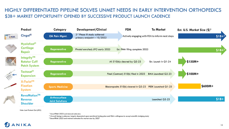 HIGHLY DIFFERENTIATED PIPELINE SOLVES UNMET NEEDS IN EARLY INTERVENTION ORTHOPEDICS $3B+ MARKET OPPORTUNITY OPENED BY SUCCESSIVE PRODUCT LAUNCH CADENCE Note: Last Patient Out (LPO) 1 SmartTRAK 2023 and internal estimates 2 Overall timing is unknown, largely dependent upon nonclinical testing plan and FDA’s willingness to accept scientific bridging study 3 SmartTRAK 2023 and internal estimates for market size by 2027 2 - 23 - 23 1 - 23 1 - 24 Est. U.S. Market Size ($) 1 $1B+ 3 $600M+ $100M+ $150M+ $1B+ To Market FDA Development/Clinical Category Product with FDA to inform nex Actively engaging 3 rd Phase III study achieved primary endpoint – 10/2022 OA Pain Mgmt. Cingal ® 2025 Est. PMA filing complete Pivotal enrolled; LPO early 2025 Regenerative Hyalofast ® Cartilage Repair Est. Launch in Q 0(k)s cleared by Q3 - 23 All 51 Regenerative Integrity TM Rotator Cuff Patch System 023 BMA Launched Q ntrast) 510(k) filed in 2 Final (Co Regenerative Tactoset ® Expansion - 23 PEEK Launched Q ite 510(k) cleared in Q3 Biocompos Sports Medicine X - Twist TM Fixation System Launched Q3 Arthrosurface Joint Solutions RevoMotion TM Reverse Shoulder 13 $1B+ 3 t steps