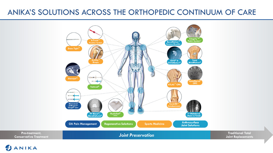 Joint Preservation Pre - treatment, Conservative Treatment Traditional Total Joint Replacements OVO ® & OVOMotion ® Tactoset ® SpeedSpiral ® CMC PF Wave ® / WaveKahuna ® Hyalofast ® (OUS) Total WristMotion ® Monovisc ® Orthovisc ® Cingal ® (OUS) Synd - EZ Œ Syndesmosis 1 st Metatarsal (Hemi & Total) Glenojet ® Draw Tight Œ X - Twist Œ Fixation System Actiflip Œ Biceps RevoMotion Œ Reverse Shoulder OA Pain Management Arthrosurface Joint Solutions Sports Medicine Regenerative Solutions ATLAS Œ CMC ANIKA’S SOLUTIONS ACROSS THE ORTHOPEDIC CONTINUUM OF CARE Integrity Œ Patch System 1