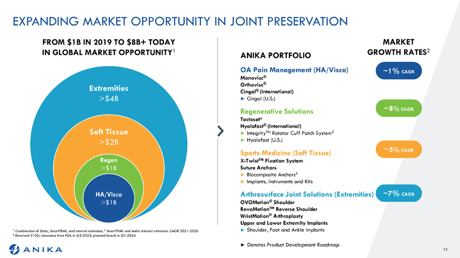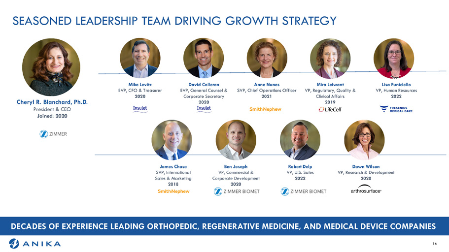 EXPANDING MARKET OPPORTUNITY IN JOINT PRESERVATION 1 Combination of iData, SmartTRAK, and internal estimates; 2 SmartTRAK and Anika internal estimates. CAGR 2021 - 2026 3 Received 510(k) clearance from FDA in Q3 - 2023; planned launch in Q1 - 2024 Extremities >$4B HA/Visco >$1B Regen >$1B Soft Tissue >$2B ANIKA PORTFOLIO OA Pain Management (HA/Visco) Monovisc ® Orthovisc ® Cingal ® (International) ► Cingal (U.S.) Regenerative Solutions Tactoset ® Hyalofast ® (International) ► Integrity TM Rotator Cuff Patch System 3 ► Hyalofast (U.S.) Sports Medicine (Soft Tissue) X. Twist TM Fixation System Suture Anchors ► Biocomposite Anchors 3 ► Implants, Instruments and Kits Arthrosurface Joint Solutions (Extremities) OVOMotion ® Shoulder RevoMotion TM Reverse Shoulder WristMotion ® Arthroplasty Upper and Lower Extremity Implants ► Shoulder, Foot and Ankle Implants ► Denotes Product Development Roadmap MARKET GROWTH RATES 2 FROM $1B IN 2019 TO $8B+ TODAY IN GLOBAL MARKET OPPORTUNITY 1 ~7% CAGR ~1% CAGR ~5 % CAGR ~8 % CAGR 15