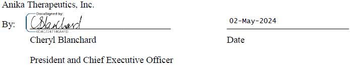 I, hereby acknowledge and certify that I entered into a Transitional Services and Separation Agreement with Anika Therapeutics, Inc. (the “Company”), dated May [], 2024 (the “Agreement”). Capitalized but undefined terms in this Certificate are defined in the Agreement. Pursuant to the Agreement, I am required to sign this “Certificate,” which updates the release of claims in the Agreement, in order to receive the severance benefits described in the Agreement. For this Certificate to become effective and for me to receive such severance benefits, I must sign this Certificate after the Separation Date but no later than seven days after the Separation Date. I will not sign this Certificate before the Separation Date. Subject to the foregoing, the date I sign this Certificate is the “Certificate Effective Date.” I further agree as follows: