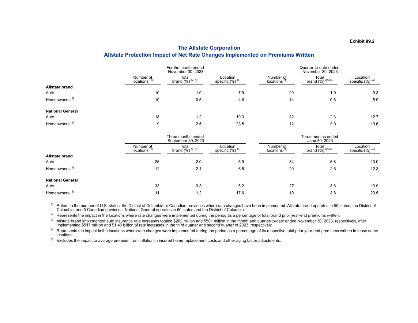 Exhibit 99.2 The Allstate Corporation Allstate Protection Impact of Net Rate Changes Implemented on Premiums Written For the month ended November 30, 2023 Quarter-to-date ended November 30, 2023 Number of locations (1) Total brand (%) (2) (3) Location specific (%) (4) Number of locations (1) Total brand (%) (2) (3) Location specific (%) (4) Allstate brand Auto 10 1.0 7.9 20 1.9 9.3 Homeowners (5) 10 0.5 4.6 14 0.6 5.9 National General Auto 18 1.2 19.3 32 2.3 12.7 Homeowners (5) 9 2.5 23.5 12 3.9 19.6 Three months ended September 30, 2023 Three months ended June 30, 2023 Number of locations (1) Total brand (%) (2) (3) Location specific (%) (4) Number of locations (1) Total brand (%) (2) (3) Location specific (%) (4) Allstate brand Auto 25 2.0 5.9 34 5.8 10.0 Homeowners (5) 12 2.1 6.5 20 2.5 12.3 National General Auto 33 3.3 6.2 27 3.6 13.9 Homeowners (5) 11 1.2 17.6 10 3.8 23.5 (1) Refers to the number of U.S. states, the District of Columbia or Canadian provinces where rate changes have been implemented. Allstate brand operates in 50 states, the District of Columbia, and 5 Canadian provinces. National General operates in 50 states and the District of Columbia. (2) Represents the impact in the locations where rate changes were implemented during the period as a percentage of total brand prior year-end premiums written. (3) Allstate brand implemented auto insurance rate increases totaled $262 million and $501 million in the month and quarter-to-date ended November 30, 2023, respectively, after implementing $517 million and $1.49 billion of rate increases in the third quarter and second quarter of 2023, respectively. (4) Represents the impact in the locations where rate changes were implemented during the period as a percentage of its respective total prior year-end premiums written in those same locations. (5) Excludes the impact to average premium from inflation in insured home replacement costs and other aging factor adjustments.
