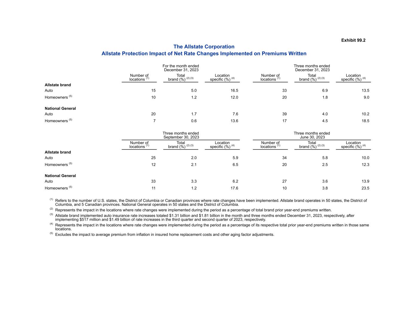 Exhibit 99.2 The Allstate Corporation Allstate Protection Impact of Net Rate Changes Implemented on Premiums Written For the month ended December 31, 2023 Three months ended December 31, 2023 Number of locations (1) Total brand (%) (2) (3) Location specific (%) (4) Number of locations (1) Total brand (%) (2) (3) Location specific (%) (4) Allstate brand Auto 15 5.0 16.5 33 6.9 13.5 Homeowners (5) 10 1.2 12.0 20 1.8 9.0 National General Auto 20 1.7 7.6 39 4.0 10.2 Homeowners (5) 7 0.6 13.6 17 4.5 18.5 Three months ended September 30, 2023 Three months ended June 30, 2023 Number of locations (1) Total brand (%) (2) (3) Location specific (%) (4) Number of locations (1) Total brand (%) (2) (3) Location specific (%) (4) Allstate brand Auto 25 2.0 5.9 34 5.8 10.0 Homeowners (5) 12 2.1 6.5 20 2.5 12.3 National General Auto 33 3.3 6.2 27 3.6 13.9 Homeowners (5) 11 1.2 17.6 10 3.8 23.5 (1) Refers to the number of U.S. states, the District of Columbia or Canadian provinces where rate changes have been implemented. Allstate brand operates in 50 states, the District of Columbia, and 5 Canadian provinces. National General operates in 50 states and the District of Columbia. (2) Represents the impact in the locations where rate changes were implemented during the period as a percentage of total brand prior year-end premiums written. (3) Allstate brand implemented auto insurance rate increases totaled $1.31 billion and $1.81 billion in the month and three months ended December 31, 2023, respectively, after implementing $517 million and $1.49 billion of rate increases in the third quarter and second quarter of 2023, respectively. (4) Represents the impact in the locations where rate changes were implemented during the period as a percentage of its respective total prior year-end premiums written in those same locations. (5) Excludes the impact to average premium from inflation in insured home replacement costs and other aging factor adjustments.