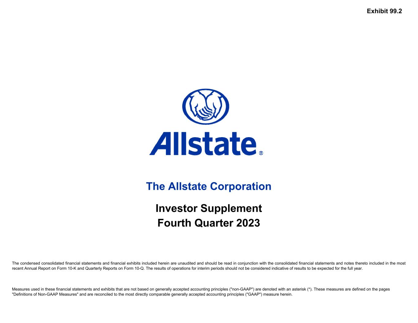 Investor Supplement Fourth Quarter 2023 The condensed consolidated financial statements and financial exhibits included herein are unaudited and should be read in conjunction with the consolidated financial statements and notes thereto included in the most recent Annual Report on Form 10-K and Quarterly Reports on Form 10-Q. The results of operations for interim periods should not be considered indicative of results to be expected for the full year. Measures used in these financial statements and exhibits that are not based on generally accepted accounting principles ("non-GAAP") are denoted with an asterisk (*). These measures are defined on the pages "Definitions of Non-GAAP Measures" and are reconciled to the most directly comparable generally accepted accounting principles ("GAAP") measure herein. The Allstate Corporation