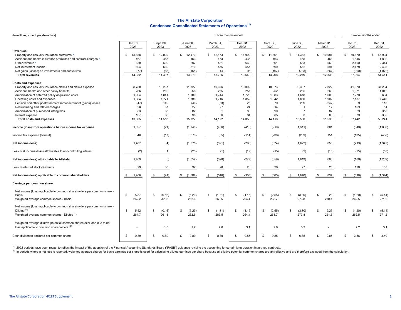 Dec. 31, 2023 Sept. 30, 2023 June 30, 2023 March 31, 2023 Dec. 31, 2022 Sept. 30, 2022 June 30, 2022 March 31, 2022 Dec. 31, 2023 Dec. 31, 2022 13,188$ 12,839$ 12,470$ 12,173$ 11,900$ 11,661$ 11,362$ 10,981$ 50,670$ 45,904$ 467 463 453 463 436 463 465 468 1,846 1,832 650 592 597 561 660 561 563 560 2,400 2,344 604 689 610 575 557 690 562 594 2,478 2,403 (77) (86) (151) 14 95 (167) (733) (267) (300) (1,072) 14,832 14,497 13,979 13,786 13,648 13,208 12,219 12,336 57,094 51,411 8,780 10,237 11,727 10,326 10,002 10,073 9,367 7,822 41,070 37,264 286 262 258 265 257 252 265 268 1,071 1,042 1,904 1,841 1,789 1,744 1,725 1,683 1,618 1,608 7,278 6,634 1,864 1,771 1,786 1,716 1,852 1,842 1,850 1,902 7,137 7,446 (47) 149 (40) (53) 25 79 259 (247) 9 116 28 87 27 27 24 14 1 12 169 51 83 83 82 81 89 90 87 87 329 353 107 88 98 86 84 85 83 83 379 335 13,005 14,518 15,727 14,192 14,058 14,118 13,530 11,535 57,442 53,241 1,827 (21) (1,748) (406) (410) (910) (1,311) 801 (348) (1,830) 340 (17) (373) (85) (114) (236) (289) 151 (135) (488) 1,487 (4) (1,375) (321) (296) (674) (1,022) 650 (213) (1,342) (2) 1 (23) (1) (19) (15) (9) (10) (25) (53) 1,489 (5) (1,352) (320) (277) (659) (1,013) 660 (188) (1,289) 29 36 37 26 26 26 27 26 128 105 1,460$ (41)$ (1,389)$ (346)$ (303)$ (685)$ (1,040)$ 634$ (316)$ (1,394)$ 5.57$ (0.16)$ (5.29)$ (1.31)$ (1.15)$ (2.55)$ (3.80)$ 2.28$ (1.20)$ (5.14)$ 262.2 261.8 262.6 263.5 264.4 268.7 273.8 278.1 262.5 271.2 5.52$ (0.16)$ (5.29)$ (1.31)$ (1.15)$ (2.55)$ (3.80)$ 2.25$ (1.20)$ (5.14)$ 264.7 261.8 262.6 263.5 264.4 268.7 273.8 281.8 262.5 271.2 - 1.5 1.7 2.6 3.1 2.9 3.2 - 2.2 3.1 0.89$ 0.89$ 0.89$ 0.89$ 0.85$ 0.85$ 0.85$ 0.85$ 3.56$ 3.40$ (1) (2) Weighted average common shares - Diluted (2) Weighted average dilutive potential common shares excluded due to net loss applicable to common shareholders (2) Cash dividends declared per common share Net income (loss) applicable to common shareholders per common share - Basic Weighted average common shares - Basic Net income (loss) applicable to common shareholders per common share - Diluted (2) Twelve months ended In periods where a net loss is reported, weighted average shares for basic earnings per share is used for calculating diluted earnings per share because all dilutive potential common shares are anti-dilutive and are therefore excluded from the calculation. 2022 periods have been recast to reflect the impact of the adoption of the Financial Accounting Standards Board ("FASB") guidance revising the accounting for certain long-duration insurance contracts. Net income (loss) Less: Net income (loss) attributable to noncontrolling interest Net income (loss) attributable to Allstate Less: Preferred stock dividends Net income (loss) applicable to common shareholders Earnings per common share Total costs and expenses Income (loss) from operations before income tax expense Income tax expense (benefit) Pension and other postretirement remeasurement (gains) losses Restructuring and related charges Amortization of purchased intangibles Interest expense Costs and expenses Property and casualty insurance claims and claims expense Accident, health and other policy benefits Amortization of deferred policy acquisition costs Operating costs and expenses Accident and health insurance premiums and contract charges ^ Other revenue ^ Net investment income Net gains (losses) on investments and derivatives Total revenues (In millions, except per share data) Revenues Property and casualty insurance premiums ^ The Allstate Corporation Condensed Consolidated Statements of Operations (1) Three months ended The Allstate Corporation 4Q23 Supplement 1