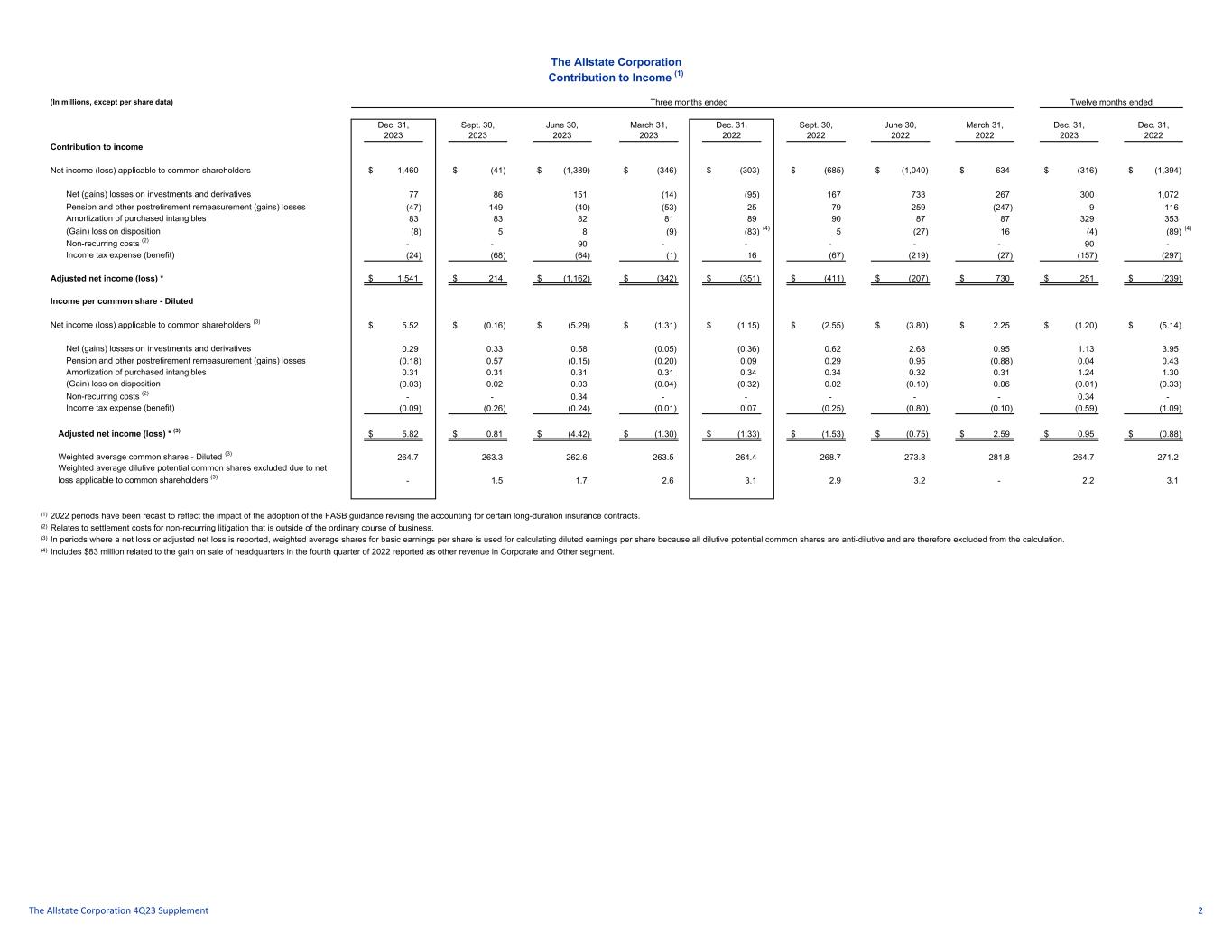 (In millions, except per share data) Dec. 31, 2023 Sept. 30, 2023 June 30, 2023 March 31, 2023 Dec. 31, 2022 Sept. 30, 2022 June 30, 2022 March 31, 2022 Dec. 31, 2023 Dec. 31, 2022 Contribution to income 1,460$ (41)$ (1,389)$ (346)$ (303)$ (685)$ (1,040)$ 634$ (316)$ (1,394)$ Net (gains) losses on investments and derivatives 77 86 151 (14) (95) 167 733 267 300 1,072 Pension and other postretirement remeasurement (gains) losses (47) 149 (40) (53) 25 79 259 (247) 9 116 Amortization of purchased intangibles 83 83 82 81 89 90 87 87 329 353 (Gain) loss on disposition (8) 5 8 (9) (83) (4) 5 (27) 16 (4) (89) (4) Non-recurring costs (2) - - 90 - - - - - 90 - Income tax expense (benefit) (24) (68) (64) (1) 16 (67) (219) (27) (157) (297) 1,541$ 214$ (1,162)$ (342)$ (351)$ (411)$ (207)$ 730$ 251$ (239)$ Income per common share - Diluted Net income (loss) applicable to common shareholders (3) 5.52$ (0.16)$ (5.29)$ (1.31)$ (1.15)$ (2.55)$ (3.80)$ 2.25$ (1.20)$ (5.14)$ Net (gains) losses on investments and derivatives 0.29 0.33 0.58 (0.05) (0.36) 0.62 2.68 0.95 1.13 3.95 Pension and other postretirement remeasurement (gains) losses (0.18) 0.57 (0.15) (0.20) 0.09 0.29 0.95 (0.88) 0.04 0.43 Amortization of purchased intangibles 0.31 0.31 0.31 0.31 0.34 0.34 0.32 0.31 1.24 1.30 (Gain) loss on disposition (0.03) 0.02 0.03 (0.04) (0.32) 0.02 (0.10) 0.06 (0.01) (0.33) Non-recurring costs (2) - - 0.34 - - - - - 0.34 - Income tax expense (benefit) (0.09) (0.26) (0.24) (0.01) 0.07 (0.25) (0.80) (0.10) (0.59) (1.09) Adjusted net income (loss) * (3) 5.82$ 0.81$ (4.42)$ (1.30)$ (1.33)$ (1.53)$ (0.75)$ 2.59$ 0.95$ (0.88)$ Weighted average common shares - Diluted (3) 264.7 263.3 262.6 263.5 264.4 268.7 273.8 281.8 264.7 271.2 Weighted average dilutive potential common shares excluded due to net loss applicable to common shareholders (3) - 1.5 1.7 2.6 3.1 2.9 3.2 - 2.2 3.1 (1) (2) (3) (4) Includes $83 million related to the gain on sale of headquarters in the fourth quarter of 2022 reported as other revenue in Corporate and Other segment. Three months ended Net income (loss) applicable to common shareholders Adjusted net income (loss) * In periods where a net loss or adjusted net loss is reported, weighted average shares for basic earnings per share is used for calculating diluted earnings per share because all dilutive potential common shares are anti-dilutive and are therefore excluded from the calculation. Contribution to Income (1) The Allstate Corporation Twelve months ended 2022 periods have been recast to reflect the impact of the adoption of the FASB guidance revising the accounting for certain long-duration insurance contracts. Relates to settlement costs for non-recurring litigation that is outside of the ordinary course of business. The Allstate Corporation 4Q23 Supplement 2