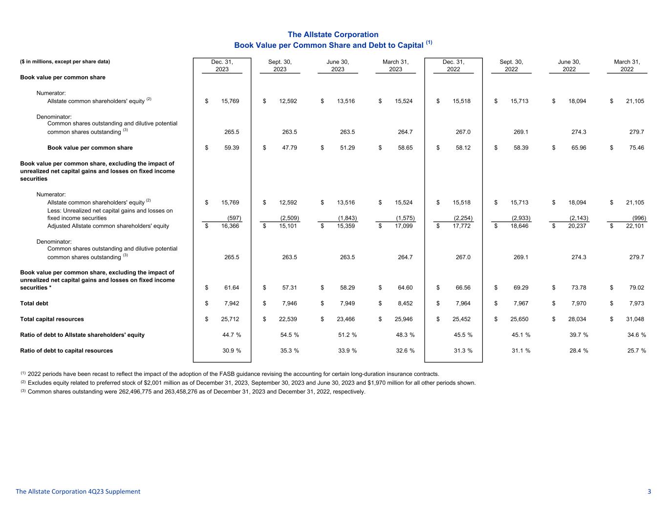 Dec. 31, 2023 Sept. 30, 2023 June 30, 2023 March 31, 2023 Dec. 31, 2022 Sept. 30, 2022 June 30, 2022 March 31, 2022 15,769$ 12,592$ 13,516$ 15,524$ 15,518$ 15,713$ 18,094$ 21,105$ 265.5 263.5 263.5 264.7 267.0 269.1 274.3 279.7 59.39$ 47.79$ 51.29$ 58.65$ 58.12$ 58.39$ 65.96$ 75.46$ 15,769$ 12,592$ 13,516$ 15,524$ 15,518$ 15,713$ 18,094$ 21,105$ (597) (2,509) (1,843) (1,575) (2,254) (2,933) (2,143) (996) 16,366$ 15,101$ 15,359$ 17,099$ 17,772$ 18,646$ 20,237$ 22,101$ 265.5 263.5 263.5 264.7 267.0 269.1 274.3 279.7 61.64$ 57.31$ 58.29$ 64.60$ 66.56$ 69.29$ 73.78$ 79.02$ 7,942$ 7,946$ 7,949$ 8,452$ 7,964$ 7,967$ 7,970$ 7,973$ 25,712$ 22,539$ 23,466$ 25,946$ 25,452$ 25,650$ 28,034$ 31,048$ 44.7 % 54.5 % 51.2 % 48.3 % 45.5 % 45.1 % 39.7 % 34.6 % 30.9 % 35.3 % 33.9 % 32.6 % 31.3 % 31.1 % 28.4 % 25.7 % (1) (2) (3) Total capital resources Ratio of debt to Allstate shareholders' equity 2022 periods have been recast to reflect the impact of the adoption of the FASB guidance revising the accounting for certain long-duration insurance contracts. Common shares outstanding were 262,496,775 and 263,458,276 as of December 31, 2023 and December 31, 2022, respectively. Excludes equity related to preferred stock of $2,001 million as of December 31, 2023, September 30, 2023 and June 30, 2023 and $1,970 million for all other periods shown. Ratio of debt to capital resources Denominator: Common shares outstanding and dilutive potential common shares outstanding (3) Book value per common share, excluding the impact of unrealized net capital gains and losses on fixed income securities * Total debt Numerator: Allstate common shareholders' equity (2) Less: Unrealized net capital gains and losses on fixed income securities Adjusted Allstate common shareholders' equity Book value per common share Book value per common share, excluding the impact of unrealized net capital gains and losses on fixed income securities The Allstate Corporation Book Value per Common Share and Debt to Capital (1) Denominator: Common shares outstanding and dilutive potential common shares outstanding (3) ($ in millions, except per share data) Book value per common share Numerator: Allstate common shareholders' equity (2) The Allstate Corporation 4Q23 Supplement 3