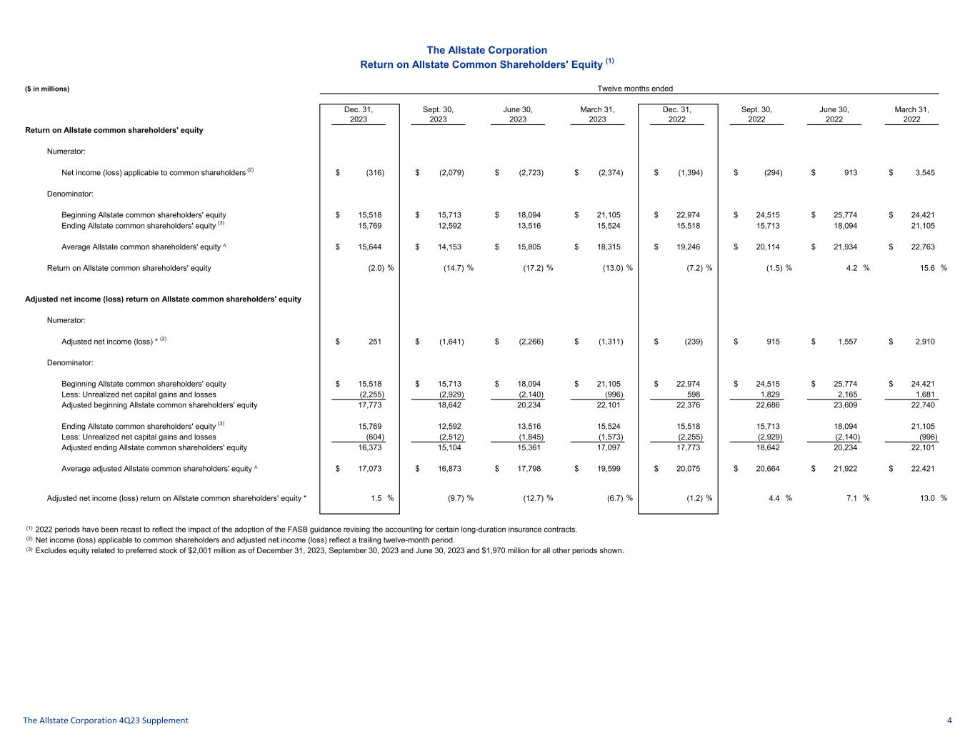 Dec. 31, 2023 Sept. 30, 2023 June 30, 2023 March 31, 2023 Dec. 31, 2022 Sept. 30, 2022 June 30, 2022 March 31, 2022 (316)$ (2,079)$ (2,723)$ (2,374)$ (1,394)$ (294)$ 913$ 3,545$ 15,518$ 15,713$ 18,094$ 21,105$ 22,974$ 24,515$ 25,774$ 24,421$ 15,769 12,592 13,516 15,524 15,518 15,713 18,094 21,105 15,644$ 14,153$ 15,805$ 18,315$ 19,246$ 20,114$ 21,934$ 22,763$ (2.0) % (14.7) % (17.2) % (13.0) % (7.2) % (1.5) % 4.2 % 15.6 % 251$ (1,641)$ (2,266)$ (1,311)$ (239)$ 915$ 1,557$ 2,910$ 15,518$ 15,713$ 18,094$ 21,105$ 22,974$ 24,515$ 25,774$ 24,421$ (2,255) (2,929) (2,140) (996) 598 1,829 2,165 1,681 17,773 18,642 20,234 22,101 22,376 22,686 23,609 22,740 15,769 12,592 13,516 15,524 15,518 15,713 18,094 21,105 (604) (2,512) (1,845) (1,573) (2,255) (2,929) (2,140) (996) 16,373 15,104 15,361 17,097 17,773 18,642 20,234 22,101 17,073$ 16,873$ 17,798$ 19,599$ 20,075$ 20,664$ 21,922$ 22,421$ 1.5 % (9.7) % (12.7) % (6.7) % (1.2) % 4.4 % 7.1 % 13.0 % (1) (2) (3) Beginning Allstate common shareholders' equity Less: Unrealized net capital gains and losses Adjusted beginning Allstate common shareholders' equity Excludes equity related to preferred stock of $2,001 million as of December 31, 2023, September 30, 2023 and June 30, 2023 and $1,970 million for all other periods shown. Net income (loss) applicable to common shareholders and adjusted net income (loss) reflect a trailing twelve-month period. 2022 periods have been recast to reflect the impact of the adoption of the FASB guidance revising the accounting for certain long-duration insurance contracts. Ending Allstate common shareholders' equity (3) Less: Unrealized net capital gains and losses Adjusted ending Allstate common shareholders' equity Average adjusted Allstate common shareholders' equity ^ Adjusted net income (loss) return on Allstate common shareholders' equity * Numerator: Adjusted net income (loss) * (2) Denominator: Return on Allstate common shareholders' equity Adjusted net income (loss) return on Allstate common shareholders' equity Beginning Allstate common shareholders' equity Ending Allstate common shareholders' equity (3) Average Allstate common shareholders' equity ^ Numerator: Net income (loss) applicable to common shareholders (2) Denominator: ($ in millions) Return on Allstate common shareholders' equity Return on Allstate Common Shareholders' Equity (1) The Allstate Corporation Twelve months ended The Allstate Corporation 4Q23 Supplement 4