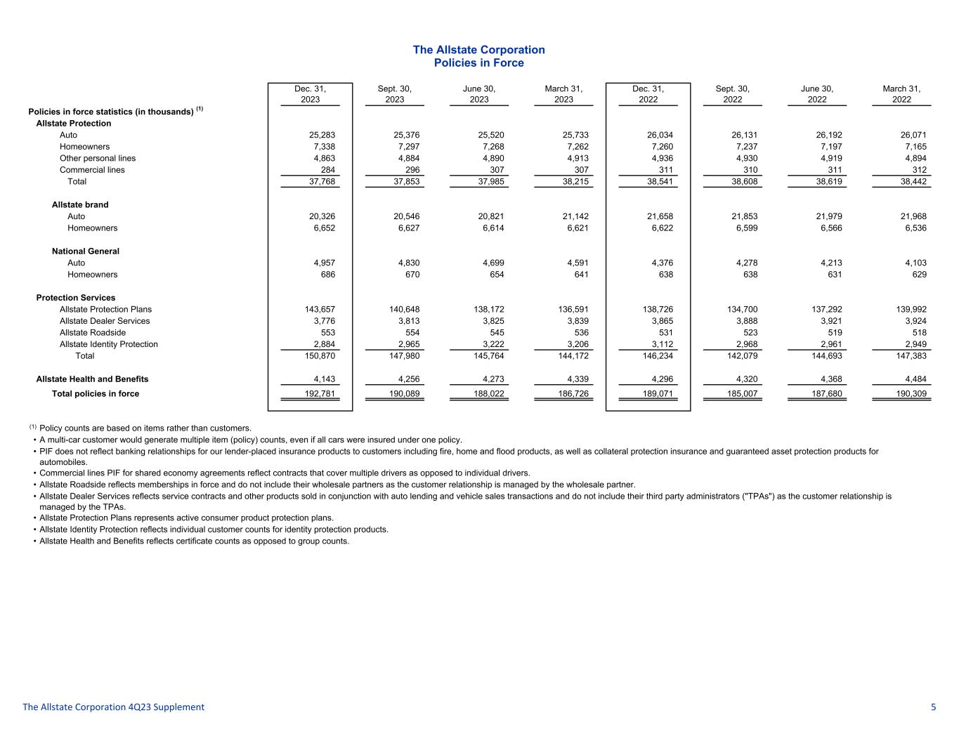 Dec. 31, 2023 Sept. 30, 2023 June 30, 2023 March 31, 2023 Dec. 31, 2022 Sept. 30, 2022 June 30, 2022 March 31, 2022 25,283 25,376 25,520 25,733 26,034 26,131 26,192 26,071 7,338 7,297 7,268 7,262 7,260 7,237 7,197 7,165 4,863 4,884 4,890 4,913 4,936 4,930 4,919 4,894 284 296 307 307 311 310 311 312 37,768 37,853 37,985 38,215 38,541 38,608 38,619 38,442 20,326 20,546 20,821 21,142 21,658 21,853 21,979 21,968 6,652 6,627 6,614 6,621 6,622 6,599 6,566 6,536 4,957 4,830 4,699 4,591 4,376 4,278 4,213 4,103 686 670 654 641 638 638 631 629 143,657 140,648 138,172 136,591 138,726 134,700 137,292 139,992 3,776 3,813 3,825 3,839 3,865 3,888 3,921 3,924 553 554 545 536 531 523 519 518 2,884 2,965 3,222 3,206 3,112 2,968 2,961 2,949 150,870 147,980 145,764 144,172 146,234 142,079 144,693 147,383 4,143 4,256 4,273 4,339 4,296 4,320 4,368 4,484 192,781 190,089 188,022 186,726 189,071 185,007 187,680 190,309 (1) • • • • • • • • Policy counts are based on items rather than customers. Allstate Health and Benefits reflects certificate counts as opposed to group counts. Allstate Identity Protection reflects individual customer counts for identity protection products. Allstate Protection Plans represents active consumer product protection plans. Allstate Dealer Services reflects service contracts and other products sold in conjunction with auto lending and vehicle sales transactions and do not include their third party administrators ("TPAs") as the customer relationship is managed by the TPAs. PIF does not reflect banking relationships for our lender-placed insurance products to customers including fire, home and flood products, as well as collateral protection insurance and guaranteed asset protection products for automobiles. A multi-car customer would generate multiple item (policy) counts, even if all cars were insured under one policy. Commercial lines PIF for shared economy agreements reflect contracts that cover multiple drivers as opposed to individual drivers. Allstate Roadside reflects memberships in force and do not include their wholesale partners as the customer relationship is managed by the wholesale partner. Allstate Identity Protection Total Allstate Health and Benefits Total policies in force Protection Services Allstate Protection Plans Allstate Dealer Services Allstate Roadside Homeowners National General Auto Homeowners Other personal lines Commercial lines Total Allstate brand Auto Policies in force statistics (in thousands) (1) Allstate Protection Auto Homeowners The Allstate Corporation Policies in Force The Allstate Corporation 4Q23 Supplement 5