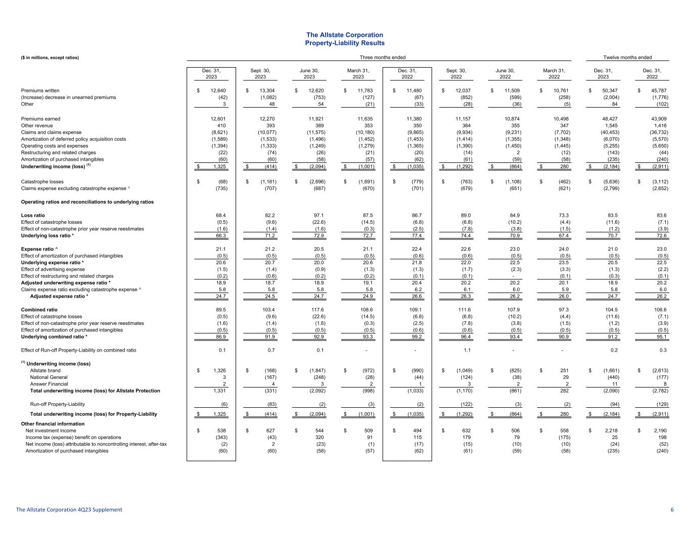 Dec. 31, 2023 Sept. 30, 2023 June 30, 2023 March 31, 2023 Dec. 31, 2022 Sept. 30, 2022 June 30, 2022 March 31, 2022 Dec. 31, 2023 Dec. 31, 2022 12,640$ 13,304$ 12,620$ 11,783$ 11,480$ 12,037$ 11,509$ 10,761$ 50,347$ 45,787$ (42) (1,082) (753) (127) (67) (852) (599) (258) (2,004) (1,776) 3 48 54 (21) (33) (28) (36) (5) 84 (102) 12,601 12,270 11,921 11,635 11,380 11,157 10,874 10,498 48,427 43,909 410 393 389 353 350 364 355 347 1,545 1,416 (8,621) (10,077) (11,575) (10,180) (9,865) (9,934) (9,231) (7,702) (40,453) (36,732) (1,589) (1,533) (1,496) (1,452) (1,453) (1,414) (1,355) (1,348) (6,070) (5,570) (1,394) (1,333) (1,249) (1,279) (1,365) (1,390) (1,450) (1,445) (5,255) (5,650) (22) (74) (26) (21) (20) (14) 2 (12) (143) (44) (60) (60) (58) (57) (62) (61) (59) (58) (235) (240) 1,325$ (414)$ (2,094)$ (1,001)$ (1,035)$ (1,292)$ (864)$ 280$ (2,184)$ (2,911)$ (68)$ (1,181)$ (2,696)$ (1,691)$ (779)$ (763)$ (1,108)$ (462)$ (5,636)$ (3,112)$ (735) (707) (687) (670) (701) (679) (651) (621) (2,799) (2,652) 68.4 82.2 97.1 87.5 86.7 89.0 84.9 73.3 83.5 83.6 (0.5) (9.6) (22.6) (14.5) (6.8) (6.8) (10.2) (4.4) (11.6) (7.1) (1.6) (1.4) (1.6) (0.3) (2.5) (7.8) (3.8) (1.5) (1.2) (3.9) 66.3 71.2 72.9 72.7 77.4 74.4 70.9 67.4 70.7 72.6 21.1 21.2 20.5 21.1 22.4 22.6 23.0 24.0 21.0 23.0 (0.5) (0.5) (0.5) (0.5) (0.6) (0.6) (0.5) (0.5) (0.5) (0.5) 20.6 20.7 20.0 20.6 21.8 22.0 22.5 23.5 20.5 22.5 (1.5) (1.4) (0.9) (1.3) (1.3) (1.7) (2.3) (3.3) (1.3) (2.2) (0.2) (0.6) (0.2) (0.2) (0.1) (0.1) - (0.1) (0.3) (0.1) 18.9 18.7 18.9 19.1 20.4 20.2 20.2 20.1 18.9 20.2 5.8 5.8 5.8 5.8 6.2 6.1 6.0 5.9 5.8 6.0 24.7 24.5 24.7 24.9 26.6 26.3 26.2 26.0 24.7 26.2 89.5 103.4 117.6 108.6 109.1 111.6 107.9 97.3 104.5 106.6 (0.5) (9.6) (22.6) (14.5) (6.8) (6.8) (10.2) (4.4) (11.6) (7.1) (1.6) (1.4) (1.6) (0.3) (2.5) (7.8) (3.8) (1.5) (1.2) (3.9) (0.5) (0.5) (0.5) (0.5) (0.6) (0.6) (0.5) (0.5) (0.5) (0.5) 86.9 91.9 92.9 93.3 99.2 96.4 93.4 90.9 91.2 95.1 0.1 0.7 0.1 - - 1.1 - - 0.2 0.3 1,326$ (168)$ (1,847)$ (972)$ (990)$ (1,049)$ (825)$ 251$ (1,661)$ (2,613)$ 3 (167) (248) (28) (44) (124) (38) 29 (440) (177) 2 4 3 2 1 3 2 2 11 8 1,331 (331) (2,092) (998) (1,033) (1,170) (861) 282 (2,090) (2,782) (6) (83) (2) (3) (2) (122) (3) (2) (94) (129) 1,325$ (414)$ (2,094)$ (1,001)$ (1,035)$ (1,292)$ (864)$ 280$ (2,184)$ (2,911)$ 538$ 627$ 544$ 509$ 494$ 632$ 506$ 558$ 2,218$ 2,190$ (343) (43) 320 91 115 179 79 (175) 25 198 (2) 2 (23) (1) (17) (15) (10) (10) (24) (52) (60) (60) (58) (57) (62) (61) (59) (58) (235) (240) Other financial information Net investment income Income tax (expense) benefit on operations Net income (loss) attributable to noncontrolling interest, after-tax Amortization of purchased intangibles National General Answer Financial Total underwriting income (loss) for Allstate Protection Run-off Property-Liability Total underwriting income (loss) for Property-Liability Underlying combined ratio * Effect of Run-off Property-Liability on combined ratio (1) Underwriting income (loss) Allstate brand Combined ratio Effect of catastrophe losses Effect of non-catastrophe prior year reserve reestimates Effect of amortization of purchased intangibles Effect of advertising expense Effect of restructuring and related charges Adjusted underwriting expense ratio * Claims expense ratio excluding catastrophe expense ^ Adjusted expense ratio * Expense ratio ^ Twelve months ended Effect of amortization of purchased intangibles Underlying expense ratio * Operating ratios and reconciliations to underlying ratios Loss ratio Effect of catastrophe losses Effect of non-catastrophe prior year reserve reestimates Underlying loss ratio * Underwriting income (loss) (1) Catastrophe losses Claims expense excluding catastrophe expense ^ Claims and claims expense Amortization of deferred policy acquisition costs Operating costs and expenses Restructuring and related charges Amortization of purchased intangibles (Increase) decrease in unearned premiums Other Premiums earned Other revenue ($ in millions, except ratios) Premiums written The Allstate Corporation Property-Liability Results Three months ended The Allstate Corporation 4Q23 Supplement 6