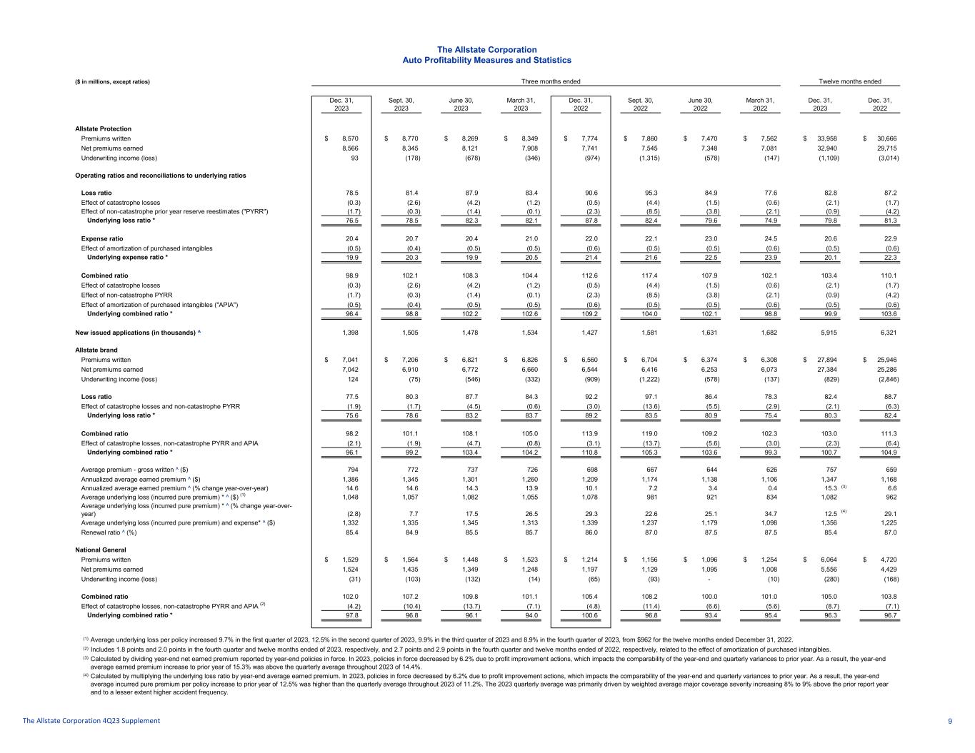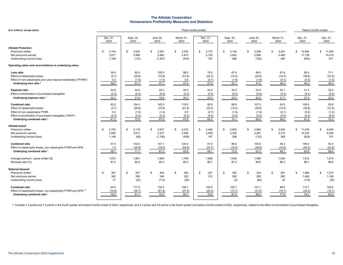 Dec. 31, 2023 Sept. 30, 2023 June 30, 2023 March 31, 2023 Dec. 31, 2022 Sept. 30, 2022 June 30, 2022 March 31, 2022 Dec. 31, 2023 Dec. 31, 2022 8,570$ 8,770$ 8,269$ 8,349$ 7,774$ 7,860$ 7,470$ 7,562$ 33,958$ 30,666$ 8,566 8,345 8,121 7,908 7,741 7,545 7,348 7,081 32,940 29,715 93 (178) (678) (346) (974) (1,315) (578) (147) (1,109) (3,014) 78.5 81.4 87.9 83.4 90.6 95.3 84.9 77.6 82.8 87.2 (0.3) (2.6) (4.2) (1.2) (0.5) (4.4) (1.5) (0.6) (2.1) (1.7) (1.7) (0.3) (1.4) (0.1) (2.3) (8.5) (3.8) (2.1) (0.9) (4.2) 76.5 78.5 82.3 82.1 87.8 82.4 79.6 74.9 79.8 81.3 20.4 20.7 20.4 21.0 22.0 22.1 23.0 24.5 20.6 22.9 (0.5) (0.4) (0.5) (0.5) (0.6) (0.5) (0.5) (0.6) (0.5) (0.6) 19.9 20.3 19.9 20.5 21.4 21.6 22.5 23.9 20.1 22.3 98.9 102.1 108.3 104.4 112.6 117.4 107.9 102.1 103.4 110.1 (0.3) (2.6) (4.2) (1.2) (0.5) (4.4) (1.5) (0.6) (2.1) (1.7) (1.7) (0.3) (1.4) (0.1) (2.3) (8.5) (3.8) (2.1) (0.9) (4.2) (0.5) (0.4) (0.5) (0.5) (0.6) (0.5) (0.5) (0.6) (0.5) (0.6) 96.4 98.8 102.2 102.6 109.2 104.0 102.1 98.8 99.9 103.6 1,398 1,505 1,478 1,534 1,427 1,581 1,631 1,682 5,915 6,321 7,041$ 7,206$ 6,821$ 6,826$ 6,560$ 6,704$ 6,374$ 6,308$ 27,894$ 25,946$ 7,042 6,910 6,772 6,660 6,544 6,416 6,253 6,073 27,384 25,286 124 (75) (546) (332) (909) (1,222) (578) (137) (829) (2,846) 77.5 80.3 87.7 84.3 92.2 97.1 86.4 78.3 82.4 88.7 (1.9) (1.7) (4.5) (0.6) (3.0) (13.6) (5.5) (2.9) (2.1) (6.3) 75.6 78.6 83.2 83.7 89.2 83.5 80.9 75.4 80.3 82.4 98.2 101.1 108.1 105.0 113.9 119.0 109.2 102.3 103.0 111.3 (2.1) (1.9) (4.7) (0.8) (3.1) (13.7) (5.6) (3.0) (2.3) (6.4) 96.1 99.2 103.4 104.2 110.8 105.3 103.6 99.3 100.7 104.9 794 772 737 726 698 667 644 626 757 659 1,386 1,345 1,301 1,260 1,209 1,174 1,138 1,106 1,347 1,168 14.6 14.6 14.3 13.9 10.1 7.2 3.4 0.4 15.3 (3) 6.6 1,048 1,057 1,082 1,055 1,078 981 921 834 1,082 962 (2.8) 7.7 17.5 26.5 29.3 22.6 25.1 34.7 12.5 (4) 29.1 1,332 1,335 1,345 1,313 1,339 1,237 1,179 1,098 1,356 1,225 85.4 84.9 85.5 85.7 86.0 87.0 87.5 87.5 85.4 87.0 1,529$ 1,564$ 1,448$ 1,523$ 1,214$ 1,156$ 1,096$ 1,254$ 6,064$ 4,720$ 1,524 1,435 1,349 1,248 1,197 1,129 1,095 1,008 5,556 4,429 (31) (103) (132) (14) (65) (93) - (10) (280) (168) 102.0 107.2 109.8 101.1 105.4 108.2 100.0 101.0 105.0 103.8 (4.2) (10.4) (13.7) (7.1) (4.8) (11.4) (6.6) (5.6) (8.7) (7.1) 97.8 96.8 96.1 94.0 100.6 96.8 93.4 95.4 96.3 96.7 (1) (2) (3) (4) Includes 1.8 points and 2.0 points in the fourth quarter and twelve months ended of 2023, respectively, and 2.7 points and 2.9 points in the fourth quarter and twelve months ended of 2022, respectively, related to the effect of amortization of purchased intangibles. Net premiums earned Underwriting income (loss) Combined ratio Effect of catastrophe losses, non-catastrophe PYRR and APIA (2) Underlying combined ratio * Average underlying loss per policy increased 9.7% in the first quarter of 2023, 12.5% in the second quarter of 2023, 9.9% in the third quarter of 2023 and 8.9% in the fourth quarter of 2023, from $962 for the twelve months ended December 31, 2022. Premiums written Combined ratio Effect of catastrophe losses, non-catastrophe PYRR and APIA Underlying combined ratio * Average premium - gross written ^ ($) Annualized average earned premium ^ ($) Annualized average earned premium ^ (% change year-over-year) Average underlying loss (incurred pure premium) * ^ ($) (1) Average underlying loss (incurred pure premium) * ^ (% change year-over- year) Average underlying loss (incurred pure premium) and expense* ^ ($) Renewal ratio ^ (%) National General Underlying loss ratio * Expense ratio Effect of amortization of purchased intangibles Underlying expense ratio * Underlying loss ratio * Effect of catastrophe losses Effect of non-catastrophe PYRR Effect of amortization of purchased intangibles ("APIA") Underlying combined ratio * New issued applications (in thousands) ^ Allstate brand Premiums written Net premiums earned Underwriting income (loss) Loss ratio Effect of catastrophe losses and non-catastrophe PYRR Calculated by dividing year-end net earned premium reported by year-end policies in force. In 2023, policies in force decreased by 6.2% due to profit improvement actions, which impacts the comparability of the year-end and quarterly variances to prior year. As a result, the year-end average earned premium increase to prior year of 15.3% was above the quarterly average throughout 2023 of 14.4%. Calculated by multiplying the underlying loss ratio by year-end average earned premium. In 2023, policies in force decreased by 6.2% due to profit improvement actions, which impacts the comparability of the year-end and quarterly variances to prior year. As a result, the year-end average incurred pure premium per policy increase to prior year of 12.5% was higher than the quarterly average throughout 2023 of 11.2%. The 2023 quarterly average was primarily driven by weighted average major coverage severity increasing 8% to 9% above the prior report year and to a lesser extent higher accident frequency. Allstate Protection The Allstate Corporation Auto Profitability Measures and Statistics ($ in millions, except ratios) Three months ended Twelve months ended Combined ratio Premiums written Net premiums earned Underwriting income (loss) Operating ratios and reconciliations to underlying ratios Loss ratio Effect of catastrophe losses Effect of non-catastrophe prior year reserve reestimates ("PYRR") The Allstate Corporation 4Q23 Supplement 9