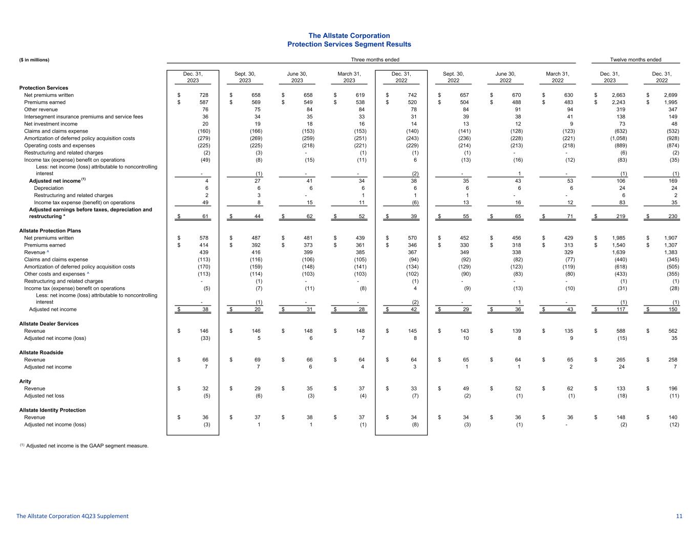 Dec. 31, 2023 Sept. 30, 2023 June 30, 2023 March 31, 2023 Dec. 31, 2022 Sept. 30, 2022 June 30, 2022 March 31, 2022 Dec. 31, 2023 Dec. 31, 2022 728$ 658$ 658$ 619$ 742$ 657$ 670$ 630$ 2,663$ 2,699$ 587$ 569$ 549$ 538$ 520$ 504$ 488$ 483$ 2,243$ 1,995$ 76 75 84 84 78 84 91 94 319 347 36 34 35 33 31 39 38 41 138 149 20 19 18 16 14 13 12 9 73 48 (160) (166) (153) (153) (140) (141) (128) (123) (632) (532) (279) (269) (259) (251) (243) (236) (228) (221) (1,058) (928) (225) (225) (218) (221) (229) (214) (213) (218) (889) (874) (2) (3) - (1) (1) (1) - - (6) (2) (49) (8) (15) (11) 6 (13) (16) (12) (83) (35) Less: net income (loss) attributable to noncontrolling interest - (1) - - (2) - 1 - (1) (1) 4 27 41 34 38 35 43 53 106 169 6 6 6 6 6 6 6 6 24 24 2 3 - 1 1 1 - - 6 2 49 8 15 11 (6) 13 16 12 83 35 61$ 44$ 62$ 52$ 39$ 55$ 65$ 71$ 219$ 230$ 578$ 487$ 481$ 439$ 570$ 452$ 456$ 429$ 1,985$ 1,907$ 414$ 392$ 373$ 361$ 346$ 330$ 318$ 313$ 1,540$ 1,307$ 439 416 399 385 367 349 338 329 1,639 1,383 (113) (116) (106) (105) (94) (92) (82) (77) (440) (345) (170) (159) (148) (141) (134) (129) (123) (119) (618) (505) (113) (114) (103) (103) (102) (90) (83) (80) (433) (355) - (1) - - (1) - - - (1) (1) (5) (7) (11) (8) 4 (9) (13) (10) (31) (28) Less: net income (loss) attributable to noncontrolling interest - (1) - - (2) - 1 - (1) (1) 38$ 20$ 31$ 28$ 42$ 29$ 36$ 43$ 117$ 150$ 146$ 146$ 148$ 148$ 145$ 143$ 139$ 135$ 588$ 562$ (33) 5 6 7 8 10 8 9 (15) 35 66$ 69$ 66$ 64$ 64$ 65$ 64$ 65$ 265$ 258$ 7 7 6 4 3 1 1 2 24 7 32$ 29$ 35$ 37$ 33$ 49$ 52$ 62$ 133$ 196$ (5) (6) (3) (4) (7) (2) (1) (1) (18) (11) 36$ 37$ 38$ 37$ 34$ 34$ 36$ 36$ 148$ 140$ (3) 1 1 (1) (8) (3) (1) - (2) (12) (1) Other costs and expenses ^ Restructuring and related charges Twelve months ended Net premiums written Premiums earned Revenue ^ Claims and claims expense Amortization of deferred policy acquisition costs Depreciation Restructuring and related charges Income tax expense (benefit) on operations Adjusted earnings before taxes, depreciation and restructuring * Allstate Protection Plans Amortization of deferred policy acquisition costs Operating costs and expenses Restructuring and related charges Adjusted net income is the GAAP segment measure. Income tax (expense) benefit on operations Adjusted net income Allstate Dealer Services Revenue Adjusted net income (loss) Allstate Roadside Revenue Adjusted net income Arity Revenue Adjusted net loss Allstate Identity Protection Revenue Adjusted net income (loss) Income tax (expense) benefit on operations Adjusted net income (1) Premiums earned Other revenue Intersegment insurance premiums and service fees Net investment income Claims and claims expense ($ in millions) Protection Services Net premiums written The Allstate Corporation Protection Services Segment Results Three months ended The Allstate Corporation 4Q23 Supplement 11