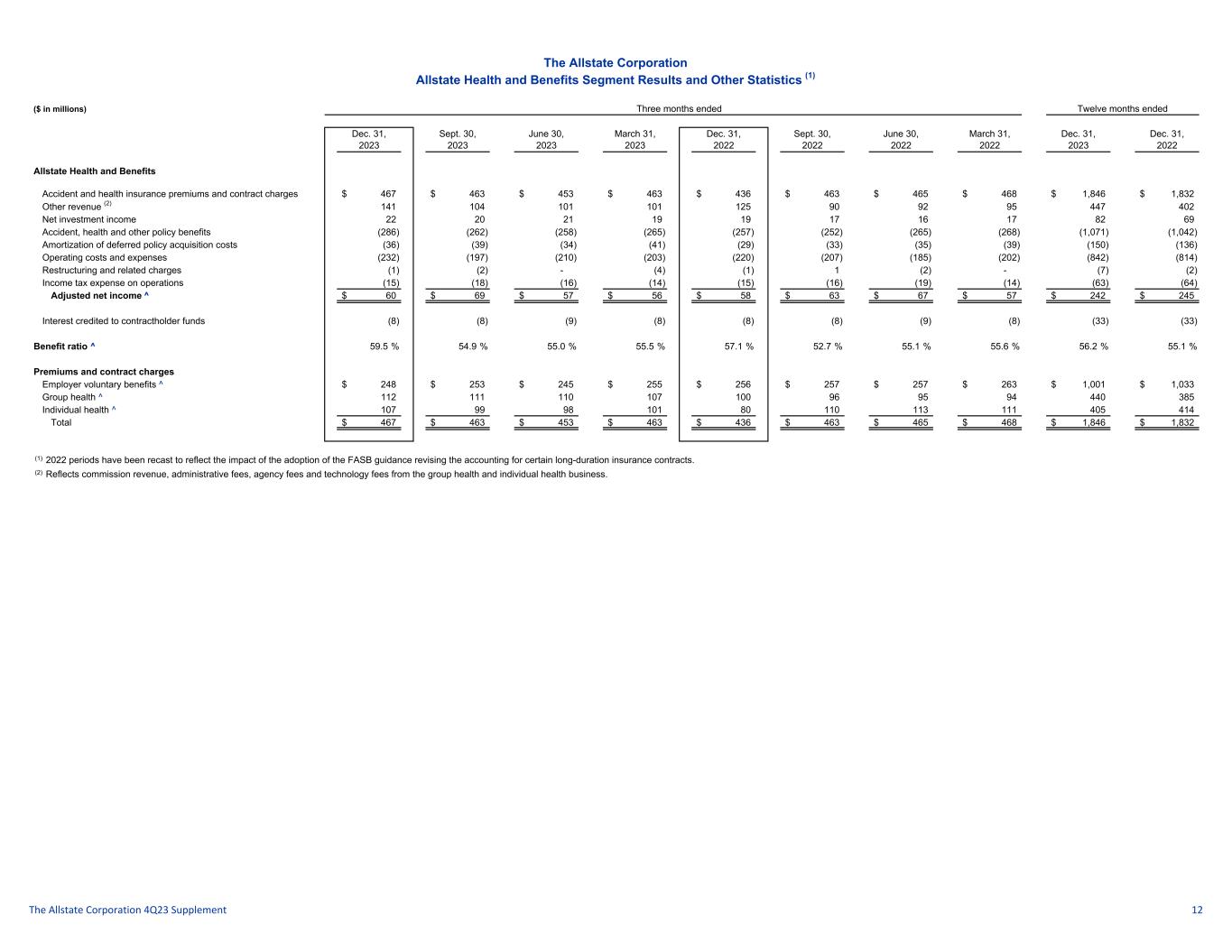 Dec. 31, 2023 Sept. 30, 2023 June 30, 2023 March 31, 2023 Dec. 31, 2022 Sept. 30, 2022 June 30, 2022 March 31, 2022 Dec. 31, 2023 Dec. 31, 2022 467$ 463$ 453$ 463$ 436$ 463$ 465$ 468$ 1,846$ 1,832$ 141 104 101 101 125 90 92 95 447 402 22 20 21 19 19 17 16 17 82 69 (286) (262) (258) (265) (257) (252) (265) (268) (1,071) (1,042) (36) (39) (34) (41) (29) (33) (35) (39) (150) (136) (232) (197) (210) (203) (220) (207) (185) (202) (842) (814) (1) (2) - (4) (1) 1 (2) - (7) (2) (15) (18) (16) (14) (15) (16) (19) (14) (63) (64) 60$ 69$ 57$ 56$ 58$ 63$ 67$ 57$ 242$ 245$ (8) (8) (9) (8) (8) (8) (9) (8) (33) (33) 59.5 % 54.9 % 55.0 % 55.5 % 57.1 % 52.7 % 55.1 % 55.6 % 56.2 % 55.1 % 248$ 253$ 245$ 255$ 256$ 257$ 257$ 263$ 1,001$ 1,033$ 112 111 110 107 100 96 95 94 440 385 107 99 98 101 80 110 113 111 405 414 467$ 463$ 453$ 463$ 436$ 463$ 465$ 468$ 1,846$ 1,832$ (1) (2) Total 2022 periods have been recast to reflect the impact of the adoption of the FASB guidance revising the accounting for certain long-duration insurance contracts. Reflects commission revenue, administrative fees, agency fees and technology fees from the group health and individual health business. Twelve months ended Interest credited to contractholder funds Benefit ratio ^ Premiums and contract charges Employer voluntary benefits ^ Group health ^ Operating costs and expenses Restructuring and related charges Income tax expense on operations Adjusted net income ̂ Accident and health insurance premiums and contract charges Accident, health and other policy benefits Amortization of deferred policy acquisition costs ($ in millions) Allstate Health and Benefits Individual health ^ The Allstate Corporation Allstate Health and Benefits Segment Results and Other Statistics (1) Three months ended Other revenue (2) Net investment income The Allstate Corporation 4Q23 Supplement 12