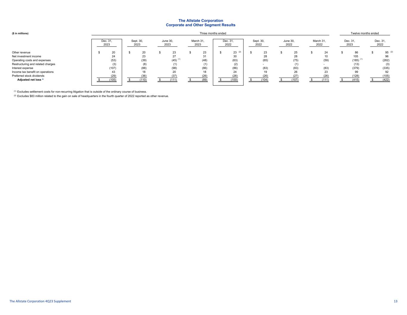 Dec. 31, 2023 Sept. 30, 2023 June 30, 2023 March 31, 2023 Dec. 31, 2022 Sept. 30, 2022 June 30, 2022 March 31, 2022 Dec. 31, 2023 Dec. 31, 2022 20$ 20$ 23$ 23$ 23$ (2) 23$ 25$ 24$ 86$ 95$ (2) 24 23 27 31 30 28 28 10 105 96 (53) (39) (45) (1) (48) (63) (65) (75) (59) (185) (1) (262) (3) (8) (1) (1) (2) - (1) - (13) (3) (107) (88) (98) (86) (86) (83) (83) (83) (379) (335) 43 18 20 18 24 19 26 23 99 92 (29) (36) (37) (26) (26) (26) (27) (26) (128) (105) (105)$ (110)$ (111)$ (89)$ (100)$ (104)$ (107)$ (111)$ (415)$ (422)$ (1) (2) Excludes settlement costs for non-recurring litigation that is outside of the ordinary course of business. Excludes $83 million related to the gain on sale of headquarters in the fourth quarter of 2022 reported as other revenue. Twelve months ended Net investment income Operating costs and expenses Restructuring and related charges Interest expense Income tax benefit on operations ($ in millions) Other revenue The Allstate Corporation Corporate and Other Segment Results Three months ended Preferred stock dividends Adjusted net loss ^ The Allstate Corporation 4Q23 Supplement 13