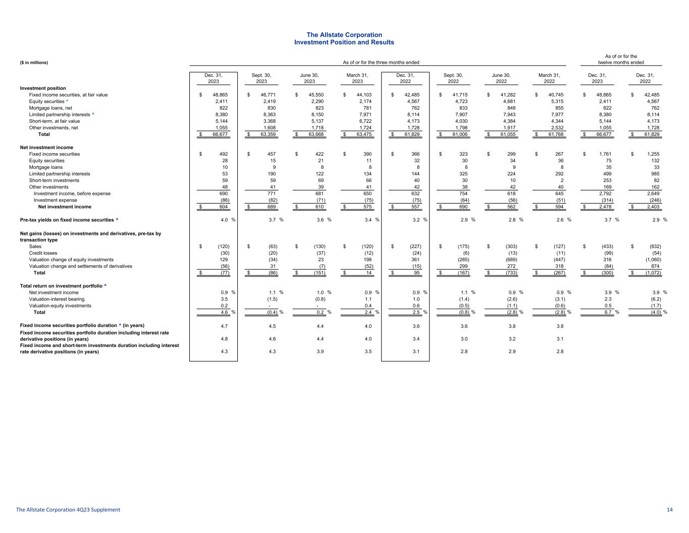 Dec. 31, 2023 Sept. 30, 2023 June 30, 2023 March 31, 2023 Dec. 31, 2022 Sept. 30, 2022 June 30, 2022 March 31, 2022 Dec. 31, 2023 Dec. 31, 2022 48,865$ 46,771$ 45,550$ 44,103$ 42,485$ 41,715$ 41,282$ 40,745$ 48,865$ 42,485$ 2,411 2,419 2,290 2,174 4,567 4,723 4,681 5,315 2,411 4,567 822 830 823 781 762 833 848 855 822 762 8,380 8,363 8,150 7,971 8,114 7,907 7,943 7,977 8,380 8,114 5,144 3,368 5,137 6,722 4,173 4,030 4,384 4,344 5,144 4,173 1,055 1,608 1,718 1,724 1,728 1,798 1,917 2,532 1,055 1,728 66,677$ 63,359$ 63,668$ 63,475$ 61,829$ 61,006$ 61,055$ 61,768$ 66,677$ 61,829$ 492$ 457$ 422$ 390$ 366$ 323$ 299$ 267$ 1,761$ 1,255$ 28 15 21 11 32 30 34 36 75 132 10 9 8 8 8 8 9 8 35 33 53 190 122 134 144 325 224 292 499 985 59 59 69 66 40 30 10 2 253 82 48 41 39 41 42 38 42 40 169 162 690 771 681 650 632 754 618 645 2,792 2,649 (86) (82) (71) (75) (75) (64) (56) (51) (314) (246) 604$ 689$ 610$ 575$ 557$ 690$ 562$ 594$ 2,478$ 2,403$ 4.0 % 3.7 % 3.6 % 3.4 % 3.2 % 2.9 % 2.8 % 2.6 % 3.7 % 2.9 % (120)$ (63)$ (130)$ (120)$ (227)$ (175)$ (303)$ (127)$ (433)$ (832)$ (30) (20) (37) (12) (24) (6) (13) (11) (99) (54) 129 (34) 23 198 361 (285) (689) (447) 316 (1,060) (56) 31 (7) (52) (15) 299 272 318 (84) 874 (77)$ (86)$ (151)$ 14$ 95$ (167)$ (733)$ (267)$ (300)$ (1,072)$ 0.9 % 1.1 % 1.0 % 0.9 % 0.9 % 1.1 % 0.9 % 0.9 % 3.9 % 3.9 % 3.5 (1.5) (0.8) 1.1 1.0 (1.4) (2.6) (3.1) 2.3 (6.2) 0.2 - - 0.4 0.6 (0.5) (1.1) (0.6) 0.5 (1.7) 4.6 % (0.4) % 0.2 % 2.4 % 2.5 % (0.8) % (2.8) % (2.8) % 6.7 % (4.0) % 4.7 4.5 4.4 4.0 3.6 3.6 3.8 3.8 4.8 4.6 4.4 4.0 3.4 3.0 3.2 3.1 4.3 4.3 3.9 3.5 3.1 2.8 2.9 2.8 Fixed income and short-term investments duration including interest rate derivative positions (in years) Valuation-equity investments Total Fixed income securities portfolio duration ^ (in years) Fixed income securities portfolio duration including interest rate derivative positions (in years) Total Total return on investment portfolio ^ Net investment income Valuation-interest bearing Valuation change of equity investments Investment Position and Results The Allstate Corporation As of or for the twelve months ended Valuation change and settlements of derivatives Pre-tax yields on fixed income securities ^ Net gains (losses) on investments and derivatives, pre-tax by transaction type Sales Credit losses Other investments Investment income, before expense Investment expense Net investment income Fixed income securities Equity securities Mortgage loans Limited partnership interests Short-term investments Short-term, at fair value Other investments, net Total Net investment income Fixed income securities, at fair value As of or for the three months ended Equity securities ^ Mortgage loans, net Limited partnership interests ^ ($ in millions) Investment position The Allstate Corporation 4Q23 Supplement 14