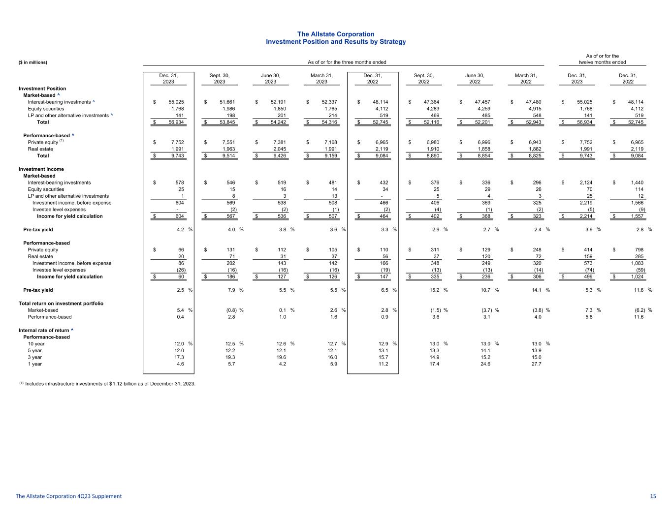 Dec. 31, 2023 Sept. 30, 2023 June 30, 2023 March 31, 2023 Dec. 31, 2022 Sept. 30, 2022 June 30, 2022 March 31, 2022 Dec. 31, 2023 Dec. 31, 2022 55,025$ 51,661$ 52,191$ 52,337$ 48,114$ 47,364$ 47,457$ 47,480$ 55,025$ 48,114$ 1,768 1,986 1,850 1,765 4,112 4,283 4,259 4,915 1,768 4,112 141 198 201 214 519 469 485 548 141 519 56,934$ 53,845$ 54,242$ 54,316$ 52,745$ 52,116$ 52,201$ 52,943$ 56,934$ 52,745$ 7,752$ 7,551$ 7,381$ 7,168$ 6,965$ 6,980$ 6,996$ 6,943$ 7,752$ 6,965$ 1,991 1,963 2,045 1,991 2,119 1,910 1,858 1,882 1,991 2,119 9,743$ 9,514$ 9,426$ 9,159$ 9,084$ 8,890$ 8,854$ 8,825$ 9,743$ 9,084$ 578$ 546$ 519$ 481$ 432$ 376$ 336$ 296$ 2,124$ 1,440$ 25 15 16 14 34 25 29 26 70 114 1 8 3 13 - 5 4 3 25 12 604 569 538 508 466 406 369 325 2,219 1,566 - (2) (2) (1) (2) (4) (1) (2) (5) (9) 604$ 567$ 536$ 507$ 464$ 402$ 368$ 323$ 2,214$ 1,557$ 4.2 % 4.0 % 3.8 % 3.6 % 3.3 % 2.9 % 2.7 % 2.4 % 3.9 % 2.8 % 66$ 131$ 112$ 105$ 110$ 311$ 129$ 248$ 414$ 798$ 20 71 31 37 56 37 120 72 159 285 86 202 143 142 166 348 249 320 573 1,083 (26) (16) (16) (16) (19) (13) (13) (14) (74) (59) 60$ 186$ 127$ 126$ 147$ 335$ 236$ 306$ 499$ 1,024$ 2.5 % 7.9 % 5.5 % 5.5 % 6.5 % 15.2 % 10.7 % 14.1 % 5.3 % 11.6 % 5.4 % (0.8) % 0.1 % 2.6 % 2.8 % (1.5) % (3.7) % (3.8) % 7.3 % (6.2) % 0.4 2.8 1.0 1.6 0.9 3.6 3.1 4.0 5.8 11.6 12.0 % 12.5 % 12.6 % 12.7 % 12.9 % 13.0 % 13.0 % 13.0 % 12.0 12.2 12.1 12.1 13.1 13.3 14.1 13.9 17.3 19.3 19.6 16.0 15.7 14.9 15.2 15.0 4.6 5.7 4.2 5.9 11.2 17.4 24.6 27.7 (1) Includes infrastructure investments of $1.12 billion as of December 31, 2023. Investment income, before expense Investee level expenses Income for yield calculation Pre-tax yield Total return on investment portfolio Market-based Performance-based Internal rate of return ^ Performance-based 10 year 5 year 3 year 1 year Private equity Real estate Investment Position and Results by Strategy The Allstate Corporation As of or for the twelve months ended Income for yield calculation Pre-tax yield Performance-based Interest-bearing investments Equity securities LP and other alternative investments Investment income, before expense Investee level expenses Real estate Total Investment income Market-based Equity securities LP and other alternative investments ^ Total Performance-based ^ Private equity (1) ($ in millions) Investment Position Market-based ^ As of or for the three months ended Interest-bearing investments ^ The Allstate Corporation 4Q23 Supplement 15
