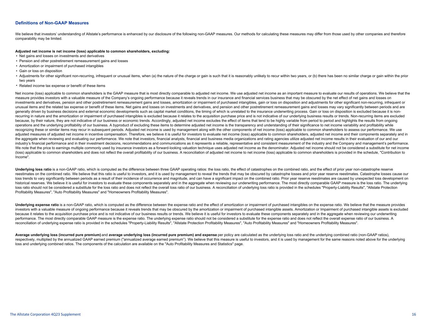 • Net gains and losses on investments and derivatives • Pension and other postretirement remeasurement gains and losses • Amortization or impairment of purchased intangibles • Gain or loss on disposition • Adjustments for other significant non-recurring, infrequent or unusual items, when (a) the nature of the charge or gain is such that it is reasonably unlikely to recur within two years, or (b) there has been no similar charge or gain within the prior two years • Related income tax expense or benefit of these items Underlying expense ratio is a non-GAAP ratio, which is computed as the difference between the expense ratio and the effect of amortization or impairment of purchased intangibles on the expense ratio. We believe that the measure provides investors with a valuable measure of ongoing performance because it reveals trends that may be obscured by the amortization or impairment of purchased intangible assets. Amortization or Impairment of purchased intangible assets is excluded because it relates to the acquisition purchase price and is not indicative of our business results or trends. We believe it is useful for investors to evaluate these components separately and in the aggregate when reviewing our underwriting performance. The most directly comparable GAAP measure is the expense ratio. The underlying expense ratio should not be considered a substitute for the expense ratio and does not reflect the overall expense ratio of our business. A reconciliation of underlying expense ratio is provided in the schedules "Property-Liability Results", "Allstate Protection Profitability Measures", "Auto Profitability Measures" and "Homeowners Profitability Measures". Average underlying loss (incurred pure premium) and average underlying loss (incurred pure premium) and expense per policy are calculated as the underlying loss ratio and the underlying combined ratio (non-GAAP ratios), respectively, multiplied by the annualized GAAP earned premium ("annualized average earned premium”). We believe that this measure is useful to investors, and it is used by management for the same reasons noted above for the underlying loss and underlying combined ratios. The components of the calculation are available on the "Auto Profitability Measures and Statistics" page. Definitions of Non-GAAP Measures We believe that investors’ understanding of Allstate’s performance is enhanced by our disclosure of the following non-GAAP measures. Our methods for calculating these measures may differ from those used by other companies and therefore comparability may be limited. Adjusted net income is net income (loss) applicable to common shareholders, excluding: Net income (loss) applicable to common shareholders is the GAAP measure that is most directly comparable to adjusted net income. We use adjusted net income as an important measure to evaluate our results of operations. We believe that the measure provides investors with a valuable measure of the Company’s ongoing performance because it reveals trends in our insurance and financial services business that may be obscured by the net effect of net gains and losses on investments and derivatives, pension and other postretirement remeasurement gains and losses, amortization or impairment of purchased intangibles, gain or loss on disposition and adjustments for other significant non-recurring, infrequent or unusual items and the related tax expense or benefit of these items. Net gains and losses on investments and derivatives, and pension and other postretirement remeasurement gains and losses may vary significantly between periods and are generally driven by business decisions and external economic developments such as capital market conditions, the timing of which is unrelated to the insurance underwriting process. Gain or loss on disposition is excluded because it is non- recurring in nature and the amortization or impairment of purchased intangibles is excluded because it relates to the acquisition purchase price and is not indicative of our underlying business results or trends. Non-recurring items are excluded because, by their nature, they are not indicative of our business or economic trends. Accordingly, adjusted net income excludes the effect of items that tend to be highly variable from period to period and highlights the results from ongoing operations and the underlying profitability of our business. A byproduct of excluding these items to determine adjusted net income is the transparency and understanding of their significance to net income variability and profitability while recognizing these or similar items may recur in subsequent periods. Adjusted net income is used by management along with the other components of net income (loss) applicable to common shareholders to assess our performance. We use adjusted measures of adjusted net income in incentive compensation. Therefore, we believe it is useful for investors to evaluate net income (loss) applicable to common shareholders, adjusted net income and their components separately and in the aggregate when reviewing and evaluating our performance. We note that investors, financial analysts, financial and business media organizations and rating agencies utilize adjusted net income results in their evaluation of our and our industry’s financial performance and in their investment decisions, recommendations and communications as it represents a reliable, representative and consistent measurement of the industry and the Company and management’s performance. We note that the price to earnings multiple commonly used by insurance investors as a forward-looking valuation technique uses adjusted net income as the denominator. Adjusted net income should not be considered a substitute for net income (loss) applicable to common shareholders and does not reflect the overall profitability of our business. A reconciliation of adjusted net income to net income (loss) applicable to common shareholde
