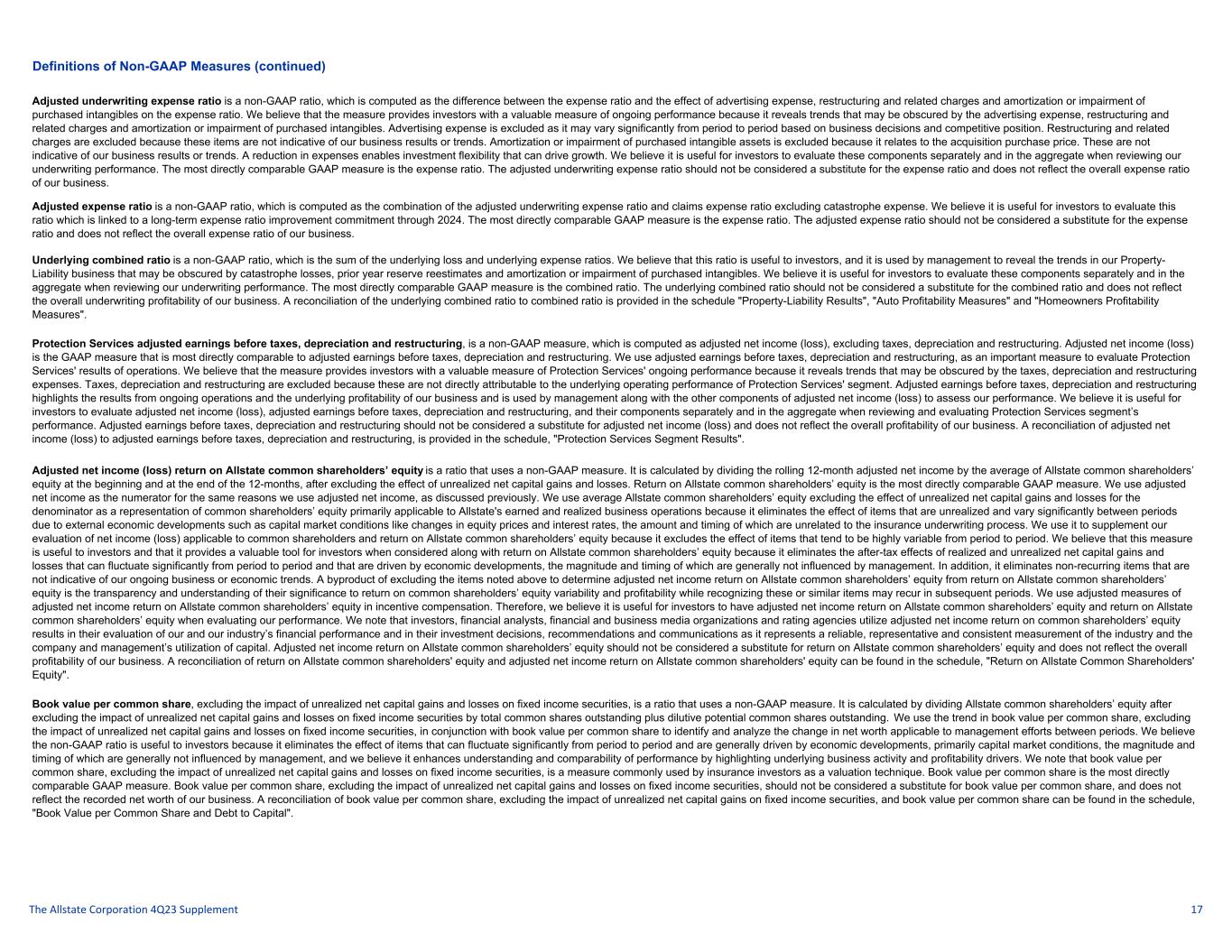 Definitions of Non-GAAP Measures (continued) Adjusted underwriting expense ratio is a non-GAAP ratio, which is computed as the difference between the expense ratio and the effect of advertising expense, restructuring and related charges and amortization or impairment of purchased intangibles on the expense ratio. We believe that the measure provides investors with a valuable measure of ongoing performance because it reveals trends that may be obscured by the advertising expense, restructuring and related charges and amortization or impairment of purchased intangibles. Advertising expense is excluded as it may vary significantly from period to period based on business decisions and competitive position. Restructuring and related charges are excluded because these items are not indicative of our business results or trends. Amortization or impairment of purchased intangible assets is excluded because it relates to the acquisition purchase price. These are not indicative of our business results or trends. A reduction in expenses enables investment flexibility that can drive growth. We believe it is useful for investors to evaluate these components separately and in the aggregate when reviewing our underwriting performance. The most directly comparable GAAP measure is the expense ratio. The adjusted underwriting expense ratio should not be considered a substitute for the expense ratio and does not reflect the overall expense ratio of our business. Adjusted expense ratio is a non-GAAP ratio, which is computed as the combination of the adjusted underwriting expense ratio and claims expense ratio excluding catastrophe expense. We believe it is useful for investors to evaluate this ratio which is linked to a long-term expense ratio improvement commitment through 2024. The most directly comparable GAAP measure is the expense ratio. The adjusted expense ratio should not be considered a substitute for the expense ratio and does not reflect the overall expense ratio of our business. Underlying combined ratio is a non-GAAP ratio, which is the sum of the underlying loss and underlying expense ratios. We believe that this ratio is useful to investors, and it is used by management to reveal the trends in our Property- Liability business that may be obscured by catastrophe losses, prior year reserve reestimates and amortization or impairment of purchased intangibles. We believe it is useful for investors to evaluate these components separately and in the aggregate when reviewing our underwriting performance. The most directly comparable GAAP measure is the combined ratio. The underlying combined ratio should not be considered a substitute for the combined ratio and does not reflect the overall underwriting profitability of our business. A reconciliation of the underlying combined ratio to combined ratio is provided in the schedule "Property-Liability Results", "Auto Profitability Measures" and "Homeowners Profitability Measures". Protection Services adjusted earnings before taxes, depreciation and restructuring, is a non-GAAP measure, which is computed as adjusted net income (loss), excluding taxes, depreciation and restructuring. Adjusted net income (loss) is the GAAP measure that is most directly comparable to adjusted earnings before taxes, depreciation and restructuring. We use adjusted earnings before taxes, depreciation and restructuring, as an important measure to evaluate Protection Services' results of operations. We believe that the measure provides investors with a valuable measure of Protection Services' ongoing performance because it reveals trends that may be obscured by the taxes, depreciation and restructuring expenses. Taxes, depreciation and restructuring are excluded because these are not directly attributable to the underlying operating performance of Protection Services' segment. Adjusted earnings before taxes, depreciation and restructuring highlights the results from ongoing operations and the underlying profitability of our business and is used by management along with the other components of adjusted net income (loss) to assess our performance. We believe it is useful for investors to evaluate adjusted net income (loss), adjusted earnings before taxes, depreciation and restructuring, and their components separately and in the aggregate when reviewing and evaluating Protection Services segment’s performance. Adjusted earnings before taxes, depreciation and restructuring should not be considered a substitute for adjusted net income (loss) and does not reflect the overall profitability of our business. A reconciliation of adjusted net income (loss) to adjusted earnings before taxes, depreciation and restructuring, is provided in the schedule, "Protection Services Segment Results". Adjusted net income (loss) return on Allstate common shareholders’ equity is a ratio that uses a non-GAAP measure. It is calculated by dividing the rolling 12-month adjusted net income by the average of Allstate common shareholders’ equity at the beginning and at the end of the 12-months, after excluding the effect of unrealized net capital gains and losses. Return on Allstate common shareholders’ equity is the most directly comparable GAAP measure. We use adjusted net income as the numerator for the same reasons we use adjusted net income, as discussed previously. We use average Allstate common shareholders’ equity excluding the effect of unrealized net capital gains and losses for the denominator as a representation of common shareholders’ equity primarily applicable to Allstate's earned and realized business operations because it eliminates the effect of items that are unrealized and vary significantly between periods due to external economic developments such as capital market conditions like changes in equity prices and interest rates, the amount and timing of which are unrelated to the insurance underwriting process. We use it to supplement our evaluation of net income (loss) applicable to
