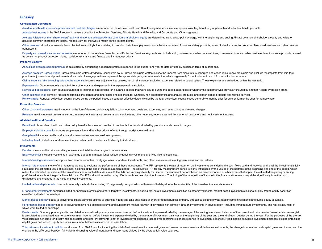 Glossary Consolidated Operations Accident and health insurance premiums and contract charges are reported in the Allstate Health and Benefits segment and include employer voluntary benefits, group health and individual health products. Adjusted net income is the GAAP segment measure used for the Protection Services, Allstate Health and Benefits, and Corporate and Other segments. Average Allstate common shareholders' equity and average adjusted Allstate common shareholders' equity are determined using a two-point average, with the beginning and ending Allstate common shareholders' equity and Allstate adjusted common shareholders' equity, respectively, for the twelve-month period as data points. Other revenue primarily represents fees collected from policyholders relating to premium installment payments, commissions on sales of non-proprietary products, sales of identity protection services, fee-based services and other revenue transactions. Property and casualty insurance premiums are reported in the Allstate Protection and Protection Services segments and include auto, homeowners, other personal lines, commercial lines and other business lines insurance products, as well as consumer product protection plans, roadside assistance and finance and insurance products. Property-Liability Annualized average earned premium is calculated by annualizing net earned premium reported in the quarter and year-to-date divided by policies in force at quarter end. Average premium - gross written: Gross premiums written divided by issued item count. Gross premiums written include the impacts from discounts, surcharges and ceded reinsurance premiums and exclude the impacts from mid-term premium adjustments and premium refund accruals. Average premiums represent the appropriate policy term for each line, which is generally 6 months for auto and 12 months for homeowners. Claims expense ratio excluding catastrophe expense: Incurred loss adjustment expenses, net of reinsurance, excluding expenses related to catastrophes. These expenses are embedded within the loss ratio. Expense ratio: Other revenue is deducted from other costs and expenses in the expense ratio calculation. New issued applications: Item counts of automobile insurance applications for insurance policies that were issued during the period, regardless of whether the customer was previously insured by another Allstate Protection brand. Other business lines primarily represent commissions earned and other costs and expenses for Ivantage, non-proprietary life and annuity products, and lender-placed products and related services. Renewal ratio: Renewal policy item counts issued during the period, based on contract effective dates, divided by the total policy item counts issued generally 6 months prior for auto or 12 months prior for homeowners. Allstate Health and Benefits Investments Duration measures the price sensitivity of assets and liabilities to changes in interest rates. Equity securities include investments in exchange traded and mutual funds whose underlying investments are fixed income securities. Interest-bearing investments comprise fixed income securities, mortgage loans, short-term investments, and other investments including bank loans and derivatives. Internal rate of return is one of the measures we use to evaluate the performance of these investments. The IRR represents the rate of return on the investments considering the cash flows paid and received and, until the investment is fully liquidated, the estimated value of investment holdings at the end of the measurement period. The calculated IRR for any measurement period is highly influenced by the values of the portfolio at the beginning and end of the period, which reflect the estimated fair values of the investments as of such dates. As a result, the IRR can vary significantly for different measurement periods based on macroeconomic or other events that impact the estimated beginning or ending portfolio value, such as the global financial crisis. Our IRR calculation method may differ from those used by other investors. The timing of the recognition of income in the financial statements may differ significantly from the cash distributions and changes in the value of these investments. Limited partnership interests: Income from equity method of accounting LP is generally recognized on a three-month delay due to the availability of the investee financial statements. LP and other investments comprise limited partnership interests and other alternative investments, including real estate investments classified as other investments. Market-based investments include publicly traded equity securities classified as limited partnerships. Market-based strategy seeks to deliver predictable earnings aligned to business needs and take advantage of short-term opportunities primarily through public and private fixed income investments and public equity securities. Performance-based strategy seeks to deliver attractive risk-adjusted returns and supplement market risk with idiosyncratic risk primarily through investments in private equity, including infrastructure investments, and real estate, most of which were limited partnerships. Pre-tax yields: Quarterly pre-tax yield is calculated as annualized quarterly investment income, before investment expense divided by the average of the ending investment balances of the current and prior quarter. Year-to-date pre-tax yield is calculated as annualized year-to-date investment income, before investment expense divided by the average of investment balances at the beginning of the year and the end of each quarter during the year. For the purposes of the pre-tax yield calculation, income for directly held real estate and other investments is net of investee level expenses (asset level operating expenses reported in investment expense). Fixed income securities investment balances exclude unrealized capital gains and losses. Equity securities investment bala
