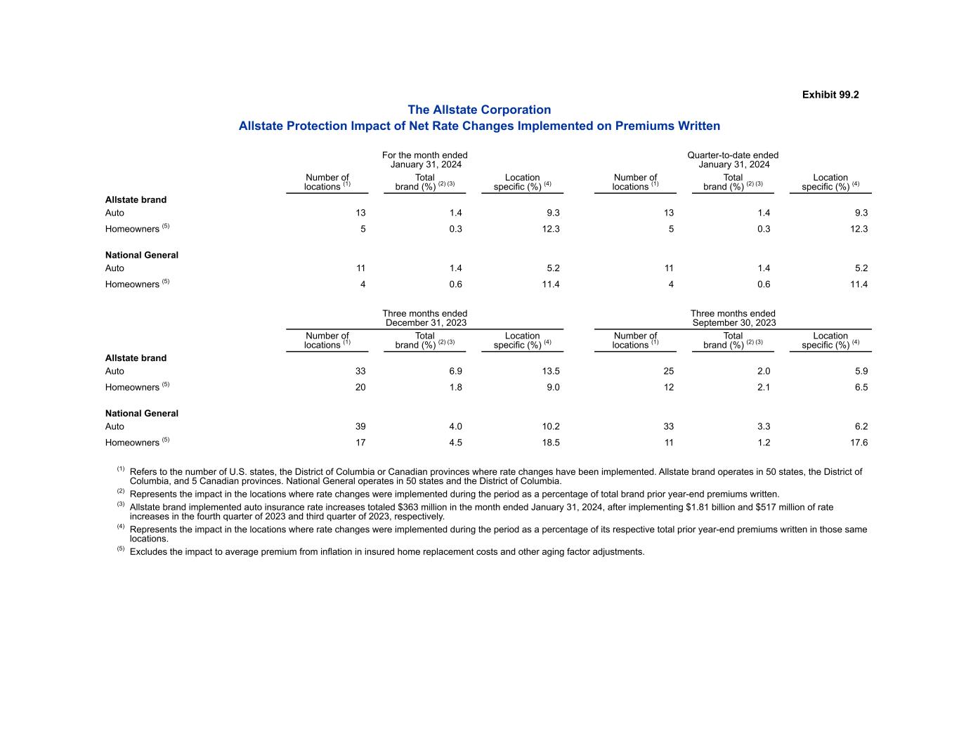 Exhibit 99.2 The Allstate Corporation Allstate Protection Impact of Net Rate Changes Implemented on Premiums Written For the month ended January 31, 2024 Quarter-to-date ended January 31, 2024 Number of locations (1) Total brand (%) (2) (3) Location specific (%) (4) Number of locations (1) Total brand (%) (2) (3) Location specific (%) (4) Allstate brand Auto 13 1.4 9.3 13 1.4 9.3 Homeowners (5) 5 0.3 12.3 5 0.3 12.3 National General Auto 11 1.4 5.2 11 1.4 5.2 Homeowners (5) 4 0.6 11.4 4 0.6 11.4 Three months ended December 31, 2023 Three months ended September 30, 2023 Number of locations (1) Total brand (%) (2) (3) Location specific (%) (4) Number of locations (1) Total brand (%) (2) (3) Location specific (%) (4) Allstate brand Auto 33 6.9 13.5 25 2.0 5.9 Homeowners (5) 20 1.8 9.0 12 2.1 6.5 National General Auto 39 4.0 10.2 33 3.3 6.2 Homeowners (5) 17 4.5 18.5 11 1.2 17.6 (1) Refers to the number of U.S. states, the District of Columbia or Canadian provinces where rate changes have been implemented. Allstate brand operates in 50 states, the District of Columbia, and 5 Canadian provinces. National General operates in 50 states and the District of Columbia. (2) Represents the impact in the locations where rate changes were implemented during the period as a percentage of total brand prior year-end premiums written. (3) Allstate brand implemented auto insurance rate increases totaled $363 million in the month ended January 31, 2024, after implementing $1.81 billion and $517 million of rate increases in the fourth quarter of 2023 and third quarter of 2023, respectively. (4) Represents the impact in the locations where rate changes were implemented during the period as a percentage of its respective total prior year-end premiums written in those same locations. (5) Excludes the impact to average premium from inflation in insured home replacement costs and other aging factor adjustments.