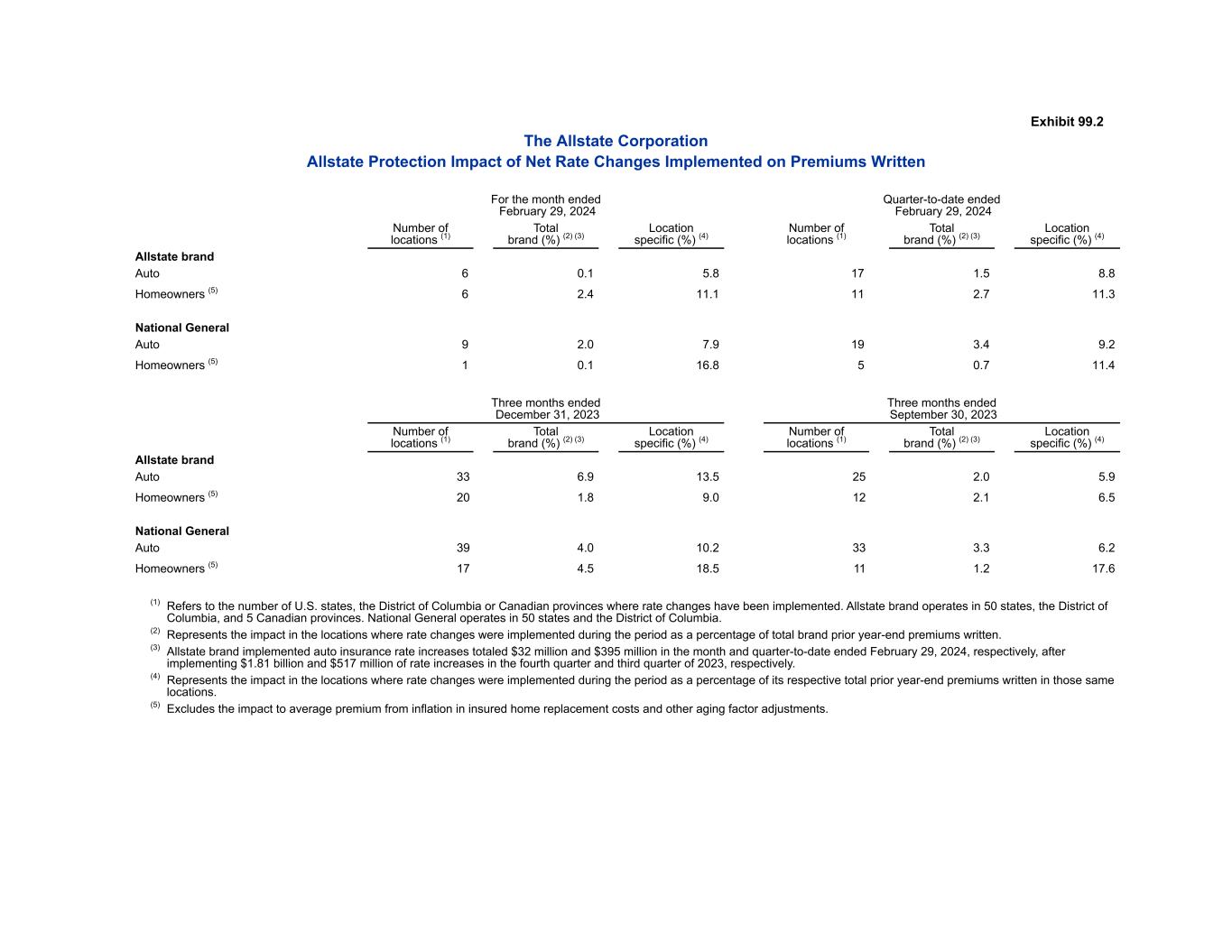 Exhibit 99.2 The Allstate Corporation Allstate Protection Impact of Net Rate Changes Implemented on Premiums Written For the month ended February 29, 2024 Quarter-to-date ended February 29, 2024 Number of locations (1) Total brand (%) (2) (3) Location specific (%) (4) Number of locations (1) Total brand (%) (2) (3) Location specific (%) (4) Allstate brand Auto 6 0.1 5.8 17 1.5 8.8 Homeowners (5) 6 2.4 11.1 11 2.7 11.3 National General Auto 9 2.0 7.9 19 3.4 9.2 Homeowners (5) 1 0.1 16.8 5 0.7 11.4 Three months ended December 31, 2023 Three months ended September 30, 2023 Number of locations (1) Total brand (%) (2) (3) Location specific (%) (4) Number of locations (1) Total brand (%) (2) (3) Location specific (%) (4) Allstate brand Auto 33 6.9 13.5 25 2.0 5.9 Homeowners (5) 20 1.8 9.0 12 2.1 6.5 National General Auto 39 4.0 10.2 33 3.3 6.2 Homeowners (5) 17 4.5 18.5 11 1.2 17.6 (1) Refers to the number of U.S. states, the District of Columbia or Canadian provinces where rate changes have been implemented. Allstate brand operates in 50 states, the District of Columbia, and 5 Canadian provinces. National General operates in 50 states and the District of Columbia. (2) Represents the impact in the locations where rate changes were implemented during the period as a percentage of total brand prior year-end premiums written. (3) Allstate brand implemented auto insurance rate increases totaled $32 million and $395 million in the month and quarter-to-date ended February 29, 2024, respectively, after implementing $1.81 billion and $517 million of rate increases in the fourth quarter and third quarter of 2023, respectively. (4) Represents the impact in the locations where rate changes were implemented during the period as a percentage of its respective total prior year-end premiums written in those same locations. (5) Excludes the impact to average premium from inflation in insured home replacement costs and other aging factor adjustments.