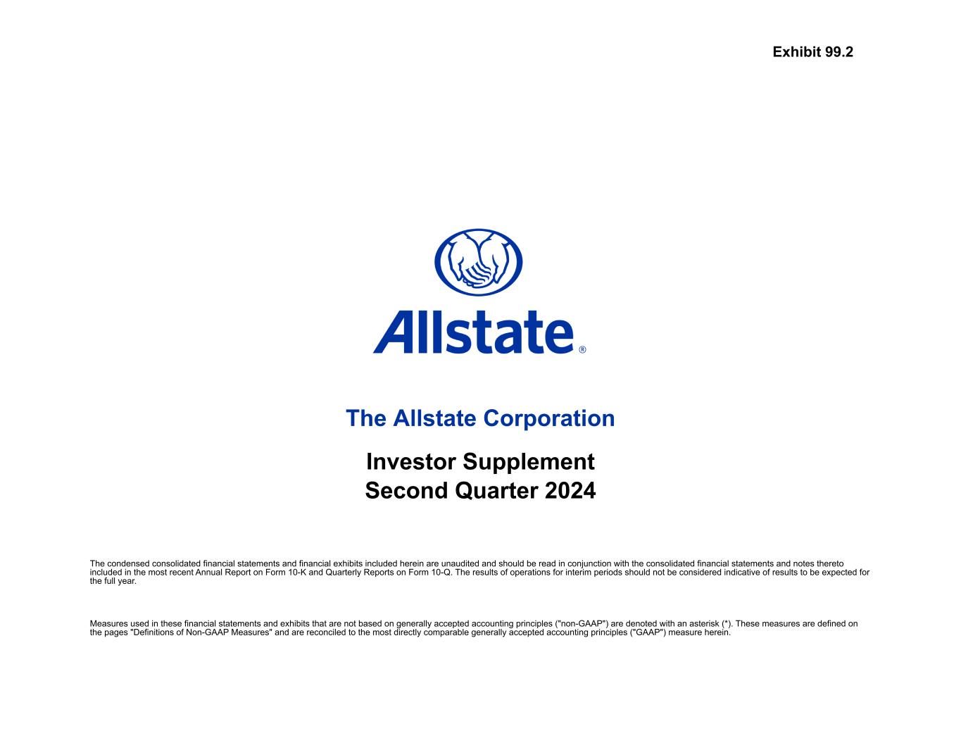 The Allstate Corporation Investor Supplement Second Quarter 2024 The condensed consolidated financial statements and financial exhibits included herein are unaudited and should be read in conjunction with the consolidated financial statements and notes thereto included in the most recent Annual Report on Form 10-K and Quarterly Reports on Form 10-Q. The results of operations for interim periods should not be considered indicative of results to be expected for the full year. Measures used in these financial statements and exhibits that are not based on generally accepted accounting principles ("non-GAAP") are denoted with an asterisk (*). These measures are defined on the pages "Definitions of Non-GAAP Measures" and are reconciled to the most directly comparable generally accepted accounting principles ("GAAP") measure herein. Exhibit 99.2