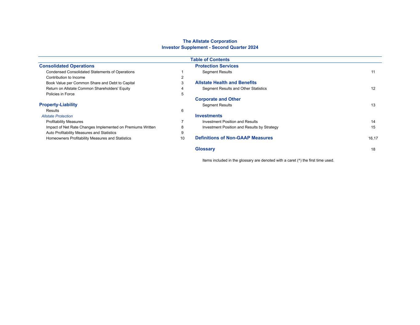 The Allstate Corporation Investor Supplement - Second Quarter 2024 Table of Contents Consolidated Operations Protection Services Condensed Consolidated Statements of Operations 1 Segment Results 11 Contribution to Income 2 Book Value per Common Share and Debt to Capital 3 Allstate Health and Benefits Return on Allstate Common Shareholders' Equity 4 Segment Results and Other Statistics 12 Policies in Force 5 Corporate and Other Property-Liability Segment Results 13 Results 6 Allstate Protection Investments Profitability Measures 7 Investment Position and Results 14 Impact of Net Rate Changes Implemented on Premiums Written 8 Investment Position and Results by Strategy 15 Auto Profitability Measures and Statistics 9 Homeowners Profitability Measures and Statistics 10 Definitions of Non-GAAP Measures 16,17 Glossary 18 Items included in the glossary are denoted with a caret (^) the first time used.