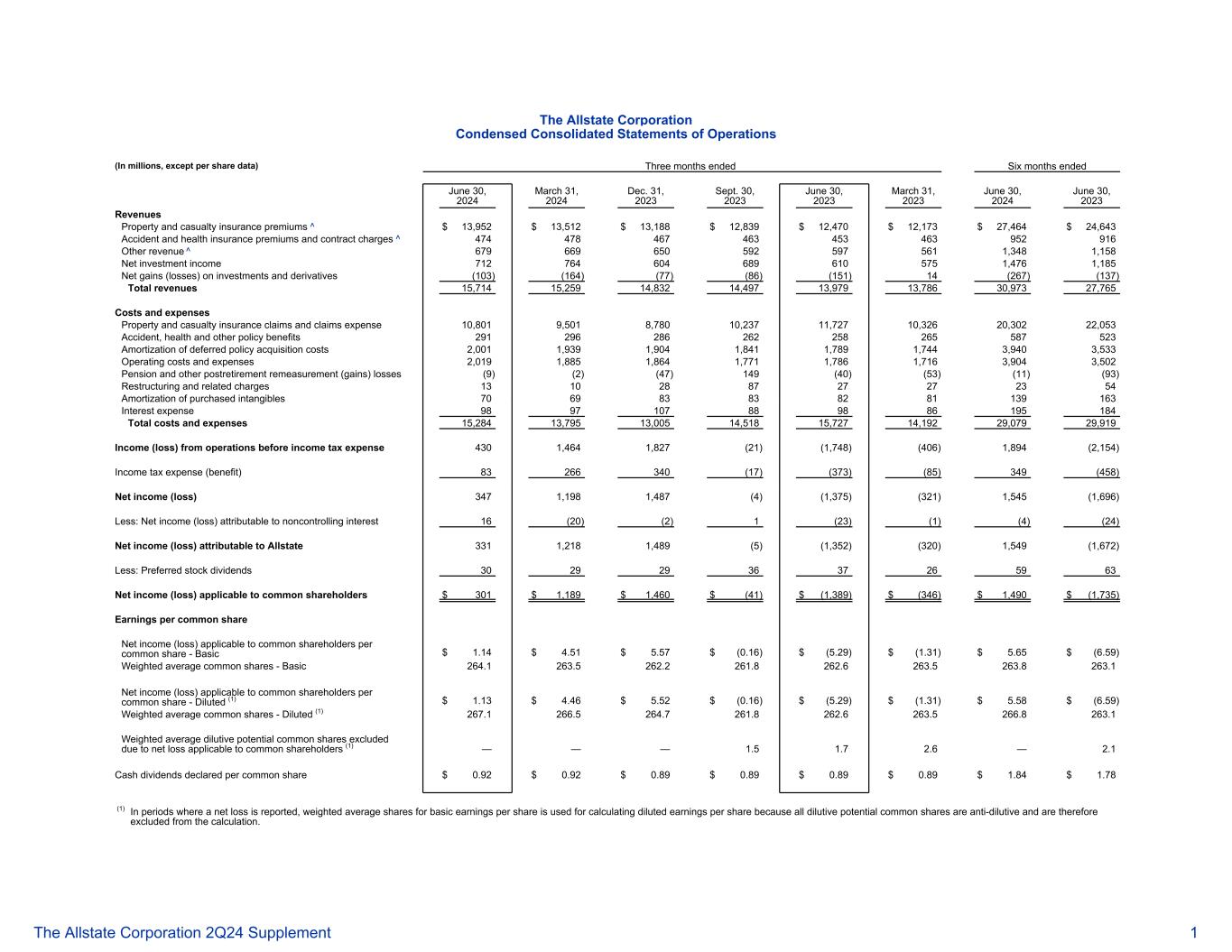 The Allstate Corporation Condensed Consolidated Statements of Operations (In millions, except per share data) Three months ended Six months ended June 30, 2024 March 31, 2024 Dec. 31, 2023 Sept. 30, 2023 June 30, 2023 March 31, 2023 June 30, 2024 June 30, 2023 Revenues Property and casualty insurance premiums ^ $ 13,952 $ 13,512 $ 13,188 $ 12,839 $ 12,470 $ 12,173 $ 27,464 $ 24,643 Accident and health insurance premiums and contract charges ^ 474 478 467 463 453 463 952 916 Other revenue ^ 679 669 650 592 597 561 1,348 1,158 Net investment income 712 764 604 689 610 575 1,476 1,185 Net gains (losses) on investments and derivatives (103) (164) (77) (86) (151) 14 (267) (137) Total revenues 15,714 15,259 14,832 14,497 13,979 13,786 30,973 27,765 Costs and expenses Property and casualty insurance claims and claims expense 10,801 9,501 8,780 10,237 11,727 10,326 20,302 22,053 Accident, health and other policy benefits 291 296 286 262 258 265 587 523 Amortization of deferred policy acquisition costs 2,001 1,939 1,904 1,841 1,789 1,744 3,940 3,533 Operating costs and expenses 2,019 1,885 1,864 1,771 1,786 1,716 3,904 3,502 Pension and other postretirement remeasurement (gains) losses (9) (2) (47) 149 (40) (53) (11) (93) Restructuring and related charges 13 10 28 87 27 27 23 54 Amortization of purchased intangibles 70 69 83 83 82 81 139 163 Interest expense 98 97 107 88 98 86 195 184 Total costs and expenses 15,284 13,795 13,005 14,518 15,727 14,192 29,079 29,919 Income (loss) from operations before income tax expense 430 1,464 1,827 (21) (1,748) (406) 1,894 (2,154) Income tax expense (benefit) 83 266 340 (17) (373) (85) 349 (458) Net income (loss) 347 1,198 1,487 (4) (1,375) (321) 1,545 (1,696) Less: Net income (loss) attributable to noncontrolling interest 16 (20) (2) 1 (23) (1) (4) (24) Net income (loss) attributable to Allstate 331 1,218 1,489 (5) (1,352) (320) 1,549 (1,672) Less: Preferred stock dividends 30 29 29 36 37 26 59 63 Net income (loss) applicable to common shareholders $ 301 $ 1,189 $ 1,460 $ (41) $ (1,389) $ (346) $ 1,490 $ (1,735) Earnings per common share Net income (loss) applicable to common shareholders per common share - Basic $ 1.14 $ 4.51 $ 5.57 $ (0.16) $ (5.29) $ (1.31) $ 5.65 $ (6.59) Weighted average common shares - Basic 264.1 263.5 262.2 261.8 262.6 263.5 263.8 263.1 Net income (loss) applicable to common shareholders per common share - Diluted (1) $ 1.13 $ 4.46 $ 5.52 $ (0.16) $ (5.29) $ (1.31) $ 5.58 $ (6.59) Weighted average common shares - Diluted (1) 267.1 266.5 264.7 261.8 262.6 263.5 266.8 263.1 Weighted average dilutive potential common shares excluded due to net loss applicable to common shareholders (1) — — — 1.5 1.7 2.6 — 2.1 Cash dividends declared per common share $ 0.92 $ 0.92 $ 0.89 $ 0.89 $ 0.89 $ 0.89 $ 1.84 $ 1.78 (1) In periods where a net loss is reported, weighted average shares for basic earnings per share is used for calculating diluted earnings per share because all dilutive potential common shares are anti-dilutive and are therefore excluded from the calculation. The Allstate Corporation 2Q24 Supplement 1