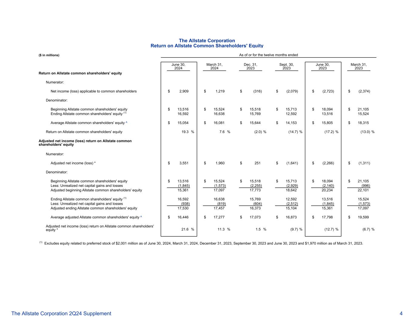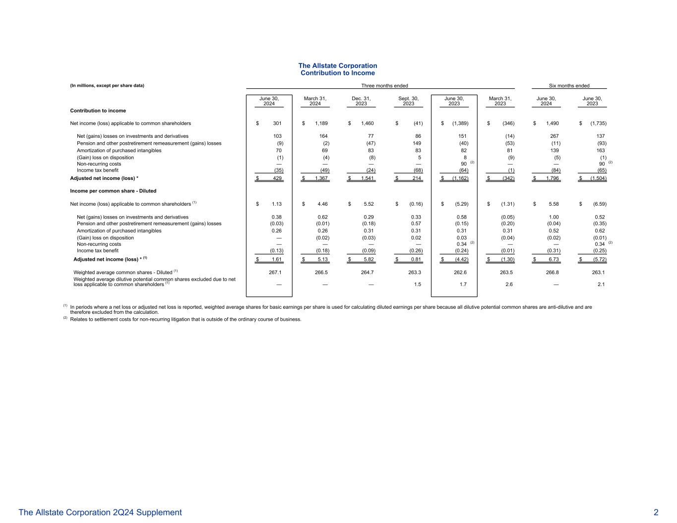 The Allstate Corporation Contribution to Income (In millions, except per share data) Three months ended Six months ended June 30, 2024 March 31, 2024 Dec. 31, 2023 Sept. 30, 2023 June 30, 2023 March 31, 2023 June 30, 2024 June 30, 2023 Contribution to income Net income (loss) applicable to common shareholders $ 301 $ 1,189 $ 1,460 $ (41) $ (1,389) $ (346) $ 1,490 $ (1,735) Net (gains) losses on investments and derivatives 103 164 77 86 151 (14) 267 137 Pension and other postretirement remeasurement (gains) losses (9) (2) (47) 149 (40) (53) (11) (93) Amortization of purchased intangibles 70 69 83 83 82 81 139 163 (Gain) loss on disposition (1) (4) (8) 5 8 (9) (5) (1) Non-recurring costs — — — — 90 (2) — — 90 (2) Income tax benefit (35) (49) (24) (68) (64) (1) (84) (65) Adjusted net income (loss) * $ 429 $ 1,367 $ 1,541 $ 214 $ (1,162) $ (342) $ 1,796 $ (1,504) Income per common share - Diluted Net income (loss) applicable to common shareholders (1) $ 1.13 $ 4.46 $ 5.52 $ (0.16) $ (5.29) $ (1.31) $ 5.58 $ (6.59) Net (gains) losses on investments and derivatives 0.38 0.62 0.29 0.33 0.58 (0.05) 1.00 0.52 Pension and other postretirement remeasurement (gains) losses (0.03) (0.01) (0.18) 0.57 (0.15) (0.20) (0.04) (0.35) Amortization of purchased intangibles 0.26 0.26 0.31 0.31 0.31 0.31 0.52 0.62 (Gain) loss on disposition — (0.02) (0.03) 0.02 0.03 (0.04) (0.02) (0.01) Non-recurring costs — — — — 0.34 (2) — — 0.34 (2) Income tax benefit (0.13) (0.18) (0.09) (0.26) (0.24) (0.01) (0.31) (0.25) Adjusted net income (loss) * (1) $ 1.61 $ 5.13 $ 5.82 $ 0.81 $ (4.42) $ (1.30) $ 6.73 $ (5.72) Weighted average common shares - Diluted (1) 267.1 266.5 264.7 263.3 262.6 263.5 266.8 263.1 Weighted average dilutive potential common shares excluded due to net loss applicable to common shareholders (1) — — — 1.5 1.7 2.6 — 2.1 (1) In periods where a net loss or adjusted net loss is reported, weighted average shares for basic earnings per share is used for calculating diluted earnings per share because all dilutive potential common shares are anti-dilutive and are therefore excluded from the calculation. (2) Relates to settlement costs for non-recurring litigation that is outside of the ordinary course of business. The Allstate Corporation 2Q24 Supplement 2
