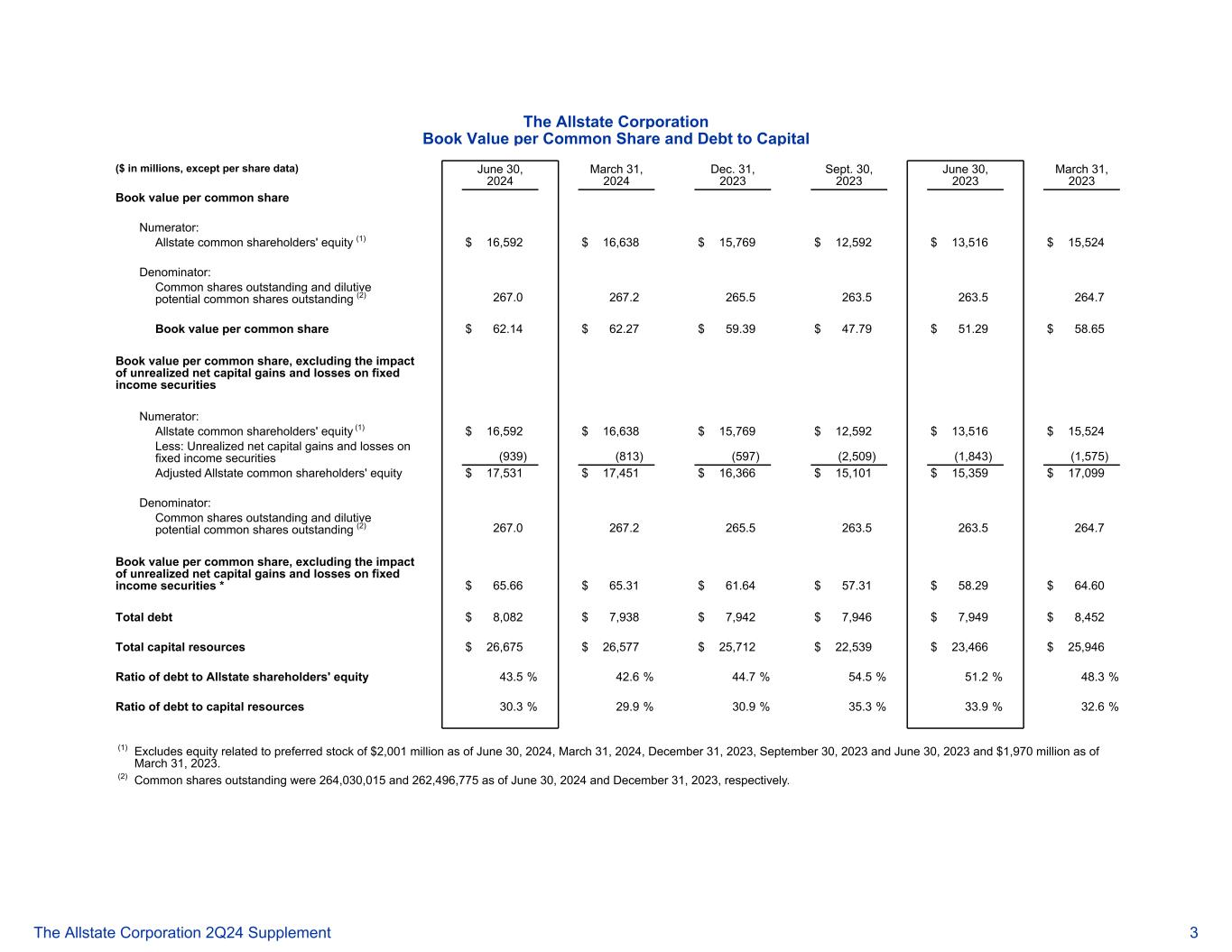 The Allstate Corporation Book Value per Common Share and Debt to Capital ($ in millions, except per share data) June 30, 2024 March 31, 2024 Dec. 31, 2023 Sept. 30, 2023 June 30, 2023 March 31, 2023 Book value per common share Numerator: Allstate common shareholders' equity (1) $ 16,592 $ 16,638 $ 15,769 $ 12,592 $ 13,516 $ 15,524 Denominator: Common shares outstanding and dilutive potential common shares outstanding (2) 267.0 267.2 265.5 263.5 263.5 264.7 Book value per common share $ 62.14 $ 62.27 $ 59.39 $ 47.79 $ 51.29 $ 58.65 Book value per common share, excluding the impact of unrealized net capital gains and losses on fixed income securities Numerator: Allstate common shareholders' equity (1) $ 16,592 $ 16,638 $ 15,769 $ 12,592 $ 13,516 $ 15,524 Less: Unrealized net capital gains and losses on fixed income securities (939) (813) (597) (2,509) (1,843) (1,575) Adjusted Allstate common shareholders' equity $ 17,531 $ 17,451 $ 16,366 $ 15,101 $ 15,359 $ 17,099 Denominator: Common shares outstanding and dilutive potential common shares outstanding (2) 267.0 267.2 265.5 263.5 263.5 264.7 Book value per common share, excluding the impact of unrealized net capital gains and losses on fixed income securities * $ 65.66 $ 65.31 $ 61.64 $ 57.31 $ 58.29 $ 64.60 Total debt $ 8,082 $ 7,938 $ 7,942 $ 7,946 $ 7,949 $ 8,452 Total capital resources $ 26,675 $ 26,577 $ 25,712 $ 22,539 $ 23,466 $ 25,946 Ratio of debt to Allstate shareholders' equity 43.5 % 42.6 % 44.7 % 54.5 % 51.2 % 48.3 % Ratio of debt to capital resources 30.3 % 29.9 % 30.9 % 35.3 % 33.9 % 32.6 % (1) Excludes equity related to preferred stock of $2,001 million as of June 30, 2024, March 31, 2024, December 31, 2023, September 30, 2023 and June 30, 2023 and $1,970 million as of March 31, 2023. (2) Common shares outstanding were 264,030,015 and 262,496,775 as of June 30, 2024 and December 31, 2023, respectively. The Allstate Corporation 2Q24 Supplement 3