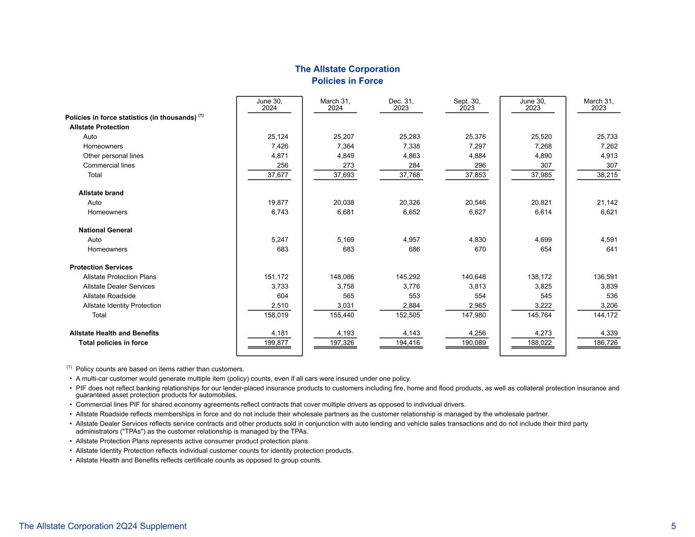 The Allstate Corporation Policies in Force June 30, 2024 March 31, 2024 Dec. 31, 2023 Sept. 30, 2023 June 30, 2023 March 31, 2023 Policies in force statistics (in thousands) (1) Allstate Protection Auto 25,124 25,207 25,283 25,376 25,520 25,733 Homeowners 7,426 7,364 7,338 7,297 7,268 7,262 Other personal lines 4,871 4,849 4,863 4,884 4,890 4,913 Commercial lines 256 273 284 296 307 307 Total 37,677 37,693 37,768 37,853 37,985 38,215 Allstate brand Auto 19,877 20,038 20,326 20,546 20,821 21,142 Homeowners 6,743 6,681 6,652 6,627 6,614 6,621 National General Auto 5,247 5,169 4,957 4,830 4,699 4,591 Homeowners 683 683 686 670 654 641 Protection Services Allstate Protection Plans 151,172 148,086 145,292 140,648 138,172 136,591 Allstate Dealer Services 3,733 3,758 3,776 3,813 3,825 3,839 Allstate Roadside 604 565 553 554 545 536 Allstate Identity Protection 2,510 3,031 2,884 2,965 3,222 3,206 Total 158,019 155,440 152,505 147,980 145,764 144,172 Allstate Health and Benefits 4,181 4,193 4,143 4,256 4,273 4,339 Total policies in force 199,877 197,326 194,416 190,089 188,022 186,726 (1) Policy counts are based on items rather than customers. • A multi-car customer would generate multiple item (policy) counts, even if all cars were insured under one policy. • PIF does not reflect banking relationships for our lender-placed insurance products to customers including fire, home and flood products, as well as collateral protection insurance and guaranteed asset protection products for automobiles. • Commercial lines PIF for shared economy agreements reflect contracts that cover multiple drivers as opposed to individual drivers. • Allstate Roadside reflects memberships in force and do not include their wholesale partners as the customer relationship is managed by the wholesale partner. • Allstate Dealer Services reflects service contracts and other products sold in conjunction with auto lending and vehicle sales transactions and do not include their third party administrators ("TPAs") as the customer relationship is managed by the TPAs. • Allstate Protection Plans represents active consumer product protection plans. • Allstate Identity Protection reflects individual customer counts for identity protection products. • Allstate Health and Benefits reflects certificate counts as opposed to group counts. The Allstate Corporation 2Q24 Supplement 5