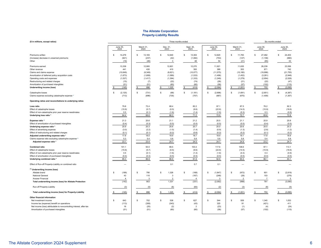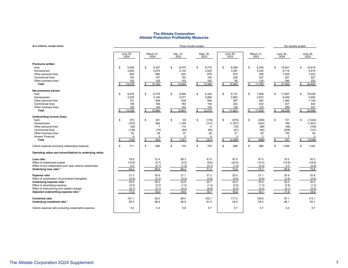 The Allstate Corporation Property-Liability Results ($ in millions, except ratios) Three months ended Six months ended June 30, 2024 March 31, 2024 Dec. 31, 2023 Sept. 30, 2023 June 30, 2023 March 31, 2023 June 30, 2024 June 30, 2023 Premiums written $ 14,279 $ 13,183 $ 12,640 $ 13,304 $ 12,620 $ 11,783 $ 27,462 $ 24,403 (Increase) decrease in unearned premiums (921) (237) (42) (1,082) (753) (127) (1,158) (880) Other (19) (46) 3 48 54 (21) (65) 33 Premiums earned 13,339 12,900 12,601 12,270 11,921 11,635 26,239 23,556 Other revenue 441 430 410 393 389 353 871 742 Claims and claims expense (10,649) (9,349) (8,621) (10,077) (11,575) (10,180) (19,998) (21,755) Amortization of deferred policy acquisition costs (1,673) (1,608) (1,589) (1,533) (1,496) (1,452) (3,281) (2,948) Operating costs and expenses (1,537) (1,417) (1,394) (1,333) (1,249) (1,279) (2,954) (2,528) Restructuring and related charges (15) (7) (22) (74) (26) (21) (22) (47) Amortization of purchased intangibles (51) (51) (60) (60) (58) (57) (102) (115) Underwriting income (loss) $ (145) $ 898 $ 1,325 $ (414) $ (2,094) $ (1,001) $ 753 $ (3,095) Catastrophe losses $ (2,120) $ (731) $ (68) $ (1,181) $ (2,696) $ (1,691) $ (2,851) $ (4,387) Claims expense excluding catastrophe expense ^ (713) (696) (735) (707) (687) (670) (1,409) (1,357) Operating ratios and reconciliations to underlying ratios Loss ratio 79.8 72.4 68.4 82.2 97.1 87.5 76.2 92.3 Effect of catastrophe losses (15.9) (5.7) (0.5) (9.6) (22.6) (14.5) (10.9) (18.6) Effect of non-catastrophe prior year reserve reestimates 0.5 (0.1) (1.6) (1.4) (1.6) (0.3) 0.3 (0.9) Underlying loss ratio * 64.4 66.6 66.3 71.2 72.9 72.7 65.6 72.8 Expense ratio ^ 21.3 20.6 21.1 21.2 20.5 21.1 20.9 20.8 Effect of amortization of purchased intangibles (0.4) (0.3) (0.5) (0.5) (0.5) (0.5) (0.4) (0.5) Underlying expense ratio * 20.9 20.3 20.6 20.7 20.0 20.6 20.5 20.3 Effect of advertising expense (3.0) (2.2) (1.5) (1.4) (0.9) (1.3) (2.6) (1.2) Effect of restructuring and related charges (0.1) (0.1) (0.2) (0.6) (0.2) (0.2) (0.1) (0.2) Adjusted underwriting expense ratio * 17.8 18.0 18.9 18.7 18.9 19.1 17.8 18.9 Claims expense ratio excluding catastrophe expense ^ 5.3 5.4 5.8 5.8 5.8 5.8 5.4 5.8 Adjusted expense ratio * 23.1 23.4 24.7 24.5 24.7 24.9 23.2 24.7 Combined ratio 101.1 93.0 89.5 103.4 117.6 108.6 97.1 113.1 Effect of catastrophe losses (15.9) (5.7) (0.5) (9.6) (22.6) (14.5) (10.9) (18.6) Effect of non-catastrophe prior year reserve reestimates 0.5 (0.1) (1.6) (1.4) (1.6) (0.3) 0.3 (0.9) Effect of amortization of purchased intangibles (0.4) (0.3) (0.5) (0.5) (0.5) (0.5) (0.4) (0.5) Underlying combined ratio * 85.3 86.9 86.9 91.9 92.9 93.3 86.1 93.1 Effect of Run-off Property-Liability on combined ratio — — 0.1 0.7 0.1 — — — (1) Underwriting income (loss) Allstate brand $ (189) $ 790 $ 1,326 $ (168) $ (1,847) $ (972) $ 601 $ (2,819) National General 43 110 3 (167) (248) (28) 153 (276) Answer Financial 4 3 2 4 3 2 7 5 Total underwriting income (loss) for Allstate Protection (142) 903 1,331 (331) (2,092) (998) 761 (3,090) Run-off Property-Liability (3) (5) (6) (83) (2) (3) (8) (5) Total underwriting income (loss) for Property-Liability $ (145) $ 898 $ 1,325 $ (414) $ (2,094) $ (1,001) $ 753 $ (3,095) Other financial information Net investment income $ 643 $ 702 $ 538 $ 627 $ 544 $ 509 $ 1,345 $ 1,053 Income tax (expense) benefit on operations (113) (308) (343) (43) 320 91 (421) 411 Net income (loss) attributable to noncontrolling interest, after-tax 16 (20) (2) 2 (23) (1) (4) (24) Amortization of purchased intangibles (51) (51) (60) (60) (58) (57) (102) (115) The Allstate Corporation 2Q24 Supplement 6