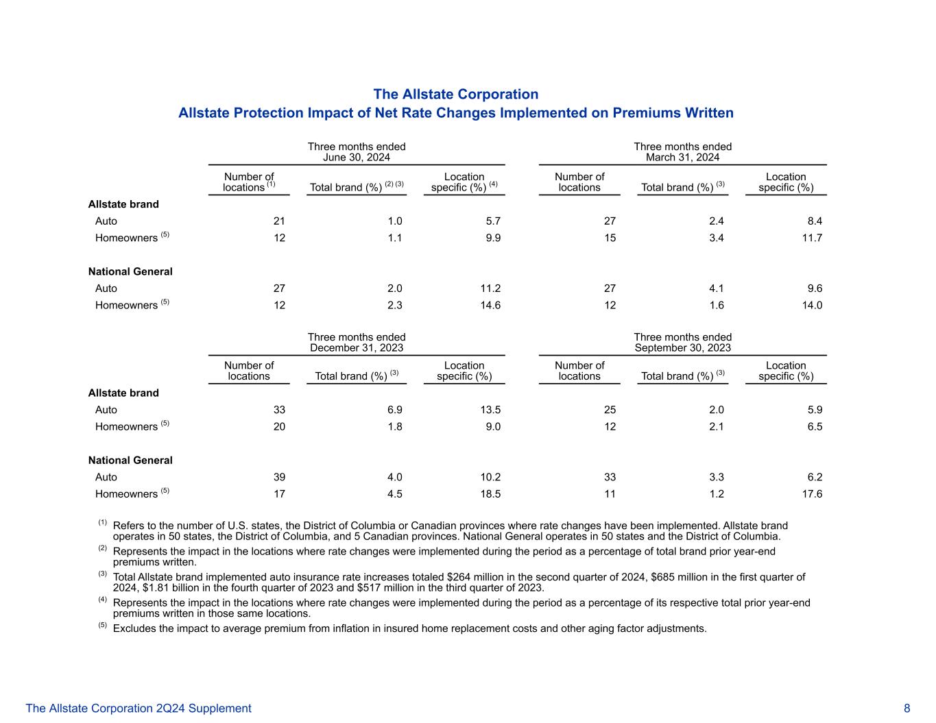 The Allstate Corporation Allstate Protection Profitability Measures ($ in millions, except ratios) Three months ended Six months ended June 30, 2024 March 31, 2024 Dec. 31, 2023 Sept. 30, 2023 June 30, 2023 March 31, 2023 June 30, 2024 June 30, 2023 Premiums written Auto $ 9,284 $ 9,357 $ 8,570 $ 8,770 $ 8,269 $ 8,349 $ 18,641 $ 16,618 Homeowners 3,845 2,874 3,144 3,525 3,381 2,534 6,719 5,915 Other personal lines 845 660 620 676 675 548 1,505 1,223 Commercial lines 150 157 153 140 200 227 307 427 Other business lines ^ 155 135 153 193 95 125 290 220 Total $ 14,279 $ 13,183 $ 12,640 $ 13,304 $ 12,620 $ 11,783 $ 27,462 $ 24,403 Net premiums earned Auto $ 9,079 $ 8,778 $ 8,566 $ 8,345 $ 8,121 $ 7,908 $ 17,857 $ 16,029 Homeowners 3,255 3,154 3,077 2,969 2,883 2,810 6,409 5,693 Other personal lines 701 659 630 608 587 562 1,360 1,149 Commercial lines 158 169 183 194 202 232 327 434 Other business lines 146 140 145 154 128 123 286 251 Total $ 13,339 $ 12,900 $ 12,601 $ 12,270 $ 11,921 $ 11,635 $ 26,239 $ 23,556 Underwriting income (loss) Auto $ 370 $ 351 $ 93 $ (178) $ (678) $ (346) $ 721 $ (1,024) Homeowners (375) 564 1,169 (131) (1,307) (534) 189 (1,841) Other personal lines (55) 7 114 6 (70) (89) (48) (159) Commercial lines (138) (70) (84) (60) (61) (60) (208) (121) Other business lines 52 48 37 28 21 29 100 50 Answer Financial 4 3 2 4 3 2 7 5 Total $ (142) $ 903 $ 1,331 $ (331) $ (2,092) $ (998) $ 761 $ (3,090) Claims expense excluding catastrophe expense $ 711 $ 695 $ 733 $ 703 $ 685 $ 668 $ 1,406 $ 1,353 Operating ratios and reconciliations to underlying ratios Loss ratio 79.8 72.4 68.3 81.5 97.0 87.5 76.2 92.3 Effect of catastrophe losses (15.9) (5.7) (0.5) (9.6) (22.6) (14.5) (10.9) (18.6) Effect of non-catastrophe prior year reserve reestimates 0.5 (0.1) (1.5) (0.7) (1.5) (0.3) 0.3 (0.9) Underlying loss ratio * 64.4 66.6 66.3 71.2 72.9 72.7 65.6 72.8 Expense ratio 21.3 20.6 21.1 21.2 20.5 21.1 20.9 20.8 Effect of amortization of purchased intangibles (0.4) (0.3) (0.5) (0.5) (0.5) (0.5) (0.4) (0.5) Underlying expense ratio * 20.9 20.3 20.6 20.7 20.0 20.6 20.5 20.3 Effect of advertising expense (3.0) (2.2) (1.5) (1.4) (0.9) (1.3) (2.6) (1.2) Effect of restructuring and related charges (0.1) (0.1) (0.2) (0.6) (0.2) (0.2) (0.1) (0.2) Adjusted underwriting expense ratio * 17.8 18.0 18.9 18.7 18.9 19.1 17.8 18.9 Combined ratio 101.1 93.0 89.4 102.7 117.5 108.6 97.1 113.1 Underlying combined ratio * 85.3 86.9 86.9 91.9 92.9 93.3 86.1 93.1 Claims expense ratio excluding catastrophe expense 5.3 5.4 5.8 5.7 5.7 5.7 5.4 5.7 The Allstate Corporation 2Q24 Supplement 7