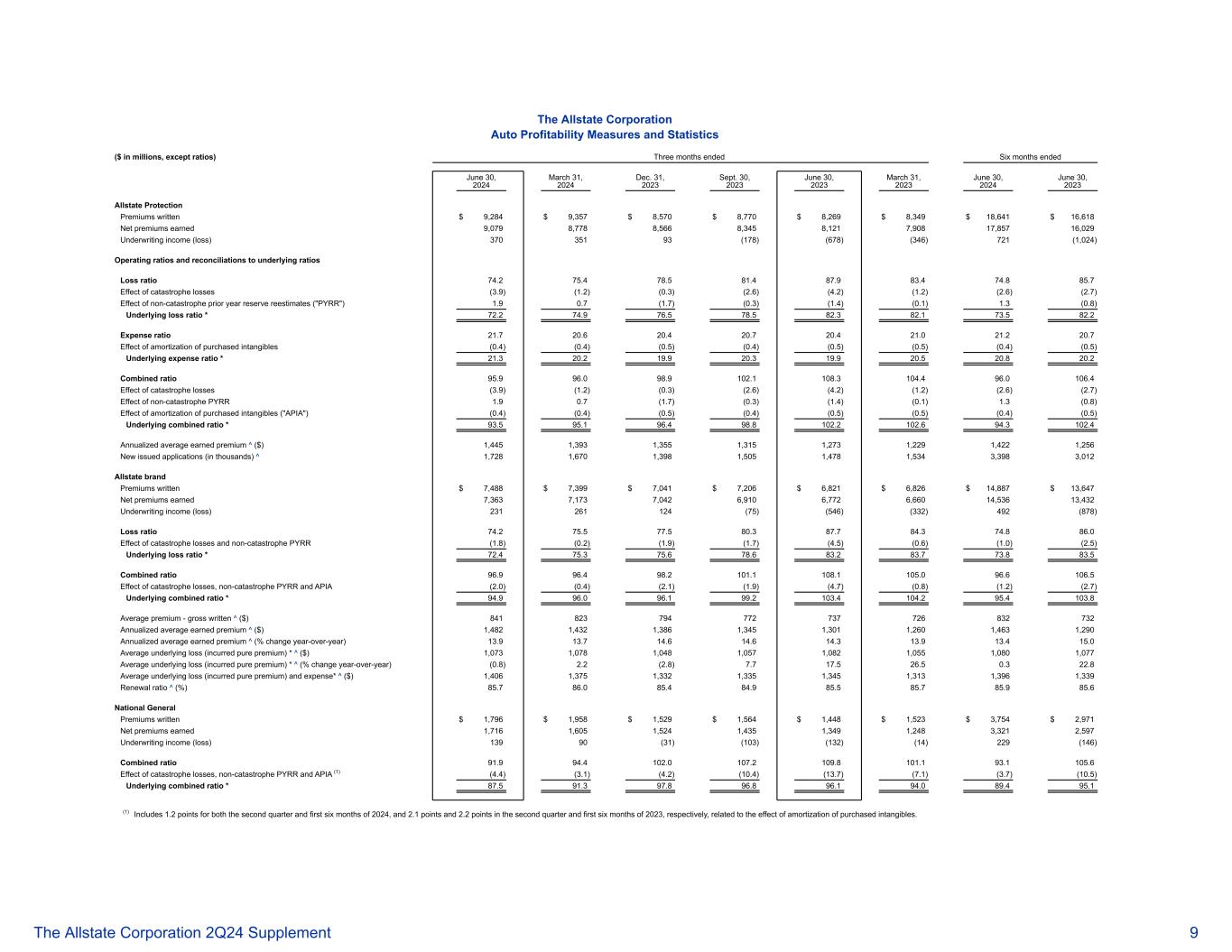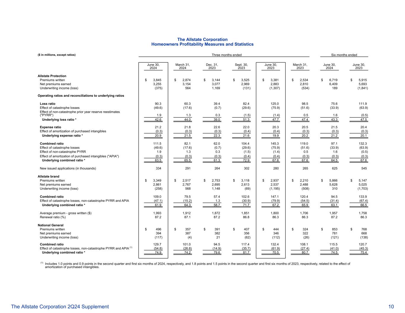 The Allstate Corporation Auto Profitability Measures and Statistics ($ in millions, except ratios) Three months ended Six months ended June 30, 2024 March 31, 2024 Dec. 31, 2023 Sept. 30, 2023 June 30, 2023 March 31, 2023 June 30, 2024 June 30, 2023 Allstate Protection Premiums written $ 9,284 $ 9,357 $ 8,570 $ 8,770 $ 8,269 $ 8,349 $ 18,641 $ 16,618 Net premiums earned 9,079 8,778 8,566 8,345 8,121 7,908 17,857 16,029 Underwriting income (loss) 370 351 93 (178) (678) (346) 721 (1,024) Operating ratios and reconciliations to underlying ratios Loss ratio 74.2 75.4 78.5 81.4 87.9 83.4 74.8 85.7 Effect of catastrophe losses (3.9) (1.2) (0.3) (2.6) (4.2) (1.2) (2.6) (2.7) Effect of non-catastrophe prior year reserve reestimates ("PYRR") 1.9 0.7 (1.7) (0.3) (1.4) (0.1) 1.3 (0.8) Underlying loss ratio * 72.2 74.9 76.5 78.5 82.3 82.1 73.5 82.2 Expense ratio 21.7 20.6 20.4 20.7 20.4 21.0 21.2 20.7 Effect of amortization of purchased intangibles (0.4) (0.4) (0.5) (0.4) (0.5) (0.5) (0.4) (0.5) Underlying expense ratio * 21.3 20.2 19.9 20.3 19.9 20.5 20.8 20.2 Combined ratio 95.9 96.0 98.9 102.1 108.3 104.4 96.0 106.4 Effect of catastrophe losses (3.9) (1.2) (0.3) (2.6) (4.2) (1.2) (2.6) (2.7) Effect of non-catastrophe PYRR 1.9 0.7 (1.7) (0.3) (1.4) (0.1) 1.3 (0.8) Effect of amortization of purchased intangibles ("APIA") (0.4) (0.4) (0.5) (0.4) (0.5) (0.5) (0.4) (0.5) Underlying combined ratio * 93.5 95.1 96.4 98.8 102.2 102.6 94.3 102.4 Annualized average earned premium ^ ($) 1,445 1,393 1,355 1,315 1,273 1,229 1,422 1,256 New issued applications (in thousands) ^ 1,728 1,670 1,398 1,505 1,478 1,534 3,398 3,012 Allstate brand Premiums written $ 7,488 $ 7,399 $ 7,041 $ 7,206 $ 6,821 $ 6,826 $ 14,887 $ 13,647 Net premiums earned 7,363 7,173 7,042 6,910 6,772 6,660 14,536 13,432 Underwriting income (loss) 231 261 124 (75) (546) (332) 492 (878) Loss ratio 74.2 75.5 77.5 80.3 87.7 84.3 74.8 86.0 Effect of catastrophe losses and non-catastrophe PYRR (1.8) (0.2) (1.9) (1.7) (4.5) (0.6) (1.0) (2.5) Underlying loss ratio * 72.4 75.3 75.6 78.6 83.2 83.7 73.8 83.5 Combined ratio 96.9 96.4 98.2 101.1 108.1 105.0 96.6 106.5 Effect of catastrophe losses, non-catastrophe PYRR and APIA (2.0) (0.4) (2.1) (1.9) (4.7) (0.8) (1.2) (2.7) Underlying combined ratio * 94.9 96.0 96.1 99.2 103.4 104.2 95.4 103.8 Average premium - gross written ^ ($) 841 823 794 772 737 726 832 732 Annualized average earned premium ^ ($) 1,482 1,432 1,386 1,345 1,301 1,260 1,463 1,290 Annualized average earned premium ^ (% change year-over-year) 13.9 13.7 14.6 14.6 14.3 13.9 13.4 15.0 Average underlying loss (incurred pure premium) * ^ ($) 1,073 1,078 1,048 1,057 1,082 1,055 1,080 1,077 Average underlying loss (incurred pure premium) * ^ (% change year-over-year) (0.8) 2.2 (2.8) 7.7 17.5 26.5 0.3 22.8 Average underlying loss (incurred pure premium) and expense* ^ ($) 1,406 1,375 1,332 1,335 1,345 1,313 1,396 1,339 Renewal ratio ^ (%) 85.7 86.0 85.4 84.9 85.5 85.7 85.9 85.6 National General Premiums written $ 1,796 $ 1,958 $ 1,529 $ 1,564 $ 1,448 $ 1,523 $ 3,754 $ 2,971 Net premiums earned 1,716 1,605 1,524 1,435 1,349 1,248 3,321 2,597 Underwriting income (loss) 139 90 (31) (103) (132) (14) 229 (146) Combined ratio 91.9 94.4 102.0 107.2 109.8 101.1 93.1 105.6 Effect of catastrophe losses, non-catastrophe PYRR and APIA (1) (4.4) (3.1) (4.2) (10.4) (13.7) (7.1) (3.7) (10.5) Underlying combined ratio * 87.5 91.3 97.8 96.8 96.1 94.0 89.4 95.1 (1) Includes 1.2 points for both the second quarter and first six months of 2024, and 2.1 points and 2.2 points in the second quarter and first six months of 2023, respectively, related to the effect of amortization of purchased intangibles. The Allstate Corporation 2Q24 Supplement 9