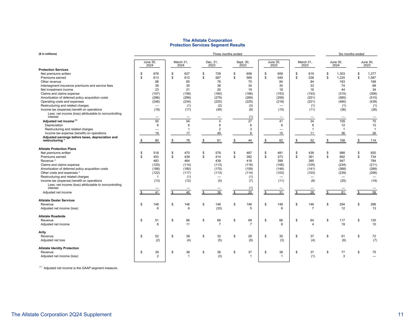 The Allstate Corporation Protection Services Segment Results ($ in millions) Three months ended Six months ended June 30, 2024 March 31, 2024 Dec. 31, 2023 Sept. 30, 2023 June 30, 2023 March 31, 2023 June 30, 2024 June 30, 2023 Protection Services Net premiums written $ 676 $ 627 $ 728 $ 658 $ 658 $ 619 $ 1,303 $ 1,277 Premiums earned $ 613 $ 612 $ 587 $ 569 $ 549 $ 538 $ 1,225 $ 1,087 Other revenue 98 85 76 75 84 84 183 168 Intersegment insurance premiums and service fees 39 35 36 34 35 33 74 68 Net investment income 23 21 20 19 18 16 44 34 Claims and claims expense (157) (158) (160) (166) (153) (153) (315) (306) Amortization of deferred policy acquisition costs (296) (289) (279) (269) (259) (251) (585) (510) Operating costs and expenses (246) (234) (225) (225) (218) (221) (480) (439) Restructuring and related charges — (1) (2) (3) — (1) (1) (1) Income tax (expense) benefit on operations (19) (17) (49) (8) (15) (11) (36) (26) Less: net income (loss) attributable to noncontrolling interest — — — (1) — — — — Adjusted net income (1) 55 54 4 27 41 34 109 75 Depreciation 6 6 6 6 6 6 12 12 Restructuring and related charges — 1 2 3 — 1 1 1 Income tax expense (benefit) on operations 19 17 49 8 15 11 36 26 Adjusted earnings before taxes, depreciation and restructuring * $ 80 $ 78 $ 61 $ 44 $ 62 $ 52 $ 158 $ 114 Allstate Protection Plans Net premiums written $ 518 $ 470 $ 578 $ 487 $ 481 $ 439 $ 988 $ 920 Premiums earned $ 453 $ 439 $ 414 $ 392 $ 373 $ 361 $ 892 $ 734 Revenue ^ 483 464 439 416 399 385 947 784 Claims and claims expense (120) (114) (113) (116) (106) (105) (234) (211) Amortization of deferred policy acquisition costs (188) (180) (170) (159) (148) (141) (368) (289) Other costs and expenses ^ (122) (117) (113) (114) (103) (103) (239) (206) Restructuring and related charges 1 (1) — (1) — — — — Income tax (expense) benefit on operations (13) (12) (5) (7) (11) (8) (25) (19) Less: net income (loss) attributable to noncontrolling interest — — — (1) — — — — Adjusted net income $ 41 $ 40 $ 38 $ 20 $ 31 $ 28 $ 81 $ 59 Allstate Dealer Services Revenue $ 148 $ 146 $ 146 $ 146 $ 148 $ 148 $ 294 $ 296 Adjusted net income (loss) 6 6 (33) 5 6 7 12 13 Allstate Roadside Revenue $ 51 $ 66 $ 66 $ 69 $ 66 $ 64 $ 117 $ 130 Adjusted net income 8 11 7 7 6 4 19 10 Arity Revenue $ 52 $ 39 $ 32 $ 29 $ 35 $ 37 $ 91 $ 72 Adjusted net loss (2) (4) (5) (6) (3) (4) (6) (7) Allstate Identity Protection Revenue $ 39 $ 38 $ 36 $ 37 $ 38 $ 37 $ 77 $ 75 Adjusted net income (loss) 2 1 (3) 1 1 (1) 3 — (1) Adjusted net income is the GAAP segment measure. The Allstate Corporation 2Q24 Supplement 11
