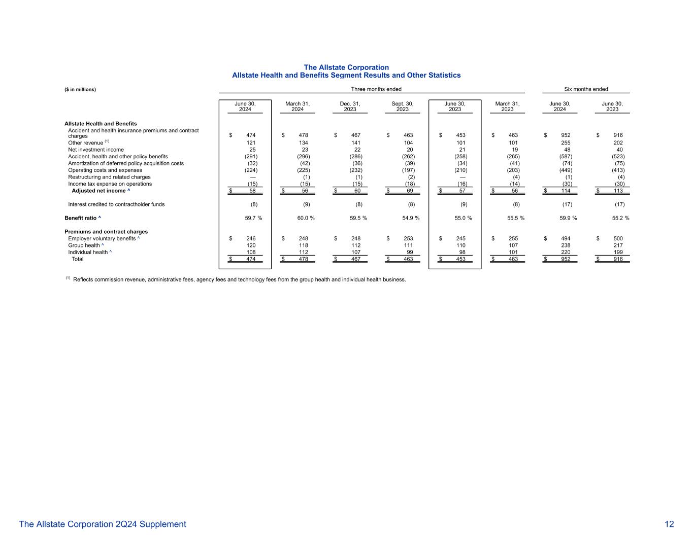 The Allstate Corporation Allstate Health and Benefits Segment Results and Other Statistics ($ in millions) Three months ended Six months ended June 30, 2024 March 31, 2024 Dec. 31, 2023 Sept. 30, 2023 June 30, 2023 March 31, 2023 June 30, 2024 June 30, 2023 Allstate Health and Benefits Accident and health insurance premiums and contract charges $ 474 $ 478 $ 467 $ 463 $ 453 $ 463 $ 952 $ 916 Other revenue (1) 121 134 141 104 101 101 255 202 Net investment income 25 23 22 20 21 19 48 40 Accident, health and other policy benefits (291) (296) (286) (262) (258) (265) (587) (523) Amortization of deferred policy acquisition costs (32) (42) (36) (39) (34) (41) (74) (75) Operating costs and expenses (224) (225) (232) (197) (210) (203) (449) (413) Restructuring and related charges — (1) (1) (2) — (4) (1) (4) Income tax expense on operations (15) (15) (15) (18) (16) (14) (30) (30) Adjusted net income ^ $ 58 $ 56 $ 60 $ 69 $ 57 $ 56 $ 114 $ 113 Interest credited to contractholder funds (8) (9) (8) (8) (9) (8) (17) (17) Benefit ratio ^ 59.7 % 60.0 % 59.5 % 54.9 % 55.0 % 55.5 % 59.9 % 55.2 % Premiums and contract charges Employer voluntary benefits ^ $ 246 $ 248 $ 248 $ 253 $ 245 $ 255 $ 494 $ 500 Group health ^ 120 118 112 111 110 107 238 217 Individual health ^ 108 112 107 99 98 101 220 199 Total $ 474 $ 478 $ 467 $ 463 $ 453 $ 463 $ 952 $ 916 (1) Reflects commission revenue, administrative fees, agency fees and technology fees from the group health and individual health business. The Allstate Corporation 2Q24 Supplement 12