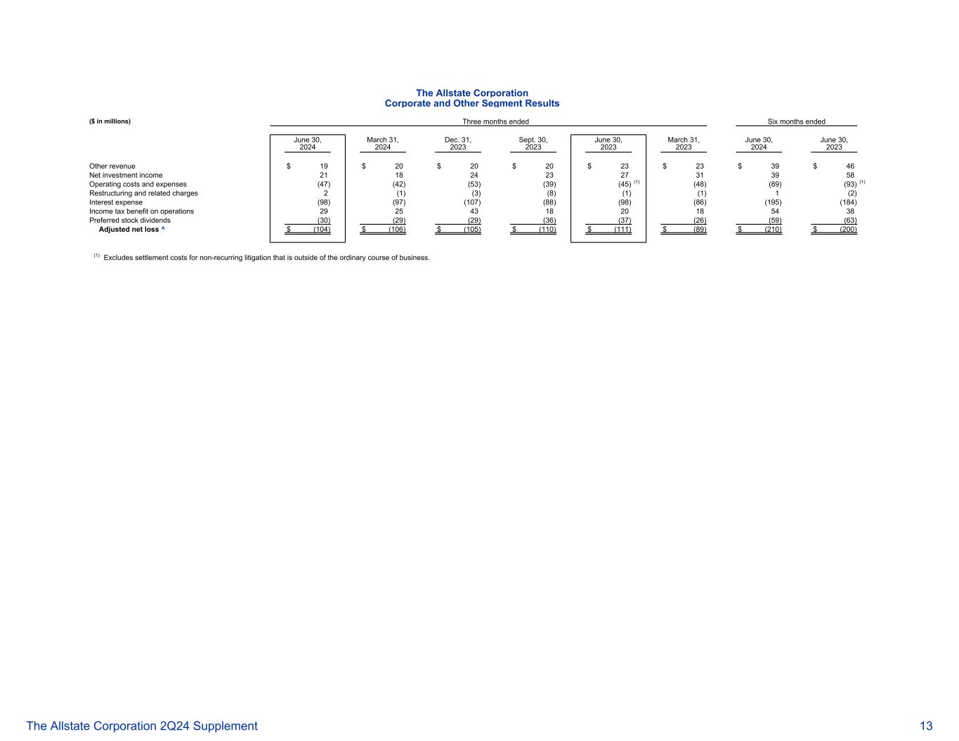 The Allstate Corporation Corporate and Other Segment Results ($ in millions) Three months ended Six months ended June 30, 2024 March 31, 2024 Dec. 31, 2023 Sept. 30, 2023 June 30, 2023 March 31, 2023 June 30, 2024 June 30, 2023 Other revenue $ 19 $ 20 $ 20 $ 20 $ 23 $ 23 $ 39 $ 46 Net investment income 21 18 24 23 27 31 39 58 Operating costs and expenses (47) (42) (53) (39) (45) (1) (48) (89) (93) (1) Restructuring and related charges 2 (1) (3) (8) (1) (1) 1 (2) Interest expense (98) (97) (107) (88) (98) (86) (195) (184) Income tax benefit on operations 29 25 43 18 20 18 54 38 Preferred stock dividends (30) (29) (29) (36) (37) (26) (59) (63) Adjusted net loss ^ $ (104) $ (106) $ (105) $ (110) $ (111) $ (89) $ (210) $ (200) (1) Excludes settlement costs for non-recurring litigation that is outside of the ordinary course of business. The Allstate Corporation 2Q24 Supplement 13