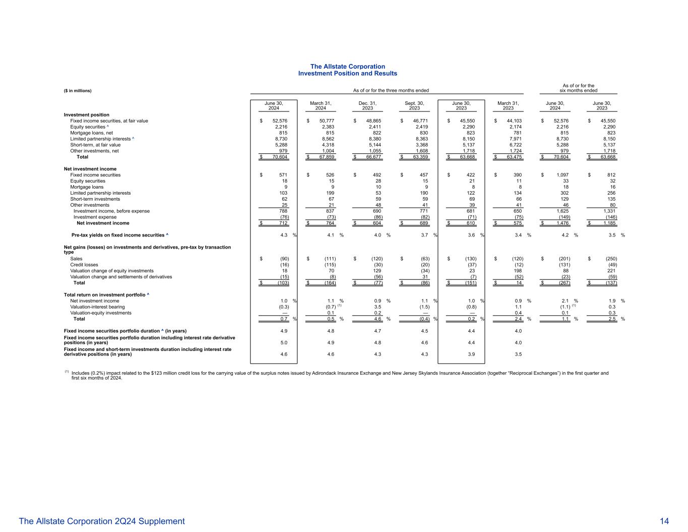 The Allstate Corporation Investment Position and Results ($ in millions) As of or for the three months ended As of or for the six months ended June 30, 2024 March 31, 2024 Dec. 31, 2023 Sept. 30, 2023 June 30, 2023 March 31, 2023 June 30, 2024 June 30, 2023 Investment position Fixed income securities, at fair value $ 52,576 $ 50,777 $ 48,865 $ 46,771 $ 45,550 $ 44,103 $ 52,576 $ 45,550 Equity securities ^ 2,216 2,383 2,411 2,419 2,290 2,174 2,216 2,290 Mortgage loans, net 815 815 822 830 823 781 815 823 Limited partnership interests ^ 8,730 8,562 8,380 8,363 8,150 7,971 8,730 8,150 Short-term, at fair value 5,288 4,318 5,144 3,368 5,137 6,722 5,288 5,137 Other investments, net 979 1,004 1,055 1,608 1,718 1,724 979 1,718 Total $ 70,604 $ 67,859 $ 66,677 $ 63,359 $ 63,668 $ 63,475 $ 70,604 $ 63,668 Net investment income Fixed income securities $ 571 $ 526 $ 492 $ 457 $ 422 $ 390 $ 1,097 $ 812 Equity securities 18 15 28 15 21 11 33 32 Mortgage loans 9 9 10 9 8 8 18 16 Limited partnership interests 103 199 53 190 122 134 302 256 Short-term investments 62 67 59 59 69 66 129 135 Other investments 25 21 48 41 39 41 46 80 Investment income, before expense 788 837 690 771 681 650 1,625 1,331 Investment expense (76) (73) (86) (82) (71) (75) (149) (146) Net investment income $ 712 $ 764 $ 604 $ 689 $ 610 $ 575 $ 1,476 $ 1,185 Pre-tax yields on fixed income securities ^ 4.3 % 4.1 % 4.0 % 3.7 % 3.6 % 3.4 % 4.2 % 3.5 % Net gains (losses) on investments and derivatives, pre-tax by transaction type Sales $ (90) $ (111) $ (120) $ (63) $ (130) $ (120) $ (201) $ (250) Credit losses (16) (115) (30) (20) (37) (12) (131) (49) Valuation change of equity investments 18 70 129 (34) 23 198 88 221 Valuation change and settlements of derivatives (15) (8) (56) 31 (7) (52) (23) (59) Total $ (103) $ (164) $ (77) $ (86) $ (151) $ 14 $ (267) $ (137) Total return on investment portfolio ^ Net investment income 1.0 % 1.1 % 0.9 % 1.1 % 1.0 % 0.9 % 2.1 % 1.9 % Valuation-interest bearing (0.3) (0.7) (1) 3.5 (1.5) (0.8) 1.1 (1.1) (1) 0.3 Valuation-equity investments — 0.1 0.2 — — 0.4 0.1 0.3 Total 0.7 % 0.5 % 4.6 % (0.4) % 0.2 % 2.4 % 1.1 % 2.5 % Fixed income securities portfolio duration ^ (in years) 4.9 4.8 4.7 4.5 4.4 4.0 Fixed income securities portfolio duration including interest rate derivative positions (in years) 5.0 4.9 4.8 4.6 4.4 4.0 Fixed income and short-term investments duration including interest rate derivative positions (in years) 4.6 4.6 4.3 4.3 3.9 3.5 (1) Includes (0.2%) impact related to the $123 million credit loss for the carrying value of the surplus notes issued by Adirondack Insurance Exchange and New Jersey Skylands Insurance Association (together “Reciprocal Exchanges”) in the first quarter and first six months of 2024. The Allstate Corporation 2Q24 Supplement 14