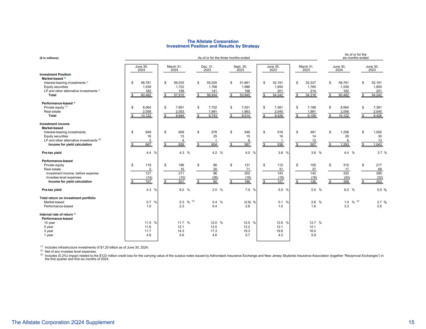 The Allstate Corporation Investment Position and Results by Strategy ($ in millions) As of or for the three months ended As of or for the six months ended June 30, 2024 March 31, 2024 Dec. 31, 2023 Sept. 30, 2023 June 30, 2023 March 31, 2023 June 30, 2024 June 30, 2023 Investment Position Market-based ^ Interest-bearing investments ^ $ 58,781 $ 56,035 $ 55,025 $ 51,661 $ 52,191 $ 52,337 $ 58,781 $ 52,191 Equity securities 1,539 1,722 1,768 1,986 1,850 1,765 1,539 1,850 LP and other alternative investments ^ 162 158 141 198 201 214 162 201 Total $ 60,482 $ 57,915 $ 56,934 $ 53,845 $ 54,242 $ 54,316 $ 60,482 $ 54,242 Performance-based ^ Private equity (1) $ 8,064 $ 7,891 $ 7,752 $ 7,551 $ 7,381 $ 7,168 $ 8,064 $ 7,381 Real estate 2,058 2,053 1,991 1,963 2,045 1,991 2,058 2,045 Total $ 10,122 $ 9,944 $ 9,743 $ 9,514 $ 9,426 $ 9,159 $ 10,122 $ 9,426 Investment income Market-based Interest-bearing investments $ 649 $ 609 $ 578 $ 546 $ 519 $ 481 $ 1,258 $ 1,000 Equity securities 16 13 25 15 16 14 29 30 LP and other alternative investments (2) 2 4 1 6 1 12 6 13 Income for yield calculation $ 667 $ 626 $ 604 $ 567 $ 536 $ 507 $ 1,293 $ 1,043 Pre-tax yield 4.4 % 4.3 % 4.2 % 4.0 % 3.8 % 3.6 % 4.4 % 3.7 % Performance-based Private equity $ 119 $ 196 $ 66 $ 131 $ 112 $ 105 $ 315 $ 217 Real estate 2 15 20 71 31 37 17 68 Investment income, before expense 121 211 86 202 143 142 332 285 Investee level expenses (14) (10) (26) (16) (16) (16) (24) (32) Income for yield calculation $ 107 $ 201 $ 60 $ 186 $ 127 $ 126 $ 308 $ 253 Pre-tax yield 4.3 % 8.2 % 2.5 % 7.9 % 5.5 % 5.5 % 6.2 % 5.5 % Total return on investment portfolio Market-based 0.7 % 0.3 % (3) 5.4 % (0.8) % 0.1 % 2.6 % 1.0 % (3) 2.7 % Performance-based 1.0 2.3 0.4 2.8 1.0 1.6 3.3 2.6 Internal rate of return ^ Performance-based 10 year 11.5 % 11.7 % 12.0 % 12.5 % 12.6 % 12.7 % 5 year 11.6 12.1 12.0 12.2 12.1 12.1 3 year 11.7 14.3 17.3 19.3 19.6 16.0 1 year 4.9 5.6 4.6 5.7 4.2 5.9 (1) Includes infrastructure investments of $1.20 billion as of June 30, 2024. (2) Net of any investee level expenses. (3) Includes (0.2%) impact related to the $123 million credit loss for the carrying value of the surplus notes issued by Adirondack Insurance Exchange and New Jersey Skylands Insurance Association (together “Reciprocal Exchanges”) in the first quarter and first six months of 2024. The Allstate Corporation 2Q24 Supplement 15