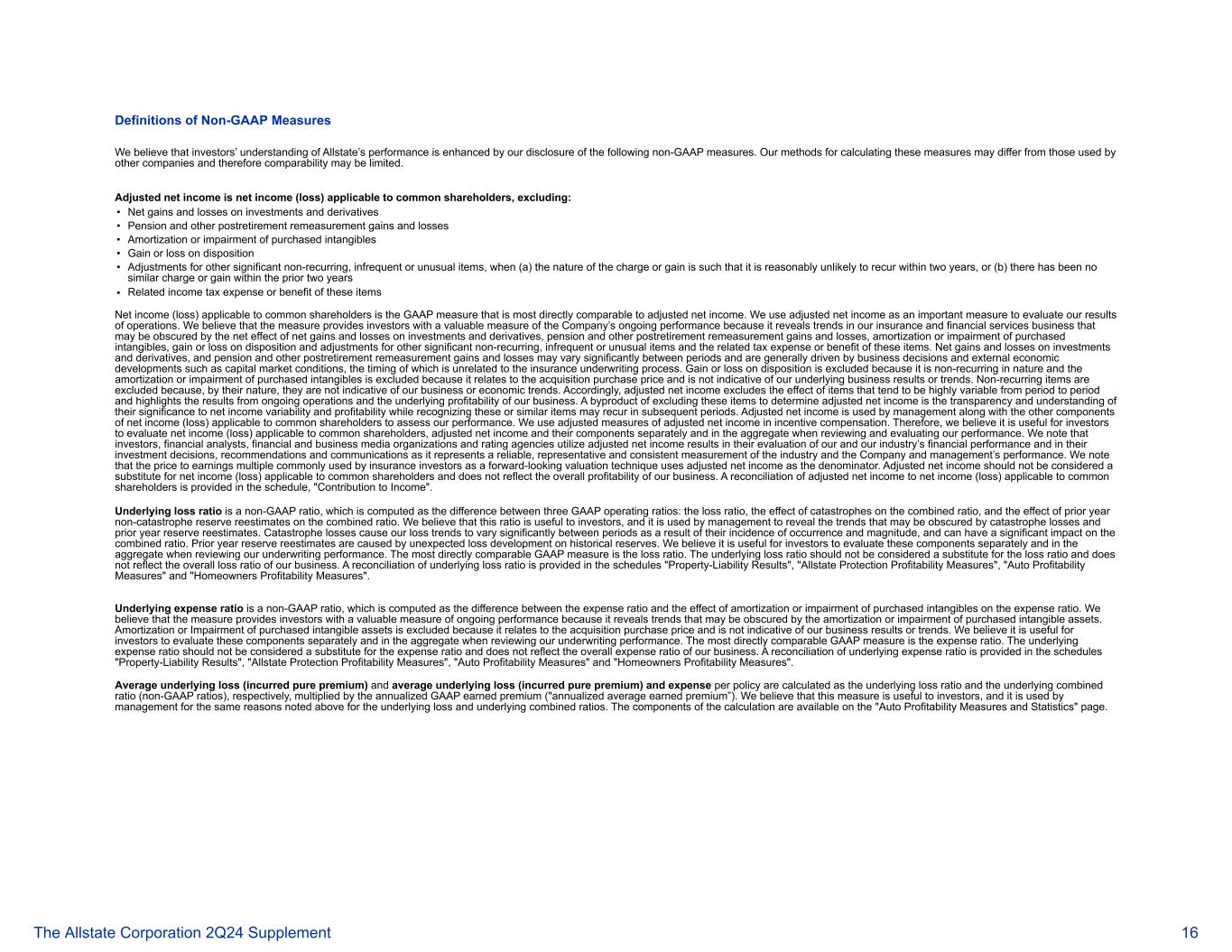 Definitions of Non-GAAP Measures We believe that investors’ understanding of Allstate’s performance is enhanced by our disclosure of the following non-GAAP measures. Our methods for calculating these measures may differ from those used by other companies and therefore comparability may be limited. Adjusted net income is net income (loss) applicable to common shareholders, excluding: • Net gains and losses on investments and derivatives • Pension and other postretirement remeasurement gains and losses • Amortization or impairment of purchased intangibles • Gain or loss on disposition • Adjustments for other significant non-recurring, infrequent or unusual items, when (a) the nature of the charge or gain is such that it is reasonably unlikely to recur within two years, or (b) there has been no similar charge or gain within the prior two years • Related income tax expense or benefit of these items Net income (loss) applicable to common shareholders is the GAAP measure that is most directly comparable to adjusted net income. We use adjusted net income as an important measure to evaluate our results of operations. We believe that the measure provides investors with a valuable measure of the Company’s ongoing performance because it reveals trends in our insurance and financial services business that may be obscured by the net effect of net gains and losses on investments and derivatives, pension and other postretirement remeasurement gains and losses, amortization or impairment of purchased intangibles, gain or loss on disposition and adjustments for other significant non-recurring, infrequent or unusual items and the related tax expense or benefit of these items. Net gains and losses on investments and derivatives, and pension and other postretirement remeasurement gains and losses may vary significantly between periods and are generally driven by business decisions and external economic developments such as capital market conditions, the timing of which is unrelated to the insurance underwriting process. Gain or loss on disposition is excluded because it is non-recurring in nature and the amortization or impairment of purchased intangibles is excluded because it relates to the acquisition purchase price and is not indicative of our underlying business results or trends. Non-recurring items are excluded because, by their nature, they are not indicative of our business or economic trends. Accordingly, adjusted net income excludes the effect of items that tend to be highly variable from period to period and highlights the results from ongoing operations and the underlying profitability of our business. A byproduct of excluding these items to determine adjusted net income is the transparency and understanding of their significance to net income variability and profitability while recognizing these or similar items may recur in subsequent periods. Adjusted net income is used by management along with the other components of net income (loss) applicable to common shareholders to assess our performance. We use adjusted measures of adjusted net income in incentive compensation. Therefore, we believe it is useful for investors to evaluate net income (loss) applicable to common shareholders, adjusted net income and their components separately and in the aggregate when reviewing and evaluating our performance. We note that investors, financial analysts, financial and business media organizations and rating agencies utilize adjusted net income results in their evaluation of our and our industry’s financial performance and in their investment decisions, recommendations and communications as it represents a reliable, representative and consistent measurement of the industry and the Company and management’s performance. We note that the price to earnings multiple commonly used by insurance investors as a forward-looking valuation technique uses adjusted net income as the denominator. Adjusted net income should not be considered a substitute for net income (loss) applicable to common shareholders and does not reflect the overall profitability of our business. A reconciliation of adjusted net income to net income (loss) applicable to common shareholders is provided in the schedule, "Contribution to Income". Underlying loss ratio is a non-GAAP ratio, which is computed as the difference between three GAAP operating ratios: the loss ratio, the effect of catastrophes on the combined ratio, and the effect of prior year non-catastrophe reserve reestimates on the combined ratio. We believe that this ratio is useful to investors, and it is used by management to reveal the trends that may be obscured by catastrophe losses and prior year reserve reestimates. Catastrophe losses cause our loss trends to vary significantly between periods as a result of their incidence of occurrence and magnitude, and can have a significant impact on the combined ratio. Prior year reserve reestimates are caused by unexpected loss development on historical reserves. We believe it is useful for investors to evaluate these components separately and in the aggregate when reviewing our underwriting performance. The most directly comparable GAAP measure is the loss ratio. The underlying loss ratio should not be considered a substitute for the loss ratio and does not reflect the overall loss ratio of our business. A reconciliation of underlying loss ratio is provided in the schedules "Property-Liability Results", "Allstate Protection Profitability Measures", "Auto Profitability Measures" and "Homeowners Profitability Measures". Underlying expense ratio is a non-GAAP ratio, which is computed as the difference between the expense ratio and the effect of amortization or impairment of purchased intangibles on the expense ratio. We believe that the measure provides investors with a valuable measure of ongoing performance because it reveals trends that may be obscured by the amortization or impairment of purchased intangible asse