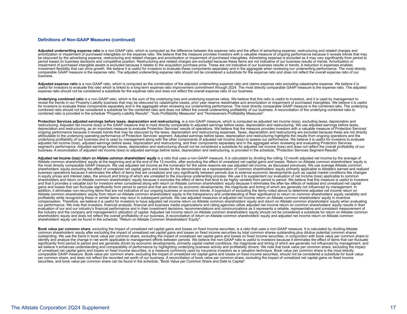Definitions of Non-GAAP Measures (continued) Adjusted underwriting expense ratio is a non-GAAP ratio, which is computed as the difference between the expense ratio and the effect of advertising expense, restructuring and related charges and amortization or impairment of purchased intangibles on the expense ratio. We believe that the measure provides investors with a valuable measure of ongoing performance because it reveals trends that may be obscured by the advertising expense, restructuring and related charges and amortization or impairment of purchased intangibles. Advertising expense is excluded as it may vary significantly from period to period based on business decisions and competitive position. Restructuring and related charges are excluded because these items are not indicative of our business results or trends. Amortization or impairment of purchased intangible assets is excluded because it relates to the acquisition purchase price. These are not indicative of our business results or trends. A reduction in expenses enables investment flexibility that can drive growth. We believe it is useful for investors to evaluate these components separately and in the aggregate when reviewing our underwriting performance. The most directly comparable GAAP measure is the expense ratio. The adjusted underwriting expense ratio should not be considered a substitute for the expense ratio and does not reflect the overall expense ratio of our business. Adjusted expense ratio is a non-GAAP ratio, which is computed as the combination of the adjusted underwriting expense ratio and claims expense ratio excluding catastrophe expense. We believe it is useful for investors to evaluate this ratio which is linked to a long-term expense ratio improvement commitment through 2024. The most directly comparable GAAP measure is the expense ratio. The adjusted expense ratio should not be considered a substitute for the expense ratio and does not reflect the overall expense ratio of our business. Underlying combined ratio is a non-GAAP ratio, which is the sum of the underlying loss and underlying expense ratios. We believe that this ratio is useful to investors, and it is used by management to reveal the trends in our Property-Liability business that may be obscured by catastrophe losses, prior year reserve reestimates and amortization or impairment of purchased intangibles. We believe it is useful for investors to evaluate these components separately and in the aggregate when reviewing our underwriting performance. The most directly comparable GAAP measure is the combined ratio. The underlying combined ratio should not be considered a substitute for the combined ratio and does not reflect the overall underwriting profitability of our business. A reconciliation of the underlying combined ratio to combined ratio is provided in the schedule "Property-Liability Results", "Auto Profitability Measures" and "Homeowners Profitability Measures". Protection Services adjusted earnings before taxes, depreciation and restructuring, is a non-GAAP measure, which is computed as adjusted net income (loss), excluding taxes, depreciation and restructuring. Adjusted net income (loss) is the GAAP measure that is most directly comparable to adjusted earnings before taxes, depreciation and restructuring. We use adjusted earnings before taxes, depreciation and restructuring, as an important measure to evaluate Protection Services' results of operations. We believe that the measure provides investors with a valuable measure of Protection Services' ongoing performance because it reveals trends that may be obscured by the taxes, depreciation and restructuring expenses. Taxes, depreciation and restructuring are excluded because these are not directly attributable to the underlying operating performance of Protection Services' segment. Adjusted earnings before taxes, depreciation and restructuring highlights the results from ongoing operations and the underlying profitability of our business and is used by management along with the other components of adjusted net income (loss) to assess our performance. We believe it is useful for investors to evaluate adjusted net income (loss), adjusted earnings before taxes, depreciation and restructuring, and their components separately and in the aggregate when reviewing and evaluating Protection Services segment’s performance. Adjusted earnings before taxes, depreciation and restructuring should not be considered a substitute for adjusted net income (loss) and does not reflect the overall profitability of our business. A reconciliation of adjusted net income (loss) to adjusted earnings before taxes, depreciation and restructuring, is provided in the schedule, "Protection Services Segment Results". Adjusted net income (loss) return on Allstate common shareholders’ equity is a ratio that uses a non-GAAP measure. It is calculated by dividing the rolling 12-month adjusted net income by the average of Allstate common shareholders’ equity at the beginning and at the end of the 12-months, after excluding the effect of unrealized net capital gains and losses. Return on Allstate common shareholders’ equity is the most directly comparable GAAP measure. We use adjusted net income as the numerator for the same reasons we use adjusted net income, as discussed previously. We use average Allstate common shareholders’ equity excluding the effect of unrealized net capital gains and losses for the denominator as a representation of common shareholders’ equity primarily applicable to Allstate's earned and realized business operations because it eliminates the effect of items that are unrealized and vary significantly between periods due to external economic developments such as capital market conditions like changes in equity prices and interest rates, the amount and timing of which are unrelated to the insurance underwriting process. We use it to supplement our evaluation of net income (loss) applicable to 