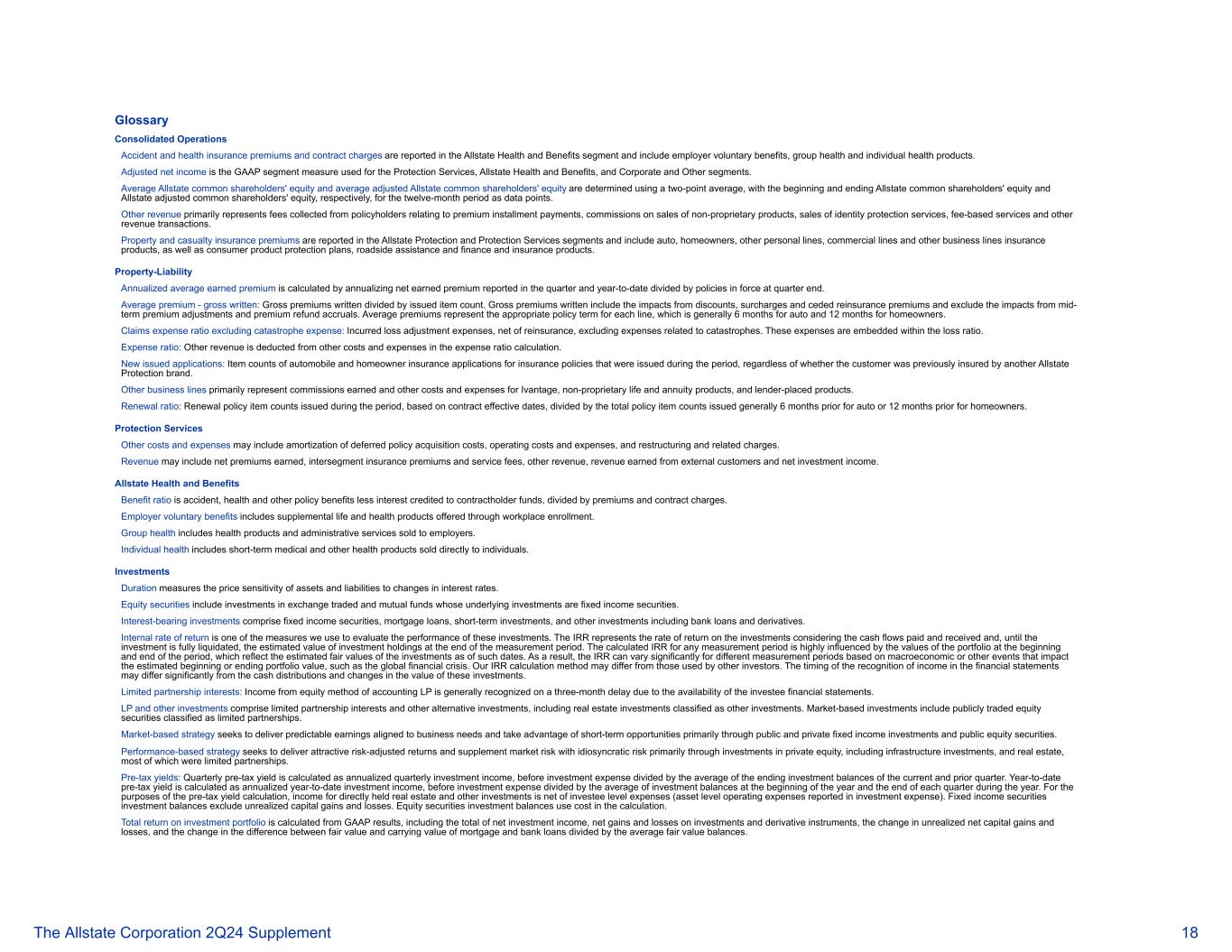 Glossary Consolidated Operations Accident and health insurance premiums and contract charges are reported in the Allstate Health and Benefits segment and include employer voluntary benefits, group health and individual health products. Adjusted net income is the GAAP segment measure used for the Protection Services, Allstate Health and Benefits, and Corporate and Other segments. Average Allstate common shareholders' equity and average adjusted Allstate common shareholders' equity are determined using a two-point average, with the beginning and ending Allstate common shareholders' equity and Allstate adjusted common shareholders' equity, respectively, for the twelve-month period as data points. Other revenue primarily represents fees collected from policyholders relating to premium installment payments, commissions on sales of non-proprietary products, sales of identity protection services, fee-based services and other revenue transactions. Property and casualty insurance premiums are reported in the Allstate Protection and Protection Services segments and include auto, homeowners, other personal lines, commercial lines and other business lines insurance products, as well as consumer product protection plans, roadside assistance and finance and insurance products. Property-Liability Annualized average earned premium is calculated by annualizing net earned premium reported in the quarter and year-to-date divided by policies in force at quarter end. Average premium - gross written: Gross premiums written divided by issued item count. Gross premiums written include the impacts from discounts, surcharges and ceded reinsurance premiums and exclude the impacts from mid- term premium adjustments and premium refund accruals. Average premiums represent the appropriate policy term for each line, which is generally 6 months for auto and 12 months for homeowners. Claims expense ratio excluding catastrophe expense: Incurred loss adjustment expenses, net of reinsurance, excluding expenses related to catastrophes. These expenses are embedded within the loss ratio. Expense ratio: Other revenue is deducted from other costs and expenses in the expense ratio calculation. New issued applications: Item counts of automobile and homeowner insurance applications for insurance policies that were issued during the period, regardless of whether the customer was previously insured by another Allstate Protection brand. Other business lines primarily represent commissions earned and other costs and expenses for Ivantage, non-proprietary life and annuity products, and lender-placed products. Renewal ratio: Renewal policy item counts issued during the period, based on contract effective dates, divided by the total policy item counts issued generally 6 months prior for auto or 12 months prior for homeowners. Protection Services Other costs and expenses may include amortization of deferred policy acquisition costs, operating costs and expenses, and restructuring and related charges. Revenue may include net premiums earned, intersegment insurance premiums and service fees, other revenue, revenue earned from external customers and net investment income. Allstate Health and Benefits Benefit ratio is accident, health and other policy benefits less interest credited to contractholder funds, divided by premiums and contract charges. Employer voluntary benefits includes supplemental life and health products offered through workplace enrollment. Group health includes health products and administrative services sold to employers. Individual health includes short-term medical and other health products sold directly to individuals. Investments Duration measures the price sensitivity of assets and liabilities to changes in interest rates. Equity securities include investments in exchange traded and mutual funds whose underlying investments are fixed income securities. Interest-bearing investments comprise fixed income securities, mortgage loans, short-term investments, and other investments including bank loans and derivatives. Internal rate of return is one of the measures we use to evaluate the performance of these investments. The IRR represents the rate of return on the investments considering the cash flows paid and received and, until the investment is fully liquidated, the estimated value of investment holdings at the end of the measurement period. The calculated IRR for any measurement period is highly influenced by the values of the portfolio at the beginning and end of the period, which reflect the estimated fair values of the investments as of such dates. As a result, the IRR can vary significantly for different measurement periods based on macroeconomic or other events that impact the estimated beginning or ending portfolio value, such as the global financial crisis. Our IRR calculation method may differ from those used by other investors. The timing of the recognition of income in the financial statements may differ significantly from the cash distributions and changes in the value of these investments. Limited partnership interests: Income from equity method of accounting LP is generally recognized on a three-month delay due to the availability of the investee financial statements. LP and other investments comprise limited partnership interests and other alternative investments, including real estate investments classified as other investments. Market-based investments include publicly traded equity securities classified as limited partnerships. Market-based strategy seeks to deliver predictable earnings aligned to business needs and take advantage of short-term opportunities primarily through public and private fixed income investments and public equity securities. Performance-based strategy seeks to deliver attractive risk-adjusted returns and supplement market risk with idiosyncratic risk primarily through investments in private equity, including infrastructure investments, and real estate, most of which were limited