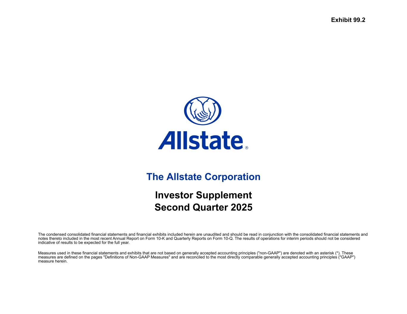 The Allstate Corporation Investor Supplement Second Quarter 2025 The condensed consolidated financial statements and financial exhibits included herein are unaudited and should be read in conjunction with the consolidated financial statements and notes thereto included in the most recent Annual Report on Form 10-K and Quarterly Reports on Form 10-Q. The results of operations for interim periods should not be considered indicative of results to be expected for the full year. Measures used in these financial statements and exhibits that are not based on generally accepted accounting principles ("non-GAAP") are denoted with an asterisk (*). These measures are defined on the pages "Definitions of Non-GAAP Measures" and are reconciled to the most directly comparable generally accepted accounting principles ("GAAP") measure herein. Exhibit 99.2