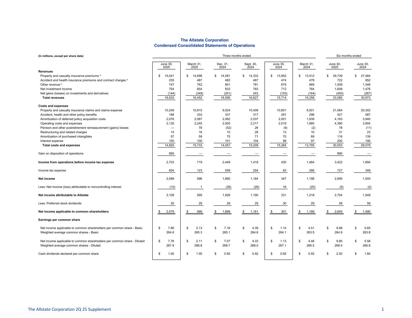 The Allstate Corporation Condensed Consolidated Statements of Operations (In millions, except per share data) Three months ended Six months ended June 30, 2025 March 31, 2025 Dec. 31, 2024 Sept. 30, 2024 June 30, 2024 March 31, 2024 June 30, 2025 June 30, 2024 Revenues Property and casualty insurance premiums ^ $ 15,041 $ 14,698 $ 14,591 $ 14,333 $ 13,952 $ 13,512 $ 29,739 $ 27,464 Accident and health insurance premiums and contract charges ^ 235 487 482 487 474 478 722 952 Other revenue ^ 747 762 801 781 679 669 1,509 1,348 Net investment income 754 854 833 783 712 764 1,608 1,476 Net gains (losses) on investments and derivatives (144) (349) (201) 243 (103) (164) (493) (267) Total revenues 16,633 16,452 16,506 16,627 15,714 15,259 33,085 30,973 Costs and expenses Property and casualty insurance claims and claims expense 10,249 10,815 9,024 10,409 10,801 9,501 21,064 20,302 Accident, health and other policy benefits 188 333 337 317 291 296 521 587 Amortization of deferred policy acquisition costs 2,076 2,087 2,062 2,037 2,001 1,939 4,163 3,940 Operating costs and expenses 2,135 2,245 2,505 2,217 2,019 1,885 4,380 3,904 Pension and other postretirement remeasurement (gains) losses — 78 (52) 26 (9) (2) 78 (11) Restructuring and related charges 15 16 10 28 13 10 31 23 Amortization of purchased intangibles 57 59 70 71 70 69 116 139 Interest expense 100 100 101 104 98 97 200 195 Total costs and expenses 14,820 15,733 14,057 15,209 15,284 13,795 30,553 29,079 Gain on disposition of operations 890 — — — — — 890 — Income from operations before income tax expense 2,703 719 2,449 1,418 430 1,464 3,422 1,894 Income tax expense 604 123 559 254 83 266 727 349 Net income 2,099 596 1,890 1,164 347 1,198 2,695 1,545 Less: Net income (loss) attributable to noncontrolling interest (10) 1 (38) (26) 16 (20) (9) (4) Net income attributable to Allstate 2,109 595 1,928 1,190 331 1,218 2,704 1,549 Less: Preferred stock dividends 30 29 29 29 30 29 59 59 Net income applicable to common shareholders $ 2,079 $ 566 $ 1,899 $ 1,161 $ 301 $ 1,189 $ 2,645 $ 1,490 Earnings per common share Net income applicable to common shareholders per common share - Basic $ 7.86 $ 2.13 $ 7.16 $ 4.39 $ 1.14 $ 4.51 $ 9.98 $ 5.65 Weighted average common shares - Basic 264.6 265.3 265.1 264.6 264.1 263.5 264.9 263.8 Net income applicable to common shareholders per common share - Diluted $ 7.76 $ 2.11 $ 7.07 $ 4.33 $ 1.13 $ 4.46 $ 9.85 $ 5.58 Weighted average common shares - Diluted 267.9 268.8 268.7 268.0 267.1 266.5 268.4 266.8 Cash dividends declared per common share $ 1.00 $ 1.00 $ 0.92 $ 0.92 $ 0.92 $ 0.92 $ 2.00 $ 1.84 The Allstate Corporation 2Q 25 Supplement 1