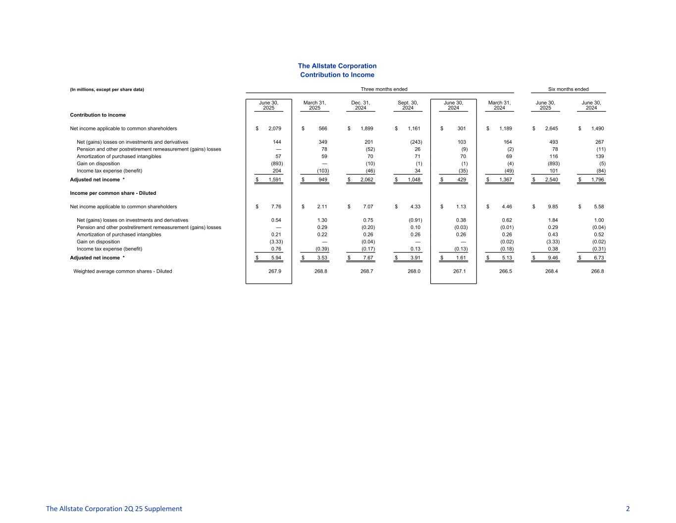 The Allstate Corporation Contribution to Income (In millions, except per share data) Three months ended Six months ended June 30, 2025 March 31, 2025 Dec. 31, 2024 Sept. 30, 2024 June 30, 2024 March 31, 2024 June 30, 2025 June 30, 2024 Contribution to income Net income applicable to common shareholders $ 2,079 $ 566 $ 1,899 $ 1,161 $ 301 $ 1,189 $ 2,645 $ 1,490 Net (gains) losses on investments and derivatives 144 349 201 (243) 103 164 493 267 Pension and other postretirement remeasurement (gains) losses — 78 (52) 26 (9) (2) 78 (11) Amortization of purchased intangibles 57 59 70 71 70 69 116 139 Gain on disposition (893) — (10) (1) (1) (4) (893) (5) Income tax expense (benefit) 204 (103) (46) 34 (35) (49) 101 (84) Adjusted net income * $ 1,591 $ 949 $ 2,062 $ 1,048 $ 429 $ 1,367 $ 2,540 $ 1,796 Income per common share - Diluted Net income applicable to common shareholders $ 7.76 $ 2.11 $ 7.07 $ 4.33 $ 1.13 $ 4.46 $ 9.85 $ 5.58 Net (gains) losses on investments and derivatives 0.54 1.30 0.75 (0.91) 0.38 0.62 1.84 1.00 Pension and other postretirement remeasurement (gains) losses — 0.29 (0.20) 0.10 (0.03) (0.01) 0.29 (0.04) Amortization of purchased intangibles 0.21 0.22 0.26 0.26 0.26 0.26 0.43 0.52 Gain on disposition (3.33) — (0.04) — — (0.02) (3.33) (0.02) Income tax expense (benefit) 0.76 (0.39) (0.17) 0.13 (0.13) (0.18) 0.38 (0.31) Adjusted net income * $ 5.94 $ 3.53 $ 7.67 $ 3.91 $ 1.61 $ 5.13 $ 9.46 $ 6.73 Weighted average common shares - Diluted 267.9 268.8 268.7 268.0 267.1 266.5 268.4 266.8 The Allstate Corporation 2Q 25 Supplement 2