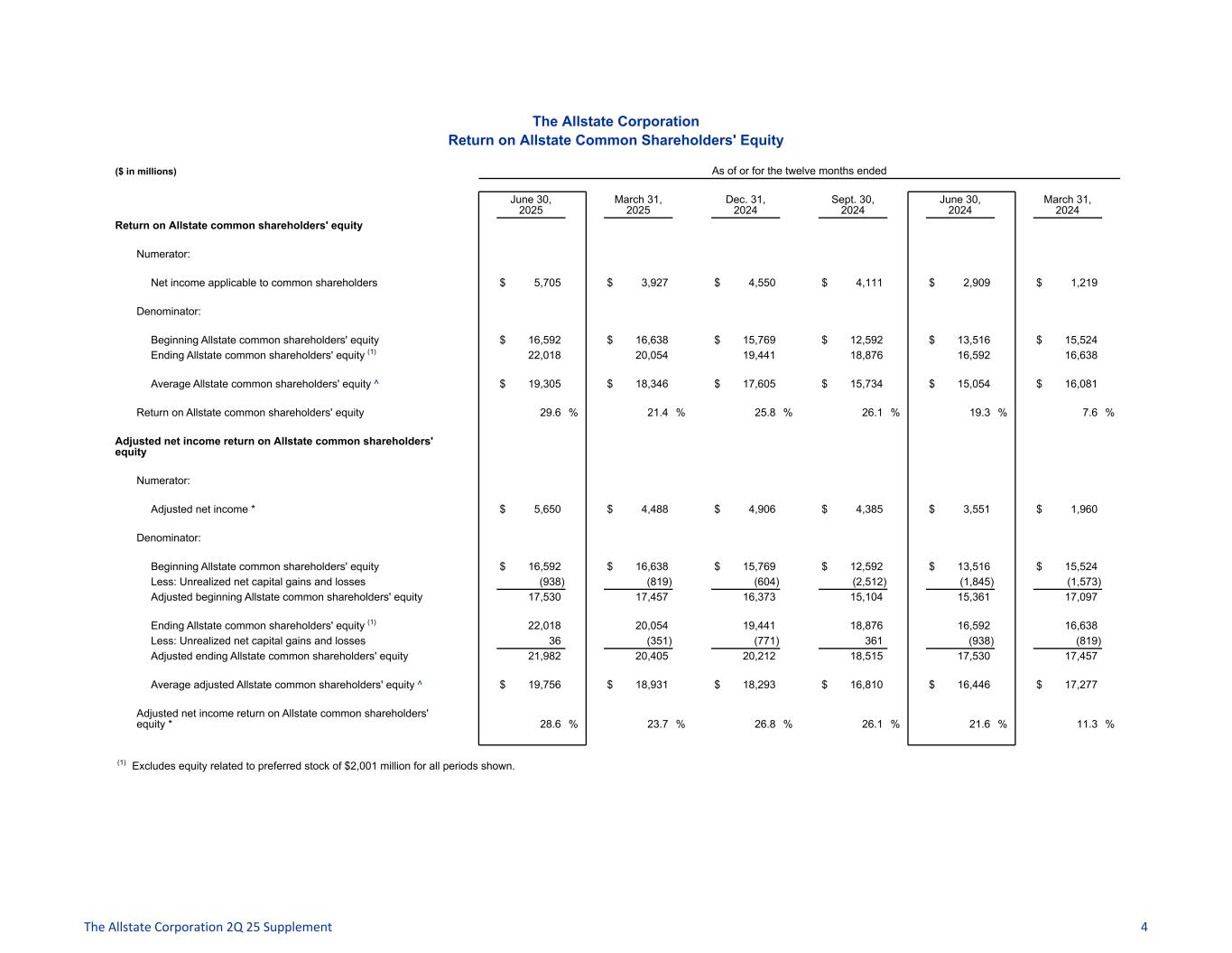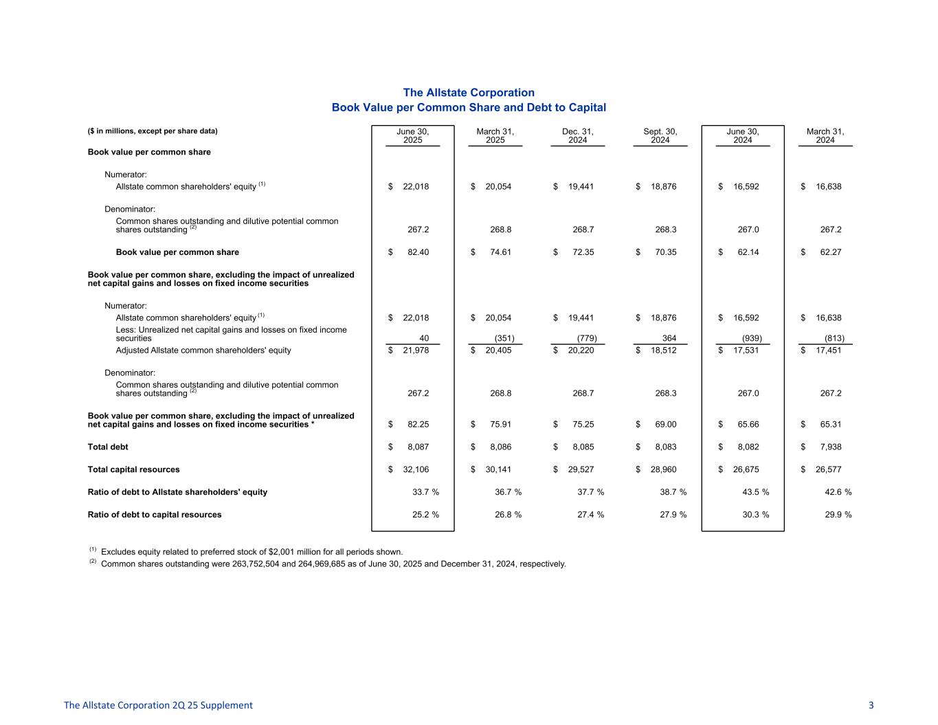 The Allstate Corporation Book Value per Common Share and Debt to Capital ($ in millions, except per share data) June 30, 2025 March 31, 2025 Dec. 31, 2024 Sept. 30, 2024 June 30, 2024 March 31, 2024 Book value per common share Numerator: Allstate common shareholders' equity (1) $ 22,018 $ 20,054 $ 19,441 $ 18,876 $ 16,592 $ 16,638 Denominator: Common shares outstanding and dilutive potential common shares outstanding (2) 267.2 268.8 268.7 268.3 267.0 267.2 Book value per common share $ 82.40 $ 74.61 $ 72.35 $ 70.35 $ 62.14 $ 62.27 Book value per common share, excluding the impact of unrealized net capital gains and losses on fixed income securities Numerator: Allstate common shareholders' equity (1) $ 22,018 $ 20,054 $ 19,441 $ 18,876 $ 16,592 $ 16,638 Less: Unrealized net capital gains and losses on fixed income securities 40 (351) (779) 364 (939) (813) Adjusted Allstate common shareholders' equity $ 21,978 $ 20,405 $ 20,220 $ 18,512 $ 17,531 $ 17,451 Denominator: Common shares outstanding and dilutive potential common shares outstanding (2) 267.2 268.8 268.7 268.3 267.0 267.2 Book value per common share, excluding the impact of unrealized net capital gains and losses on fixed income securities * $ 82.25 $ 75.91 $ 75.25 $ 69.00 $ 65.66 $ 65.31 Total debt $ 8,087 $ 8,086 $ 8,085 $ 8,083 $ 8,082 $ 7,938 Total capital resources $ 32,106 $ 30,141 $ 29,527 $ 28,960 $ 26,675 $ 26,577 Ratio of debt to Allstate shareholders' equity 33.7 % 36.7 % 37.7 % 38.7 % 43.5 % 42.6 % Ratio of debt to capital resources 25.2 % 26.8 % 27.4 % 27.9 % 30.3 % 29.9 % (1) Excludes equity related to preferred stock of $2,001 million for all periods shown. (2) Common shares outstanding were 263,752,504 and 264,969,685 as of June 30, 2025 and December 31, 2024, respectively. The Allstate Corporation 2Q 25 Supplement 3