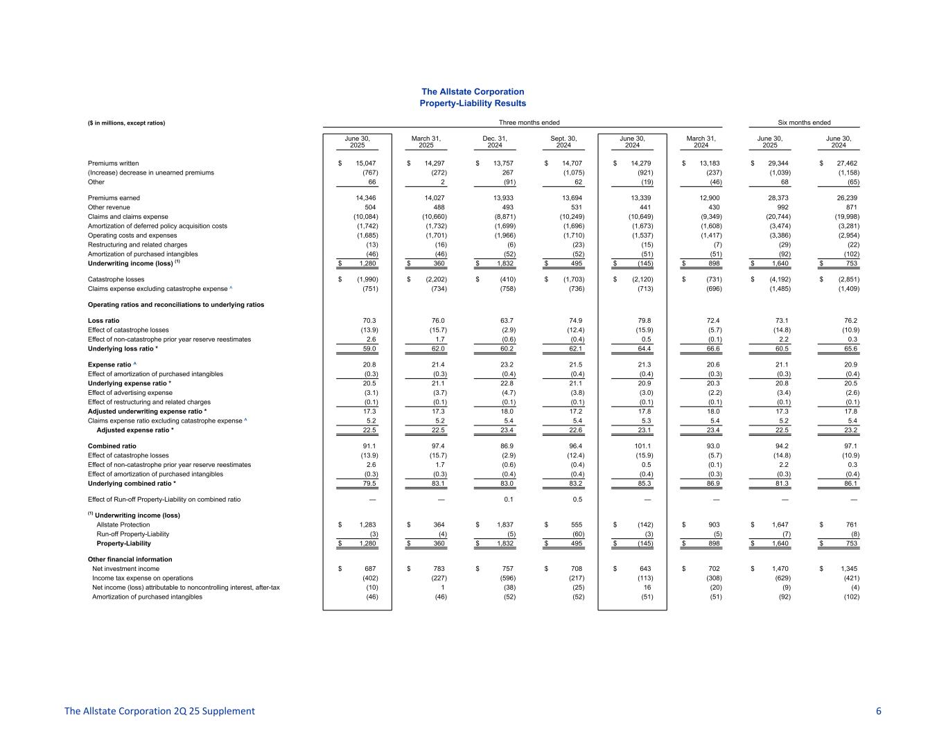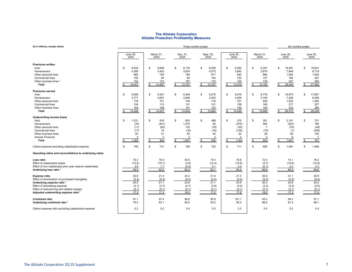 The Allstate Corporation Property-Liability Results ($ in millions, except ratios) Three months ended Six months ended June 30, 2025 March 31, 2025 Dec. 31, 2024 Sept. 30, 2024 June 30, 2024 March 31, 2024 June 30, 2025 June 30, 2024 Premiums written $ 15,047 $ 14,297 $ 13,757 $ 14,707 $ 14,279 $ 13,183 $ 29,344 $ 27,462 (Increase) decrease in unearned premiums (767) (272) 267 (1,075) (921) (237) (1,039) (1,158) Other 66 2 (91) 62 (19) (46) 68 (65) Premiums earned 14,346 14,027 13,933 13,694 13,339 12,900 28,373 26,239 Other revenue 504 488 493 531 441 430 992 871 Claims and claims expense (10,084) (10,660) (8,871) (10,249) (10,649) (9,349) (20,744) (19,998) Amortization of deferred policy acquisition costs (1,742) (1,732) (1,699) (1,696) (1,673) (1,608) (3,474) (3,281) Operating costs and expenses (1,685) (1,701) (1,966) (1,710) (1,537) (1,417) (3,386) (2,954) Restructuring and related charges (13) (16) (6) (23) (15) (7) (29) (22) Amortization of purchased intangibles (46) (46) (52) (52) (51) (51) (92) (102) Underwriting income (loss) (1) $ 1,280 $ 360 $ 1,832 $ 495 $ (145) $ 898 $ 1,640 $ 753 Catastrophe losses $ (1,990) $ (2,202) $ (410) $ (1,703) $ (2,120) $ (731) $ (4,192) $ (2,851) Claims expense excluding catastrophe expense ^ (751) (734) (758) (736) (713) (696) (1,485) (1,409) Operating ratios and reconciliations to underlying ratios Loss ratio 70.3 76.0 63.7 74.9 79.8 72.4 73.1 76.2 Effect of catastrophe losses (13.9) (15.7) (2.9) (12.4) (15.9) (5.7) (14.8) (10.9) Effect of non-catastrophe prior year reserve reestimates 2.6 1.7 (0.6) (0.4) 0.5 (0.1) 2.2 0.3 Underlying loss ratio * 59.0 62.0 60.2 62.1 64.4 66.6 60.5 65.6 Expense ratio ^ 20.8 21.4 23.2 21.5 21.3 20.6 21.1 20.9 Effect of amortization of purchased intangibles (0.3) (0.3) (0.4) (0.4) (0.4) (0.3) (0.3) (0.4) Underlying expense ratio * 20.5 21.1 22.8 21.1 20.9 20.3 20.8 20.5 Effect of advertising expense (3.1) (3.7) (4.7) (3.8) (3.0) (2.2) (3.4) (2.6) Effect of restructuring and related charges (0.1) (0.1) (0.1) (0.1) (0.1) (0.1) (0.1) (0.1) Adjusted underwriting expense ratio * 17.3 17.3 18.0 17.2 17.8 18.0 17.3 17.8 Claims expense ratio excluding catastrophe expense ^ 5.2 5.2 5.4 5.4 5.3 5.4 5.2 5.4 Adjusted expense ratio * 22.5 22.5 23.4 22.6 23.1 23.4 22.5 23.2 Combined ratio 91.1 97.4 86.9 96.4 101.1 93.0 94.2 97.1 Effect of catastrophe losses (13.9) (15.7) (2.9) (12.4) (15.9) (5.7) (14.8) (10.9) Effect of non-catastrophe prior year reserve reestimates 2.6 1.7 (0.6) (0.4) 0.5 (0.1) 2.2 0.3 Effect of amortization of purchased intangibles (0.3) (0.3) (0.4) (0.4) (0.4) (0.3) (0.3) (0.4) Underlying combined ratio * 79.5 83.1 83.0 83.2 85.3 86.9 81.3 86.1 Effect of Run-off Property-Liability on combined ratio — — 0.1 0.5 — — — — (1) Underwriting income (loss) Allstate Protection $ 1,283 $ 364 $ 1,837 $ 555 $ (142) $ 903 $ 1,647 $ 761 Run-off Property-Liability (3) (4) (5) (60) (3) (5) (7) (8) Property-Liability $ 1,280 $ 360 $ 1,832 $ 495 $ (145) $ 898 $ 1,640 $ 753 Other financial information Net investment income $ 687 $ 783 $ 757 $ 708 $ 643 $ 702 $ 1,470 $ 1,345 Income tax expense on operations (402) (227) (596) (217) (113) (308) (629) (421) Net income (loss) attributable to noncontrolling interest, after-tax (10) 1 (38) (25) 16 (20) (9) (4) Amortization of purchased intangibles (46) (46) (52) (52) (51) (51) (92) (102) The Allstate Corporation 2Q 25 Supplement 6