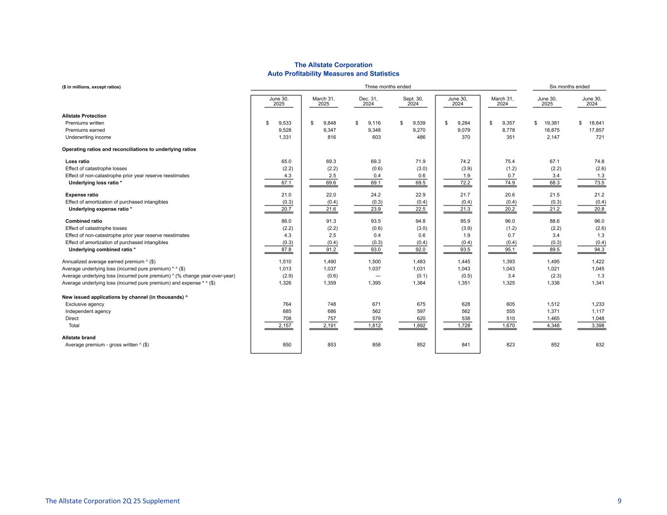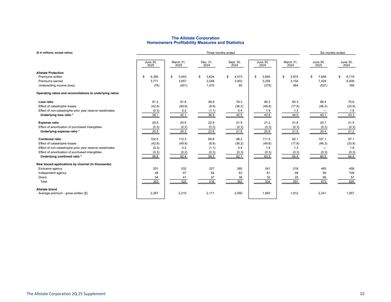 The Allstate Corporation Auto Profitability Measures and Statistics ($ in millions, except ratios) Three months ended Six months ended June 30, 2025 March 31, 2025 Dec. 31, 2024 Sept. 30, 2024 June 30, 2024 March 31, 2024 June 30, 2025 June 30, 2024 Allstate Protection Premiums written $ 9,533 $ 9,848 $ 9,116 $ 9,539 $ 9,284 $ 9,357 $ 19,381 $ 18,641 Premiums earned 9,528 9,347 9,348 9,270 9,079 8,778 18,875 17,857 Underwriting income 1,331 816 603 486 370 351 2,147 721 Operating ratios and reconciliations to underlying ratios Loss ratio 65.0 69.3 69.3 71.9 74.2 75.4 67.1 74.8 Effect of catastrophe losses (2.2) (2.2) (0.6) (3.0) (3.9) (1.2) (2.2) (2.6) Effect of non-catastrophe prior year reserve reestimates 4.3 2.5 0.4 0.6 1.9 0.7 3.4 1.3 Underlying loss ratio * 67.1 69.6 69.1 69.5 72.2 74.9 68.3 73.5 Expense ratio 21.0 22.0 24.2 22.9 21.7 20.6 21.5 21.2 Effect of amortization of purchased intangibles (0.3) (0.4) (0.3) (0.4) (0.4) (0.4) (0.3) (0.4) Underlying expense ratio * 20.7 21.6 23.9 22.5 21.3 20.2 21.2 20.8 Combined ratio 86.0 91.3 93.5 94.8 95.9 96.0 88.6 96.0 Effect of catastrophe losses (2.2) (2.2) (0.6) (3.0) (3.9) (1.2) (2.2) (2.6) Effect of non-catastrophe prior year reserve reestimates 4.3 2.5 0.4 0.6 1.9 0.7 3.4 1.3 Effect of amortization of purchased intangibles (0.3) (0.4) (0.3) (0.4) (0.4) (0.4) (0.3) (0.4) Underlying combined ratio * 87.8 91.2 93.0 92.0 93.5 95.1 89.5 94.3 Annualized average earned premium ^ ($) 1,510 1,490 1,500 1,483 1,445 1,393 1,495 1,422 Average underlying loss (incurred pure premium) * ^ ($) 1,013 1,037 1,037 1,031 1,043 1,043 1,021 1,045 Average underlying loss (incurred pure premium) * (% change year-over-year) (2.9) (0.6) — (0.1) (0.5) 3.4 (2.3) 1.3 Average underlying loss (incurred pure premium) and expense * ^ ($) 1,326 1,359 1,395 1,364 1,351 1,325 1,338 1,341 New issued applications by channel (in thousands) ^ Exclusive agency 764 748 671 675 628 605 1,512 1,233 Independent agency 685 686 562 597 562 555 1,371 1,117 Direct 708 757 579 620 538 510 1,465 1,048 Total 2,157 2,191 1,812 1,892 1,728 1,670 4,348 3,398 Allstate brand Average premium - gross written ^ ($) 850 853 858 852 841 823 852 832 The Allstate Corporation 2Q 25 Supplement 9