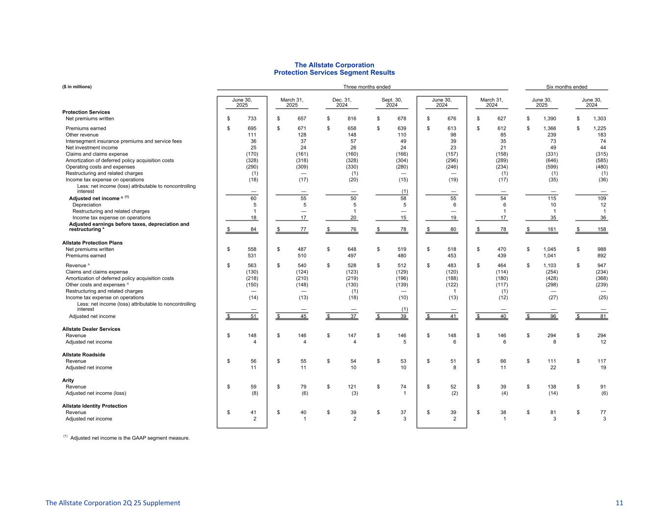 The Allstate Corporation Protection Services Segment Results ($ in millions) Three months ended Six months ended June 30, 2025 March 31, 2025 Dec. 31, 2024 Sept. 30, 2024 June 30, 2024 March 31, 2024 June 30, 2025 June 30, 2024 Protection Services Net premiums written $ 733 $ 657 $ 816 $ 678 $ 676 $ 627 $ 1,390 $ 1,303 Premiums earned $ 695 $ 671 $ 658 $ 639 $ 613 $ 612 $ 1,366 $ 1,225 Other revenue 111 128 148 110 98 85 239 183 Intersegment insurance premiums and service fees 36 37 57 49 39 35 73 74 Net investment income 25 24 26 24 23 21 49 44 Claims and claims expense (170) (161) (160) (166) (157) (158) (331) (315) Amortization of deferred policy acquisition costs (328) (318) (328) (304) (296) (289) (646) (585) Operating costs and expenses (290) (309) (330) (280) (246) (234) (599) (480) Restructuring and related charges (1) — (1) — — (1) (1) (1) Income tax expense on operations (18) (17) (20) (15) (19) (17) (35) (36) Less: net income (loss) attributable to noncontrolling interest — — — (1) — — — — Adjusted net income ^ (1) 60 55 50 58 55 54 115 109 Depreciation 5 5 5 5 6 6 10 12 Restructuring and related charges 1 — 1 — — 1 1 1 Income tax expense on operations 18 17 20 15 19 17 35 36 Adjusted earnings before taxes, depreciation and restructuring * $ 84 $ 77 $ 76 $ 78 $ 80 $ 78 $ 161 $ 158 Allstate Protection Plans Net premiums written $ 558 $ 487 $ 648 $ 519 $ 518 $ 470 $ 1,045 $ 988 Premiums earned 531 510 497 480 453 439 1,041 892 Revenue ^ $ 563 $ 540 $ 528 $ 512 $ 483 $ 464 $ 1,103 $ 947 Claims and claims expense (130) (124) (123) (129) (120) (114) (254) (234) Amortization of deferred policy acquisition costs (218) (210) (219) (196) (188) (180) (428) (368) Other costs and expenses ^ (150) (148) (130) (139) (122) (117) (298) (239) Restructuring and related charges — — (1) — 1 (1) — — Income tax expense on operations (14) (13) (18) (10) (13) (12) (27) (25) Less: net income (loss) attributable to noncontrolling interest — — — (1) — — — — Adjusted net income $ 51 $ 45 $ 37 $ 39 $ 41 $ 40 $ 96 $ 81 Allstate Dealer Services Revenue $ 148 $ 146 $ 147 $ 146 $ 148 $ 146 $ 294 $ 294 Adjusted net income 4 4 4 5 6 6 8 12 Allstate Roadside Revenue $ 56 $ 55 $ 54 $ 53 $ 51 $ 66 $ 111 $ 117 Adjusted net income 11 11 10 10 8 11 22 19 Arity Revenue $ 59 $ 79 $ 121 $ 74 $ 52 $ 39 $ 138 $ 91 Adjusted net income (loss) (8) (6) (3) 1 (2) (4) (14) (6) Allstate Identity Protection Revenue $ 41 $ 40 $ 39 $ 37 $ 39 $ 38 $ 81 $ 77 Adjusted net income 2 1 2 3 2 1 3 3 (1) Adjusted net income is the GAAP segment measure. The Allstate Corporation 2Q 25 Supplement 11