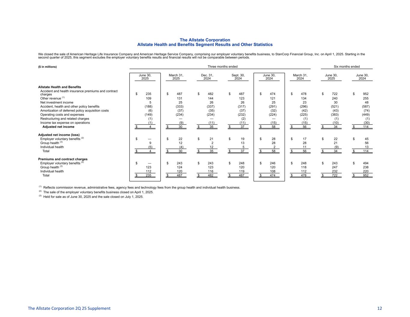 The Allstate Corporation Allstate Health and Benefits Segment Results and Other Statistics We closed the sale of American Heritage Life Insurance Company and American Heritage Service Company, comprising our employer voluntary benefits business, to StanCorp Financial Group, Inc. on April 1, 2025. Starting in the second quarter of 2025, this segment excludes the employer voluntary benefits results and financial results will not be comparable between periods. ($ in millions) Three months ended Six months ended June 30, 2025 March 31, 2025 Dec. 31, 2024 Sept. 30, 2024 June 30, 2024 March 31, 2024 June 30, 2025 June 30, 2024 Allstate Health and Benefits Accident and health insurance premiums and contract charges $ 235 $ 487 $ 482 $ 487 $ 474 $ 478 $ 722 $ 952 Other revenue (1) 109 131 144 123 121 134 240 255 Net investment income 5 25 26 26 25 23 30 48 Accident, health and other policy benefits (188) (333) (337) (317) (291) (296) (521) (587) Amortization of deferred policy acquisition costs (6) (37) (35) (37) (32) (42) (43) (74) Operating costs and expenses (149) (234) (234) (232) (224) (225) (383) (449) Restructuring and related charges (1) — — (2) — (1) (1) (1) Income tax expense on operations (1) (9) (11) (11) (15) (15) (10) (30) Adjusted net income $ 4 $ 30 $ 35 $ 37 $ 58 $ 56 $ 34 $ 114 Adjusted net income (loss) Employer voluntary benefits (2) $ — $ 22 $ 21 $ 19 $ 28 $ 17 $ 22 $ 45 Group health (3) 9 12 2 13 28 28 21 56 Individual health (5) (4) 12 5 2 11 (9) 13 Total $ 4 $ 30 $ 35 $ 37 $ 58 $ 56 $ 34 $ 114 Premiums and contract charges Employer voluntary benefits (2) $ — $ 243 $ 243 $ 248 $ 246 $ 248 $ 243 $ 494 Group health (3) 123 124 123 120 120 118 247 238 Individual health 112 120 116 119 108 112 232 220 Total $ 235 $ 487 $ 482 $ 487 $ 474 $ 478 $ 722 $ 952 (1) Reflects commission revenue, administrative fees, agency fees and technology fees from the group health and individual health business. (2) The sale of the employer voluntary benefits business closed on April 1, 2025. (3) Held for sale as of June 30, 2025 and the sale closed on July 1, 2025. The Allstate Corporation 2Q 25 Supplement 12